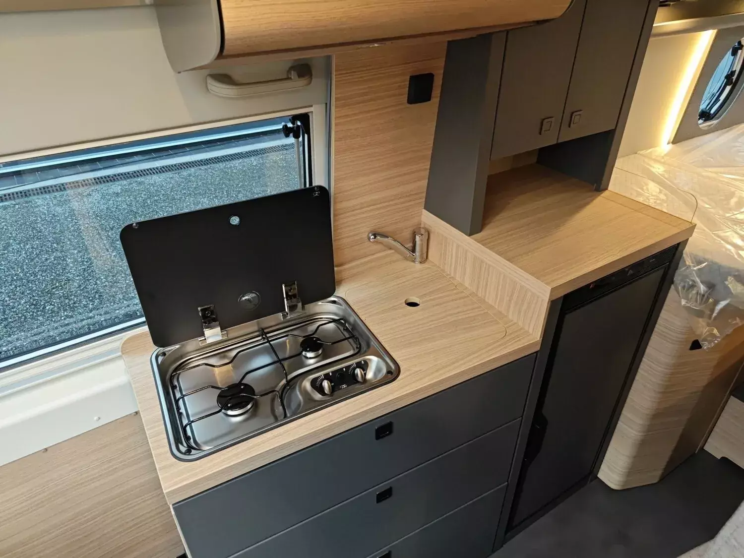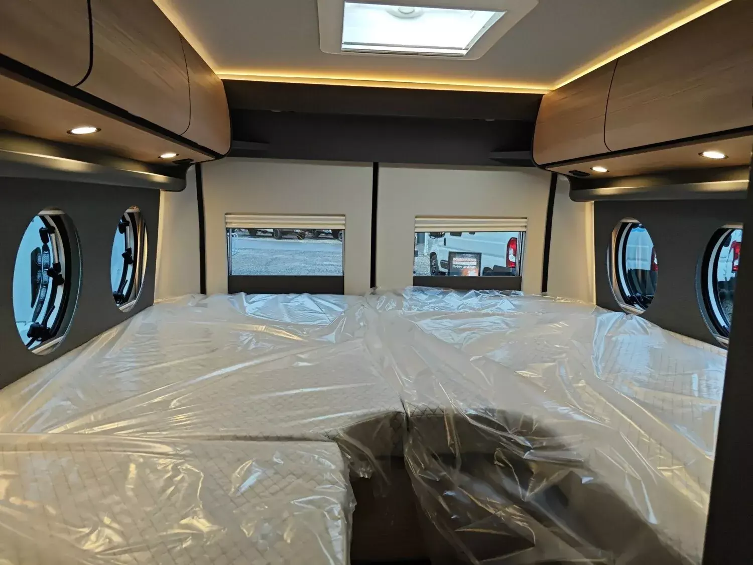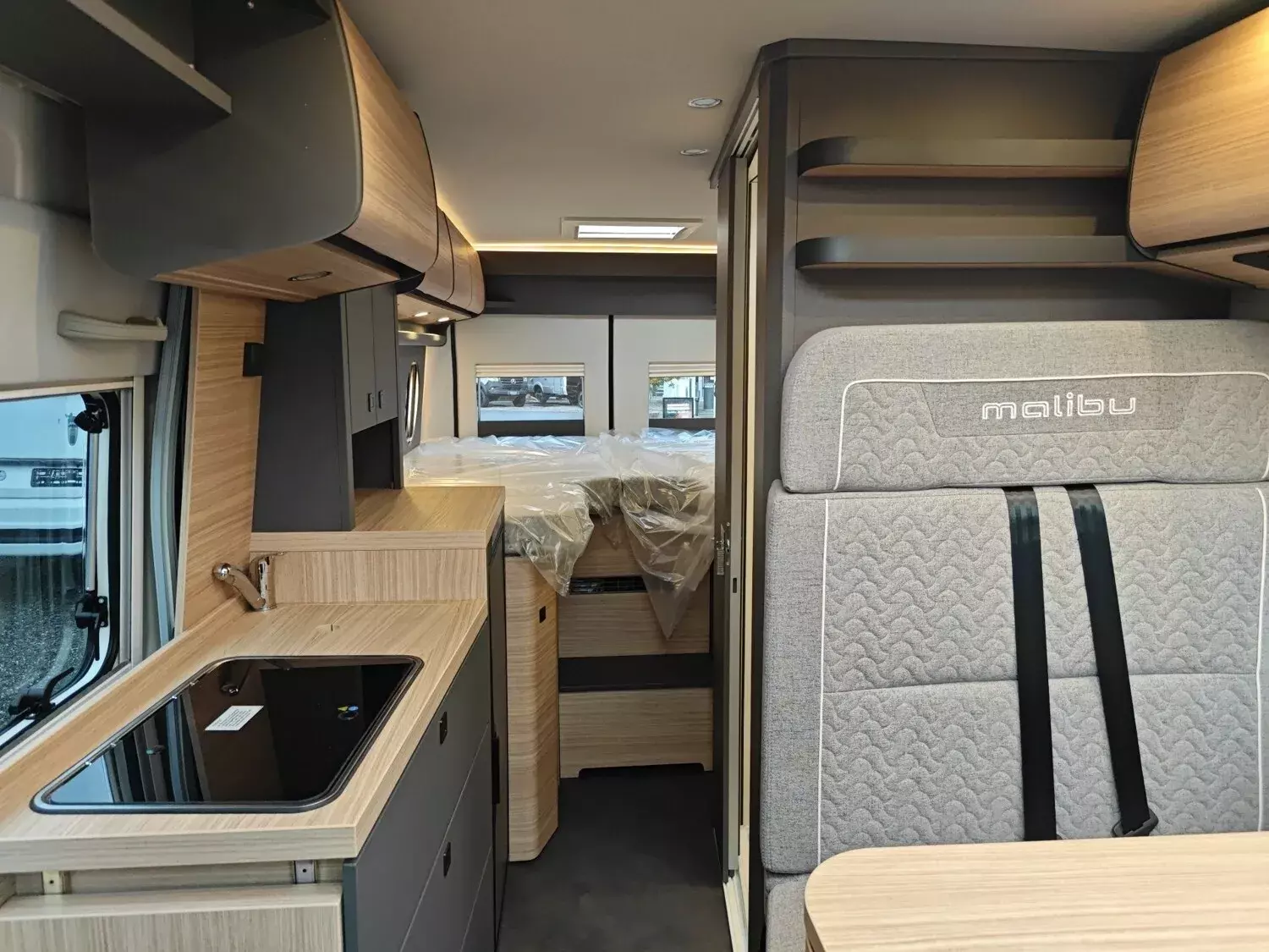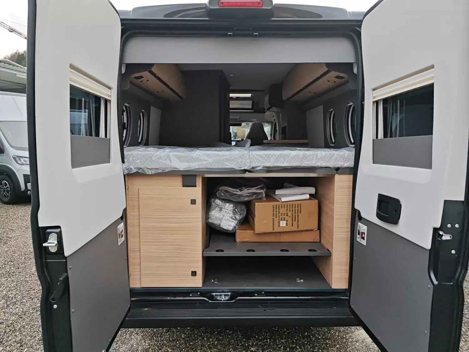 - Aufbau-Paket (Dachinnenverkleidung mit Mikrofaser-Klimabelag, Upgrade Küchencenter, Qualitäts-Kaltschaummatratze im Heckbett, Truma CP Plus digitales Bedienpanel, Verzurrsystem Gepäckraum, Abwassertank in Gehäuse eingefasst und isoliert)