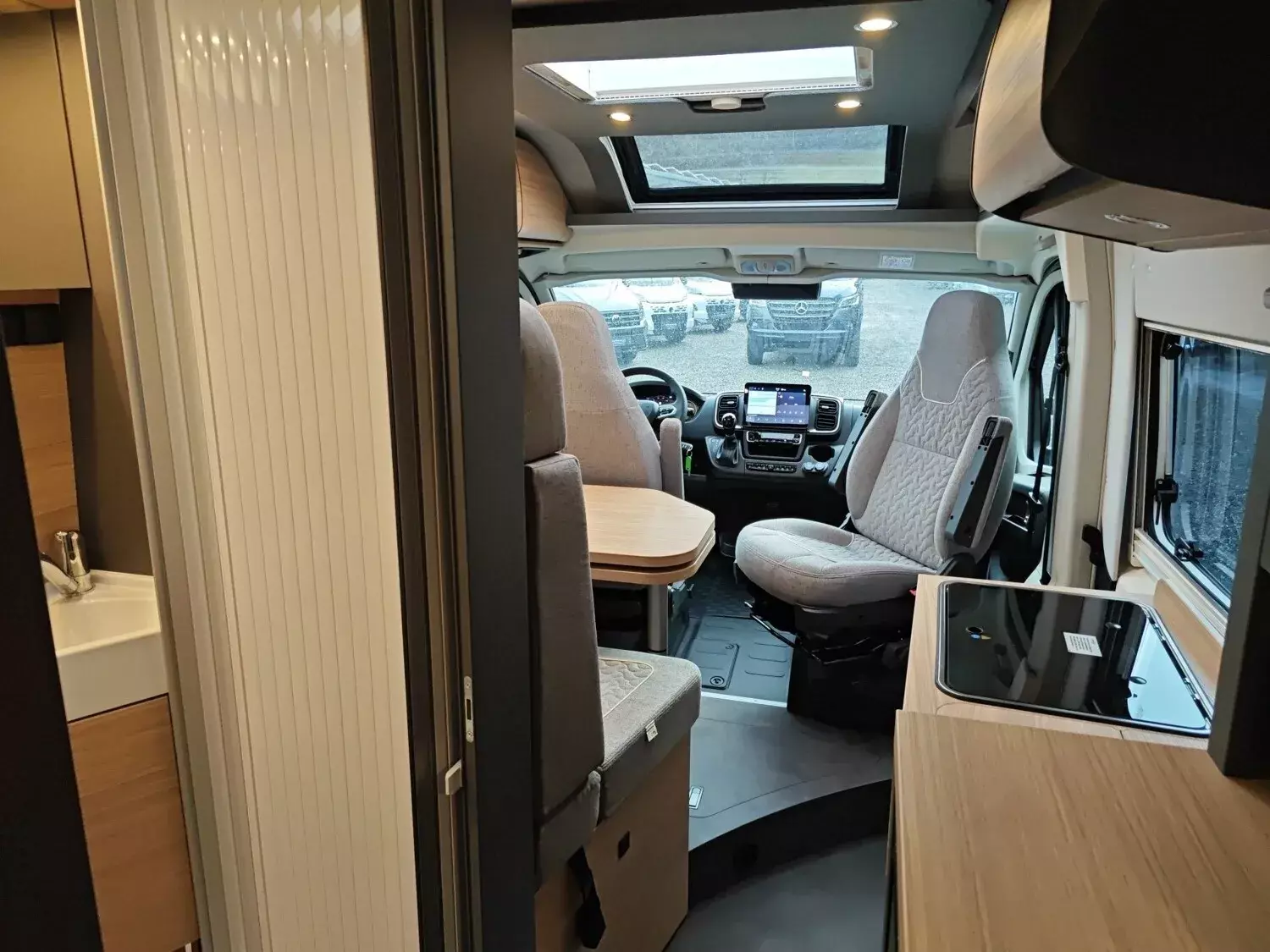 - Chassis-Paket (Einparkhilfe mit Sensoren im Heck, Kraftstofftank 90 Liter, Ladebooster, Fahrerhausverdunklungssystem an Front- und Seitenscheiben, Radiovorbereitung mit Dachantenne und DAB+, Lautsprecher (4x), Beifahrersitz höhenverstellbar, Pilotensitze in Wohnraumstoff bezogen inkl. gepolsterten Armlehnen, Fliegenschutzgitter hinter Schiebetür, Außenspiegel elektrisch verstell- und beheizbar, Elektrisch anklappbare Außenspiegel, Scheinwerferrahmen in schwarz, Multifunktionslenkrad (Radiofernbedienung über Steuertasten))