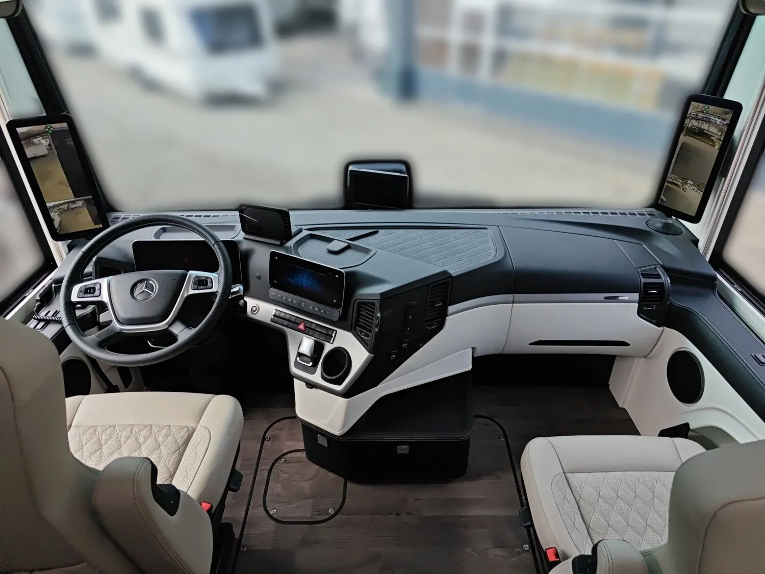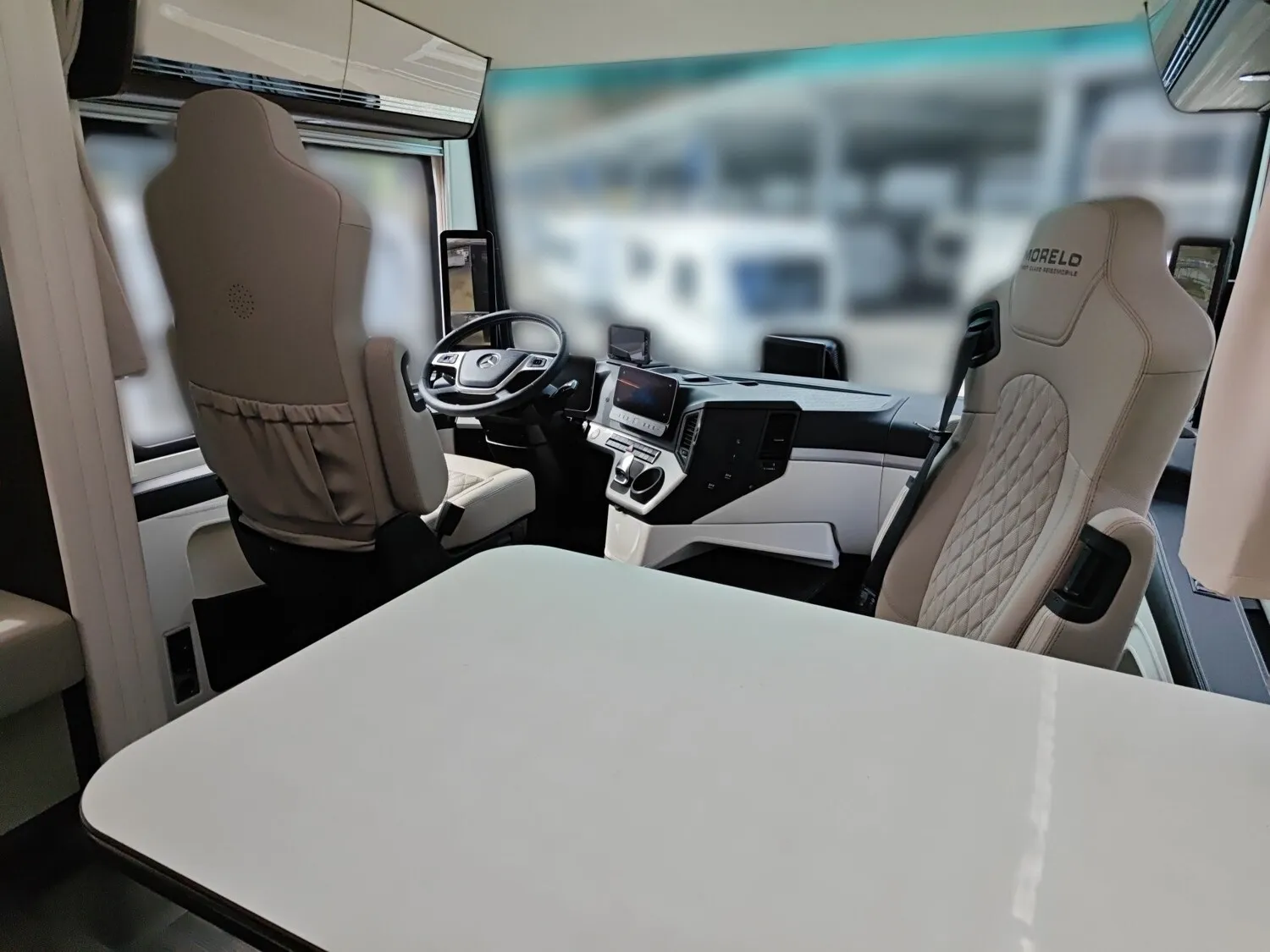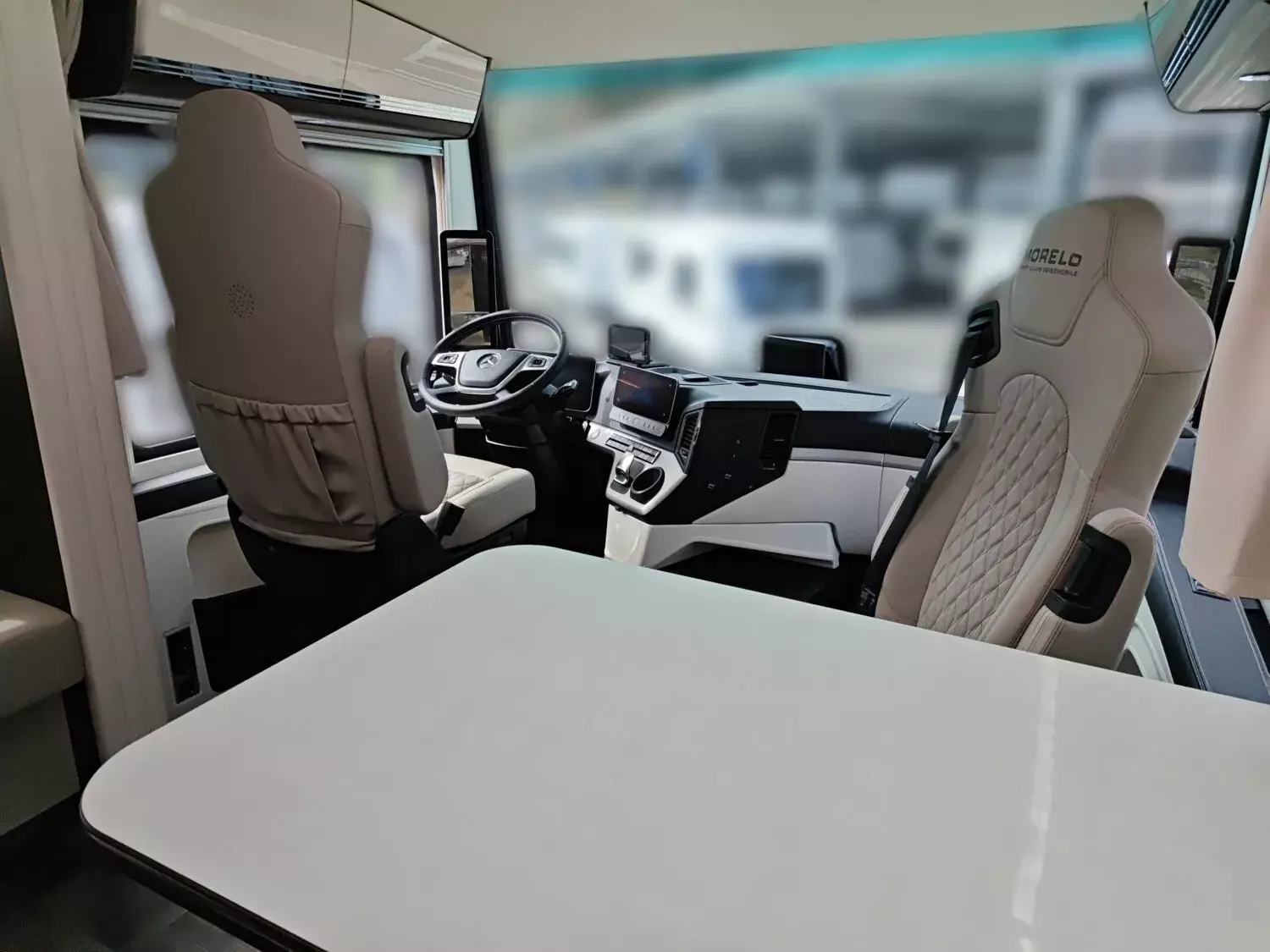 - Pilotensitze in ROYAL Polsterung, luftgefedert, drehbar, mit Lendenwirbelstütze, Armlehnen, Sitzheizung, Belüftung und integrierten Gurtsystem