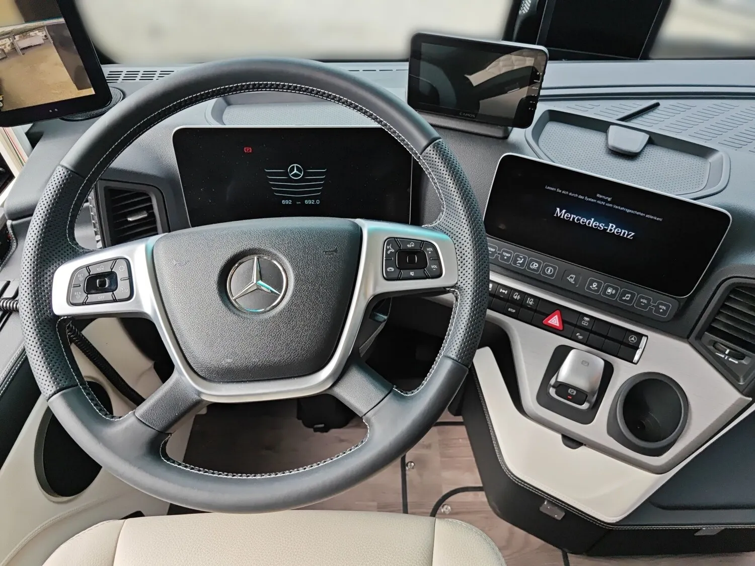 - Fahr-Sicherheitspaket Actros: Active Drive Assistent, Abstandshalteassistent, Abbiege-Assistent, RDK