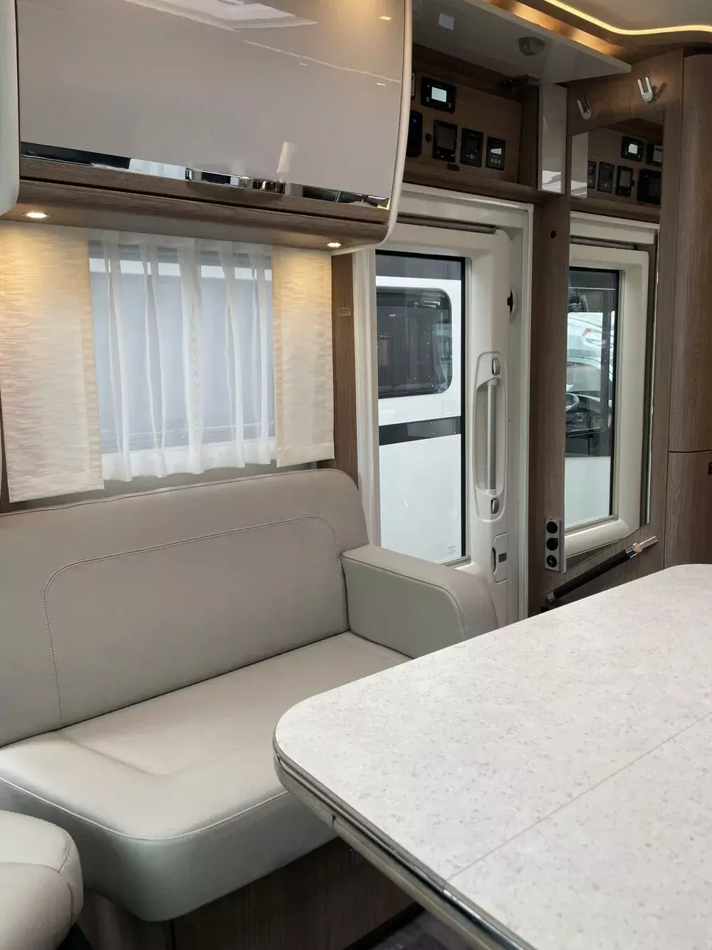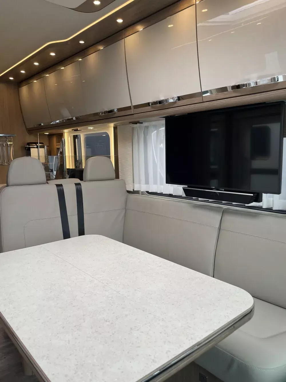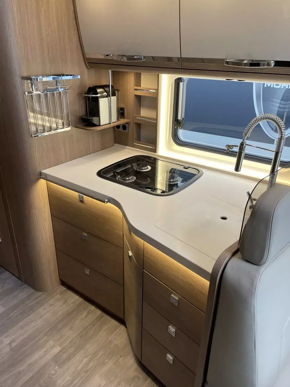 - Wohnwelt NOVEL: zum Wohnraum geöffnete Sitzbank, Küchenarbeitsplatte in Mineralwerkstoff, Doppelspülbecken und großzügiger Arbeitsfläche, Vollauszüge im Küchenunterschrank, Nespressomaschine und 230 Volt Steckdose und Kapselhalter