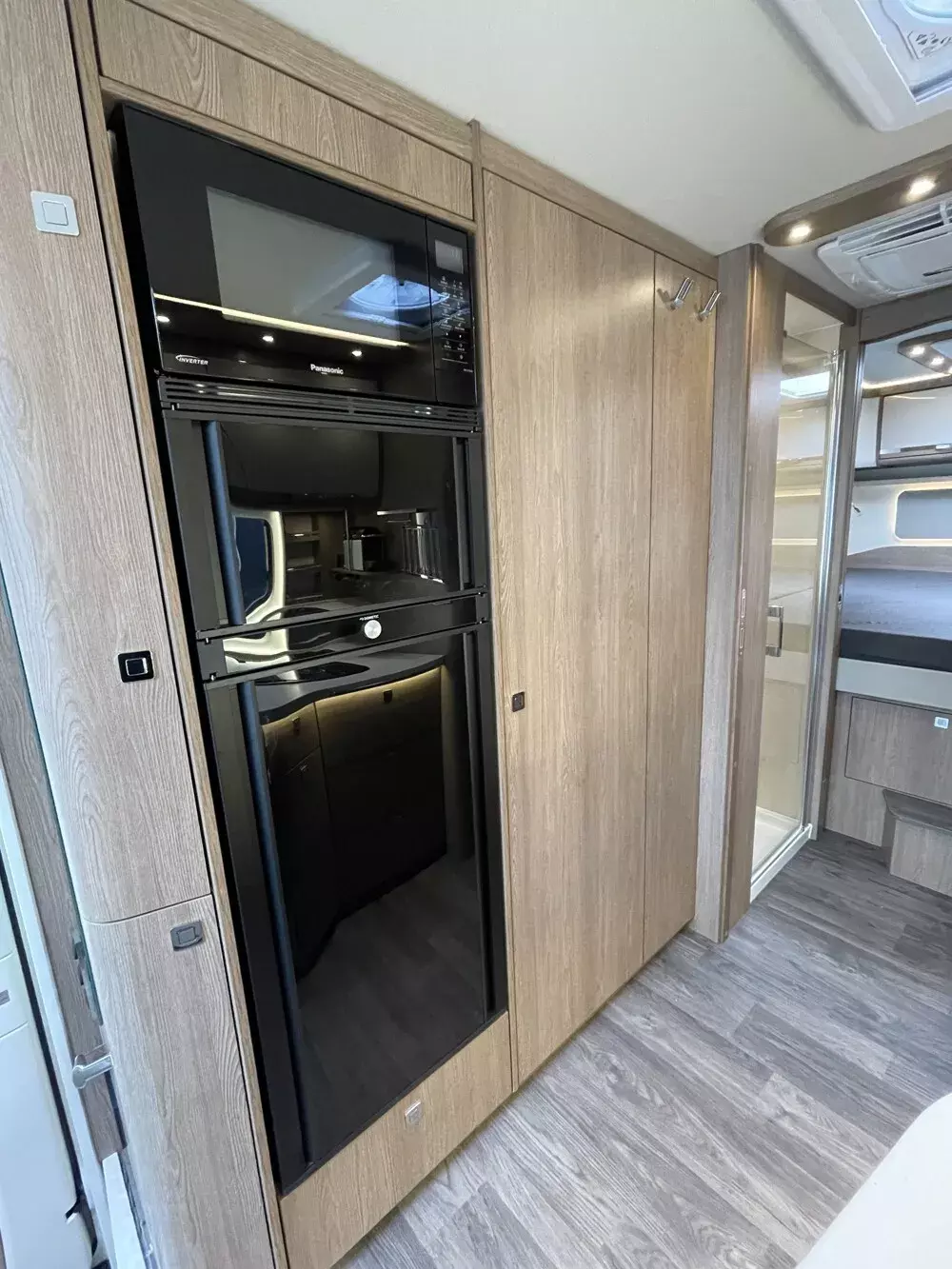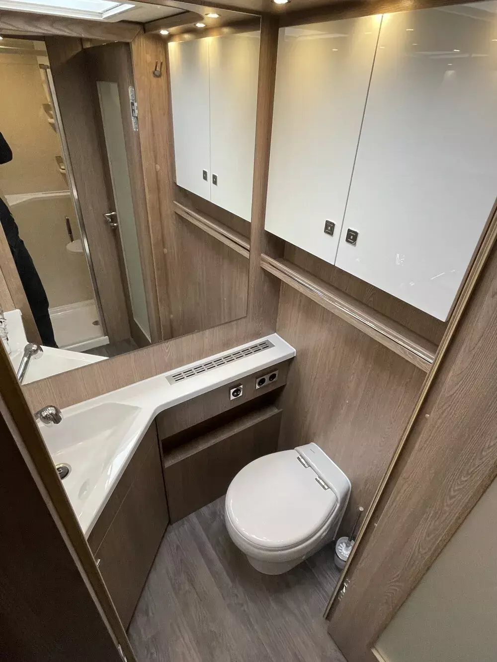 - Dach-Klimagerät im Bad oder im Flur zwischen Dusche und Bad mit Infrarot-Fernbedienung (Fahrzeuggesamthöhe + 130 mm), Betrieb nur über Netzanschluss