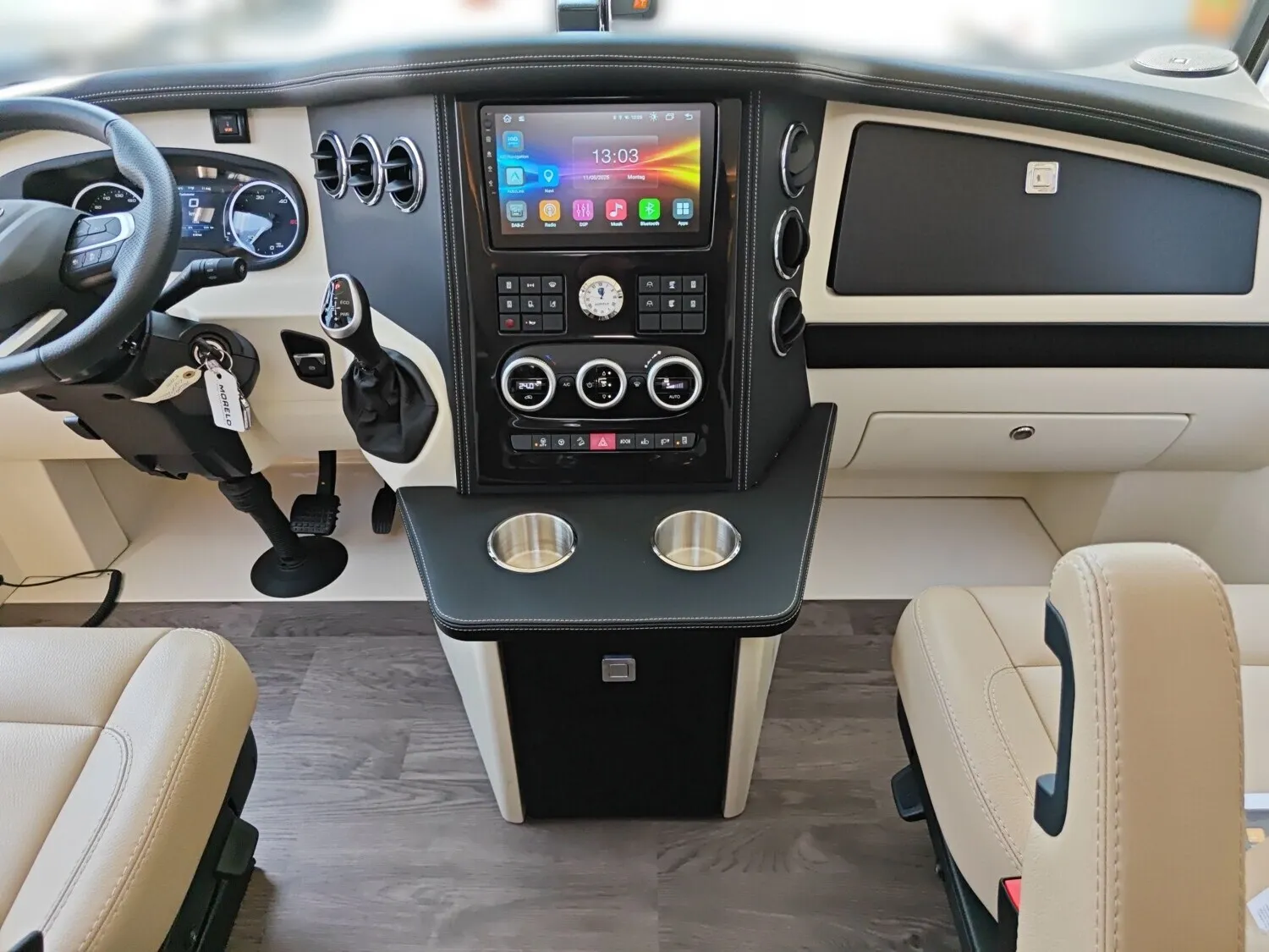 - 10" Navigationssystem, Lenkradfernbedienung, Rückfahrkamera, integriertem DAB+ Radio, Freisprecheinrichtung, und Sound-System Fahrerhaus