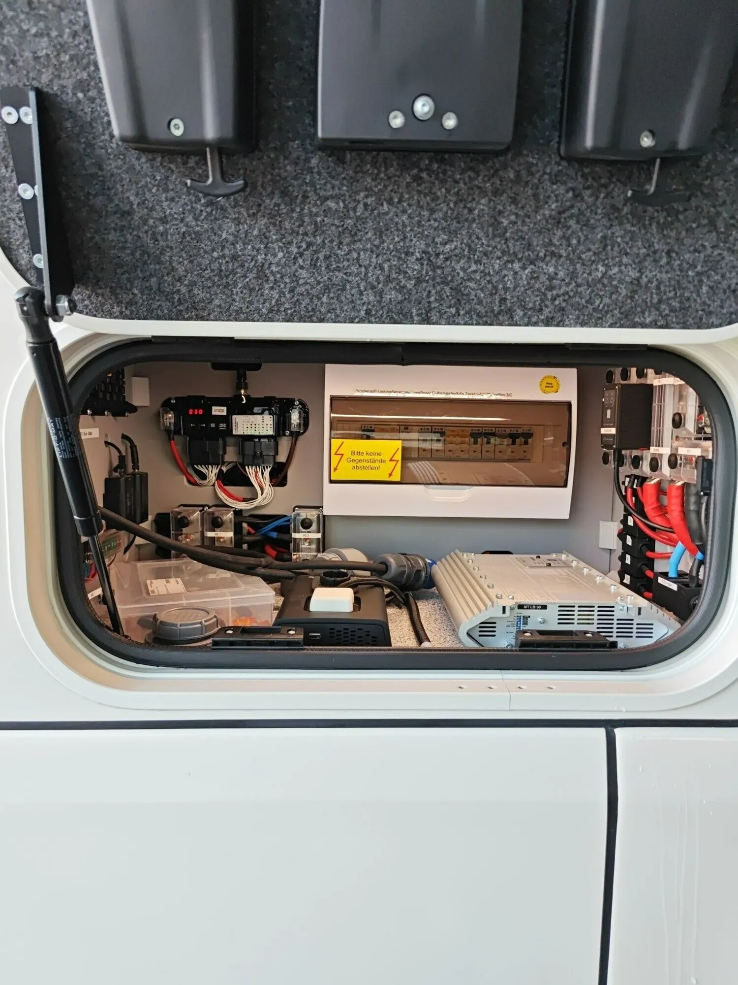 - Elektro-Paket "Energie Lithium-Power" (statt Serie) Lithium Batterie 340AH Kombi-Ladegerät 1 Wechselrichter 3.000Watt / 120 A , Batterieschutz, 230V Steckdose in Garage