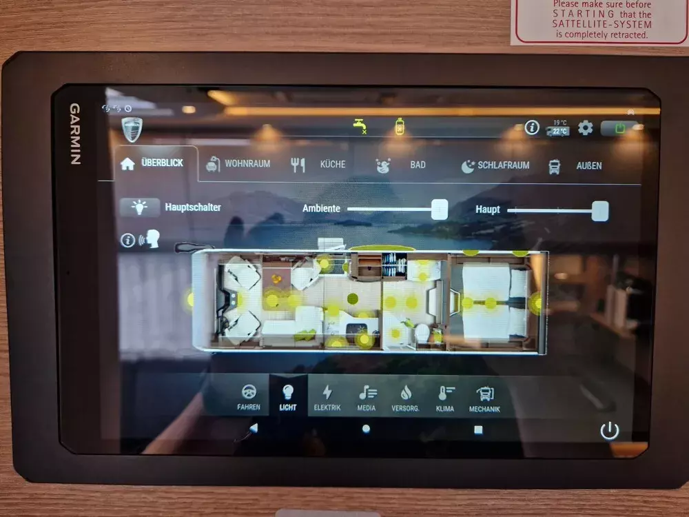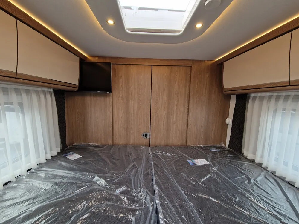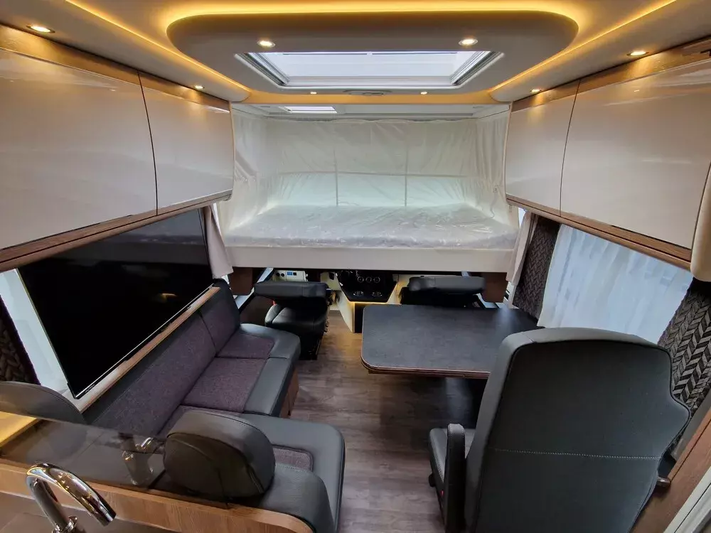 - TV Pakete mit LED Flachbildschirm (elektrisch absenkbarer 39" TV im Dinettenoberschrank (Beifahrerseite) mit Gläsern und 27" TV im Schlafraum, Satelliten-TV-Anlage Oyster V mit 85 cm Spiegel, vollautomatische Ausrichtung und Mehrteilnehmer-Ausstattung durch TWIN-LNB (Fahrzeuggesamthöhe + ca. 80 mm); LED Flachbildschirm mit Smart TV Funktion)