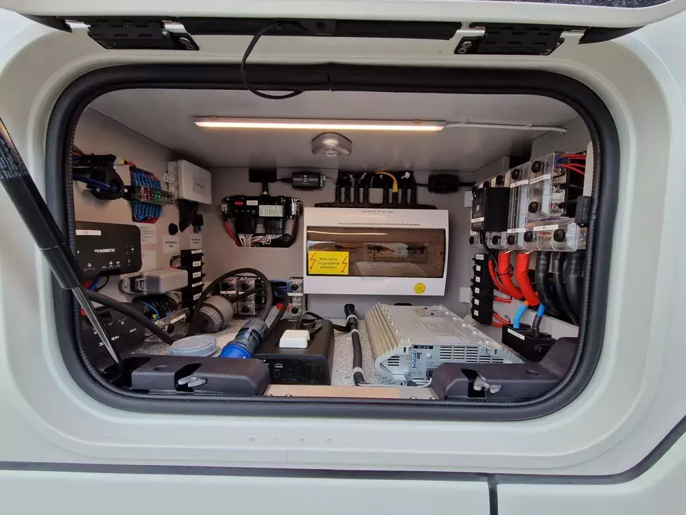 - Elektro-Paket ("Energie Lithium-Power" (statt Serie) Lithium-Eisenphosphat-Batterie 1 x 340 Ah (Entnahmemenge 100 % = 340 Ah) Kombi-Ladegerät / Wechselrichter 3.000 Watt, bis 120 A Ladeleistung, mit Netzstärkevorwahl / Netzmangelausgleich (Power-Sharing), vollautomatischer Batterieschutz der Spitzenklasse, 10" Premium-Controlpanel (nur Daily))