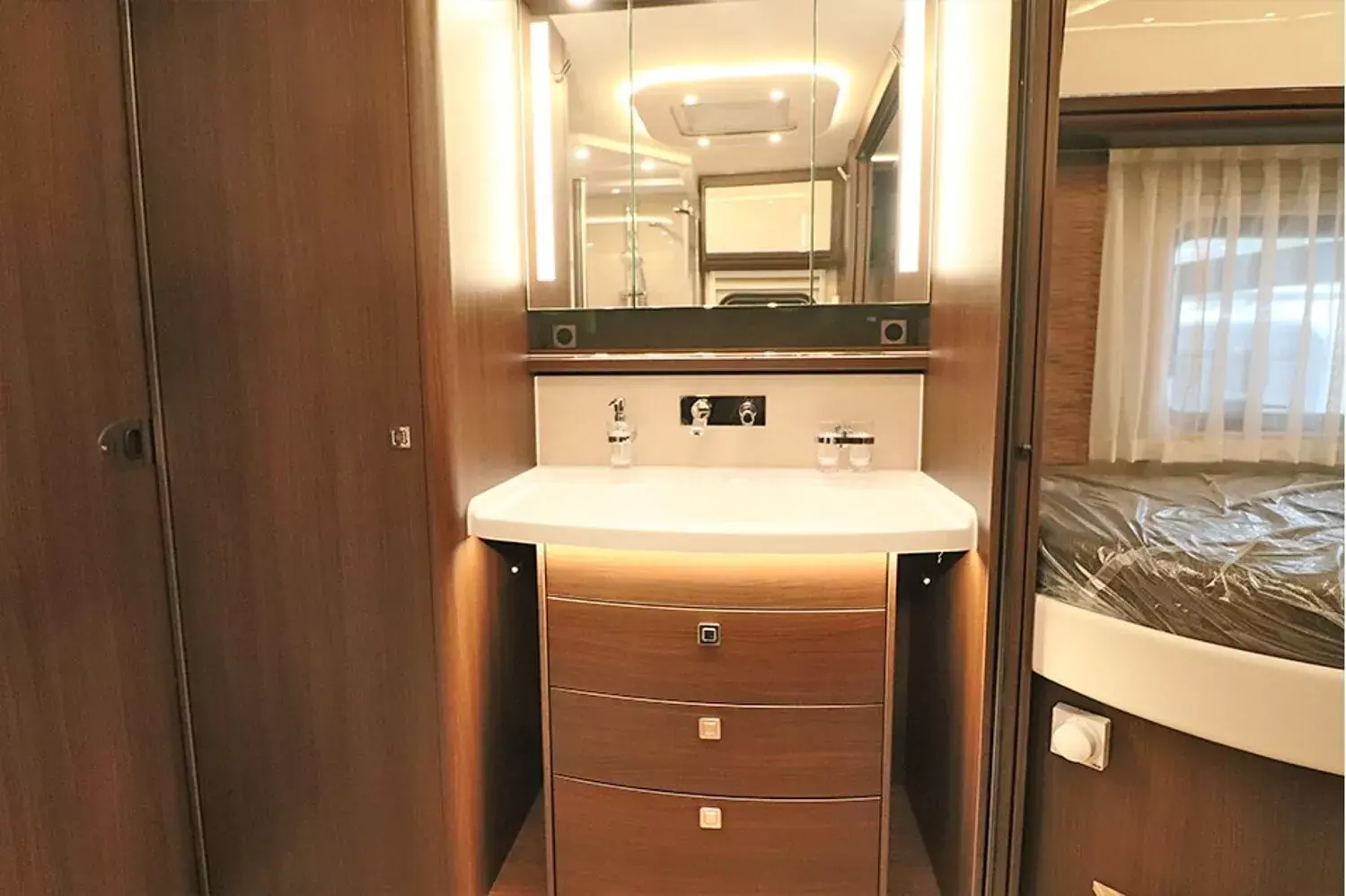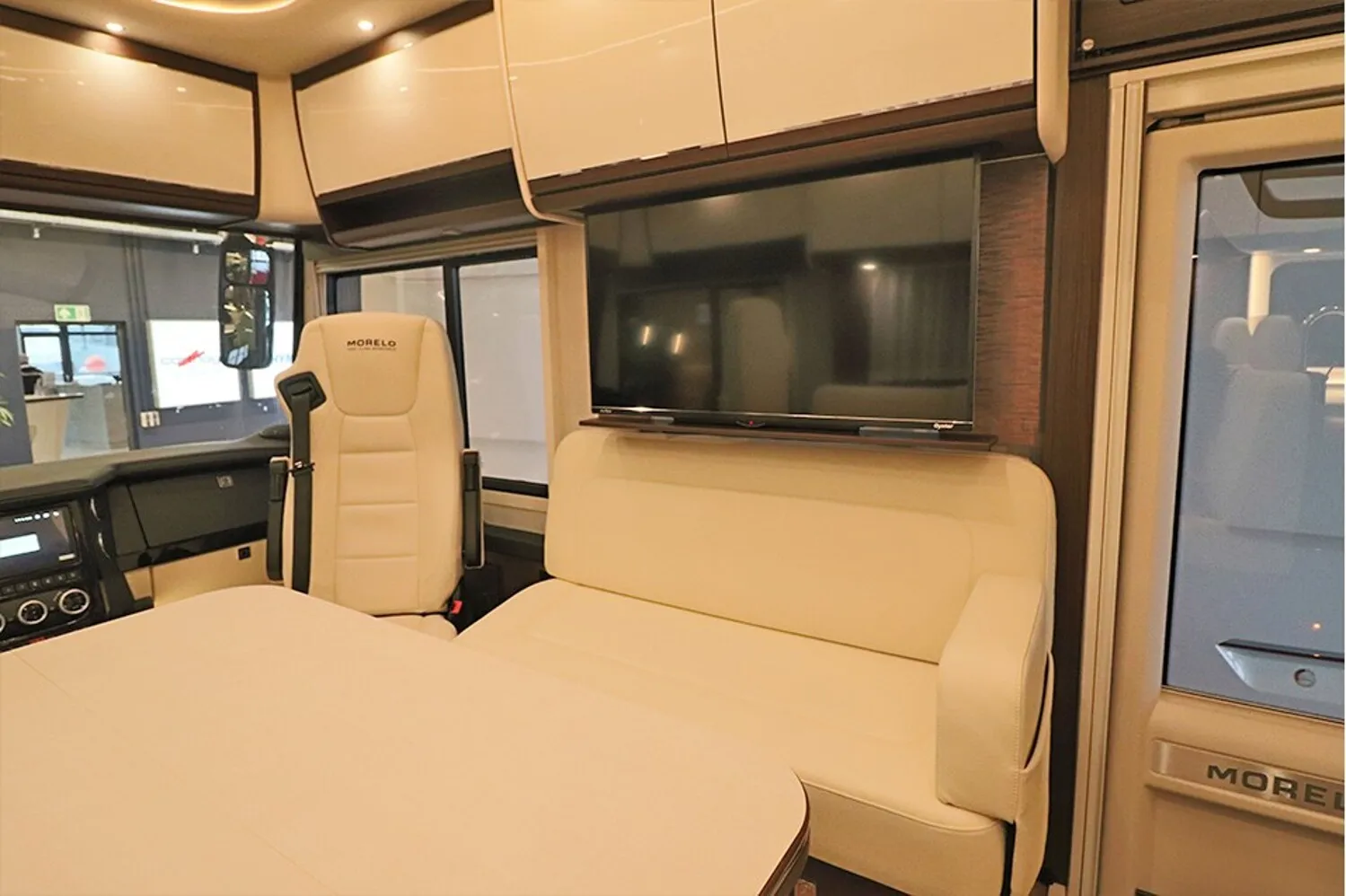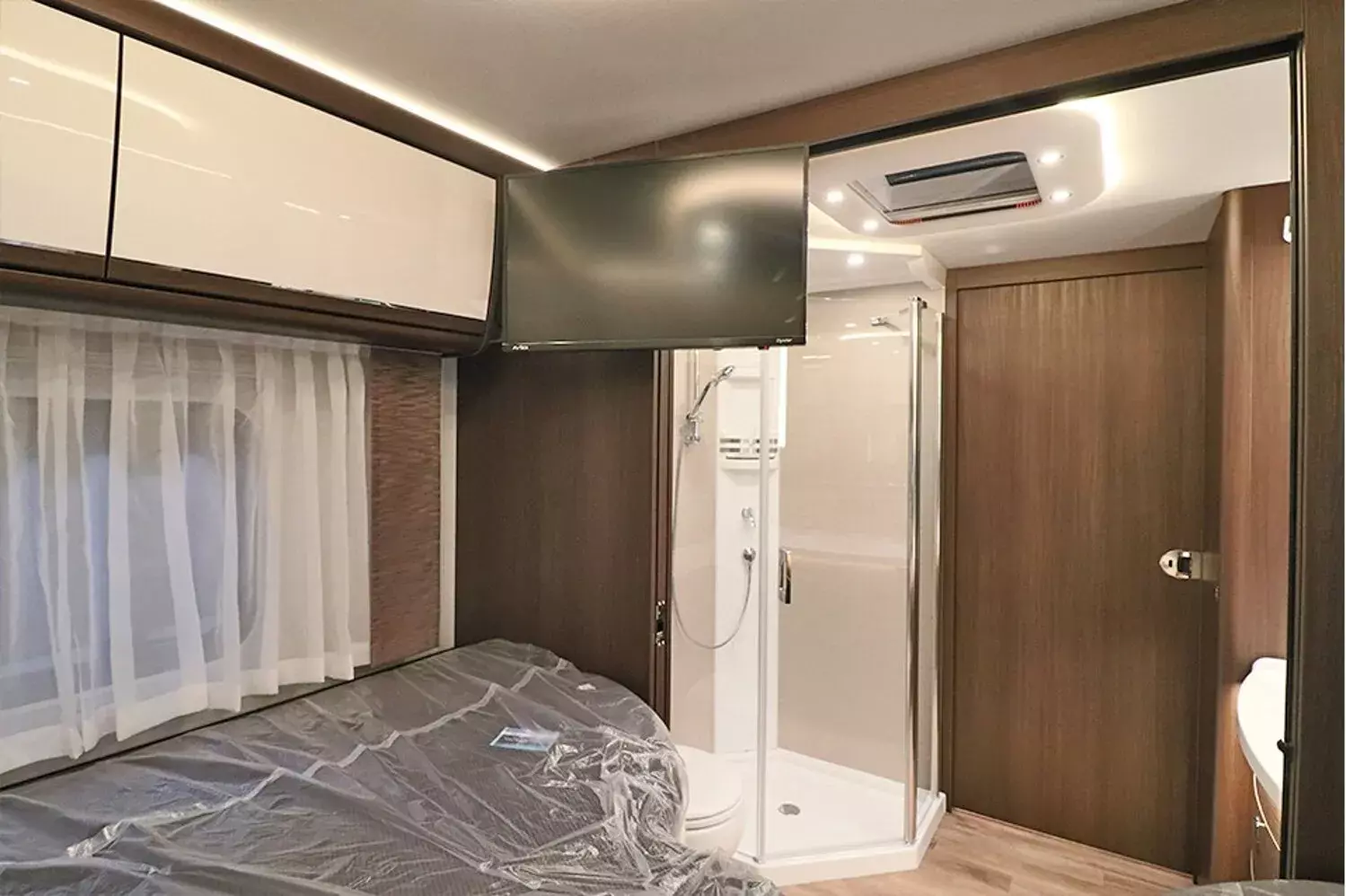 - 39" TV im Vitrinenoberschrank (Beifahrerseite) 27" TV im Schlafraum