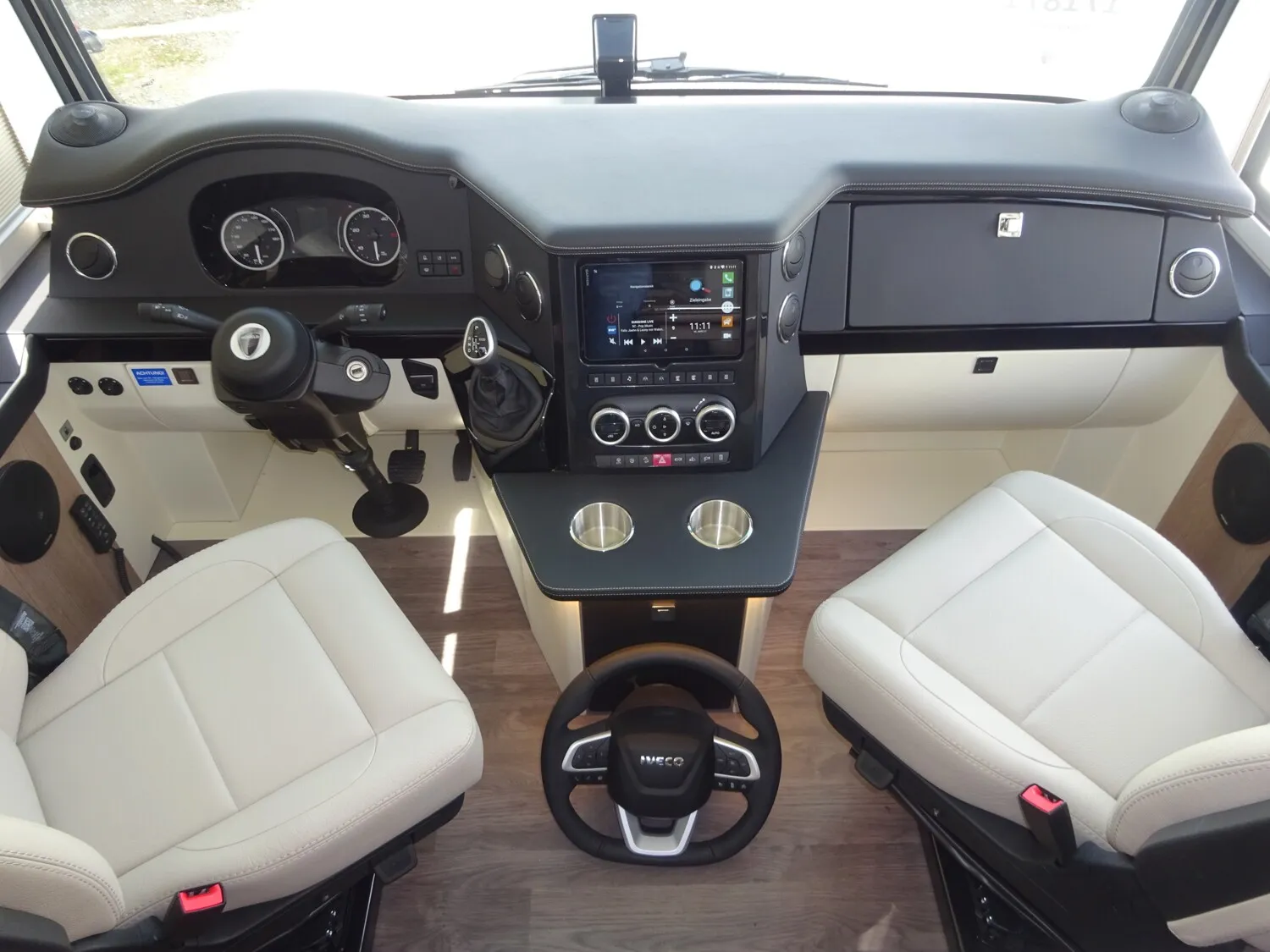 - » Chassis-Paket IVECO, bestehend aus: Motorvariante C 21, 152 kW / 207 PS, ZF 8-Gang Wandlergetriebe, Lederlenkrad mit Multifunktionstasten (nicht abnehmbar), Elektrische und technische Vorbereitung für Anhängerkupplung, Differenzialsperre für Hinterachse.