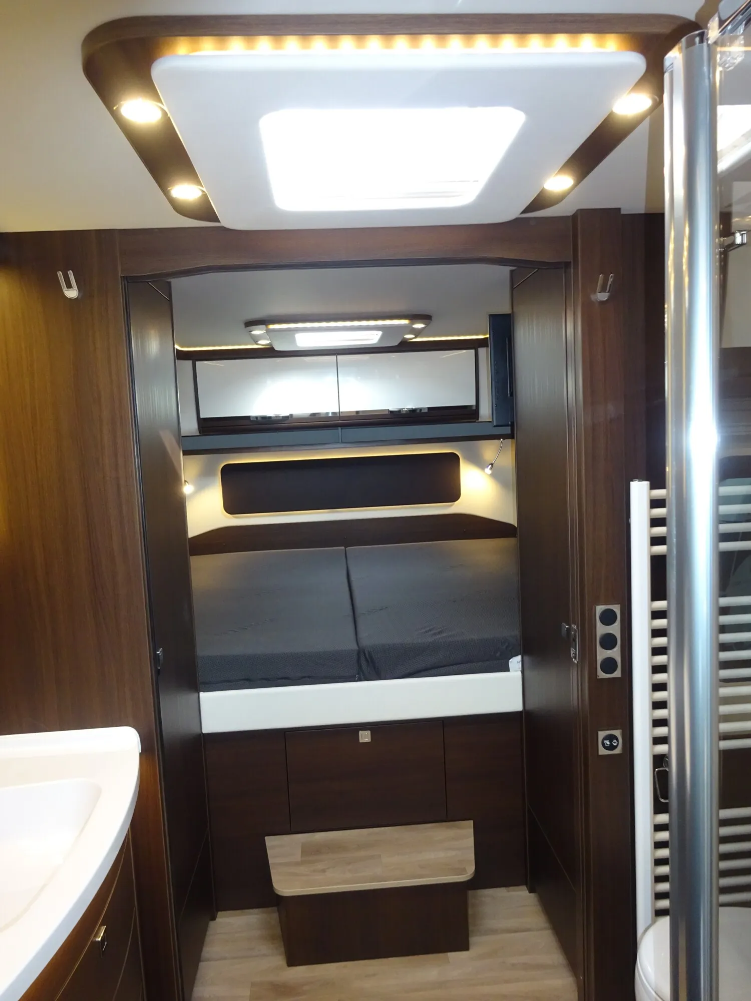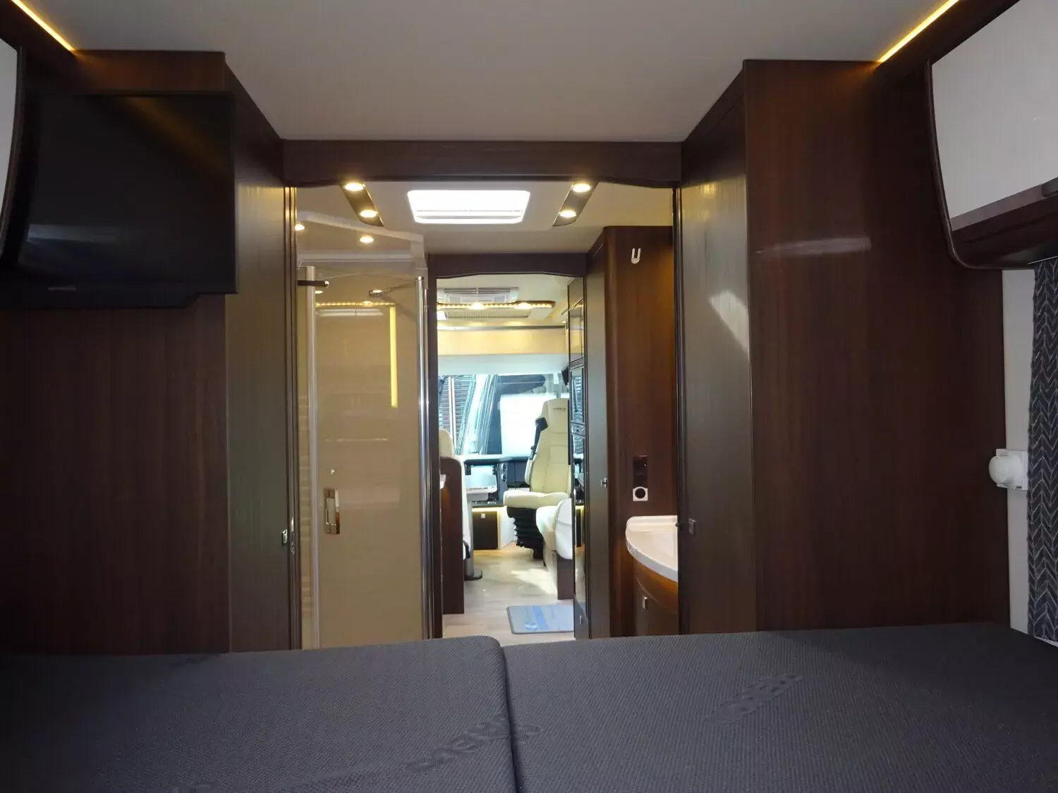 - » Oyster 5 TWIN Satanlage mit 27 TV unterhalb Vitrine im Eingangsbereich mit Soundbar und 27'' TV im Schlafraum