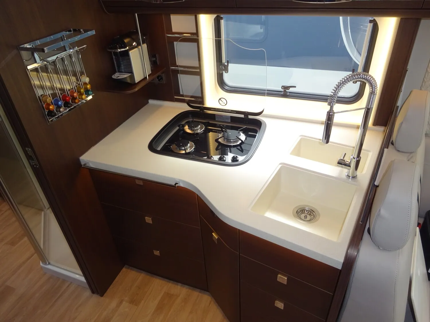 - » Wohnwelt NOVEL: zum Wohnraum geöffnete Sitzbank, Küchenarbeitsplatte in Mineralwerkstoff "Creme" mit Doppelspülbecken und großzügiger Arbeitsfläche, Vollauszüge im Küchenunterschrank, Nespressomaschine, Kapselhalter und 230 Volt Steckdose