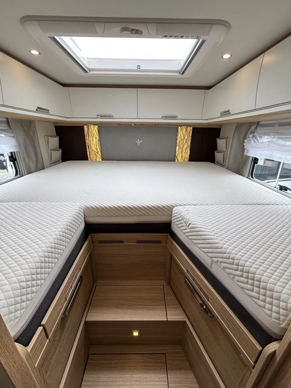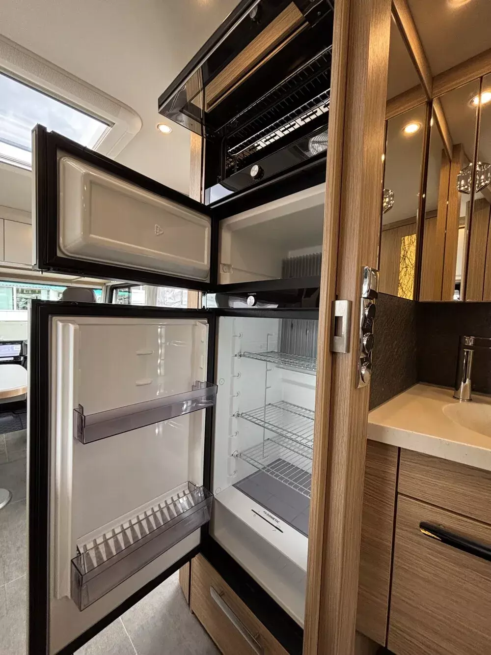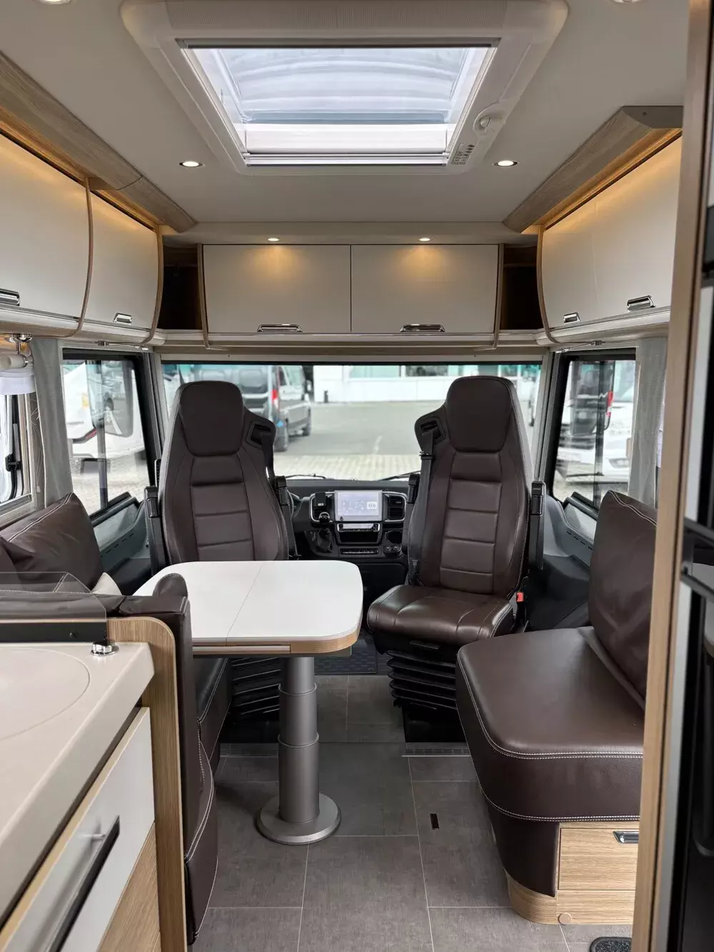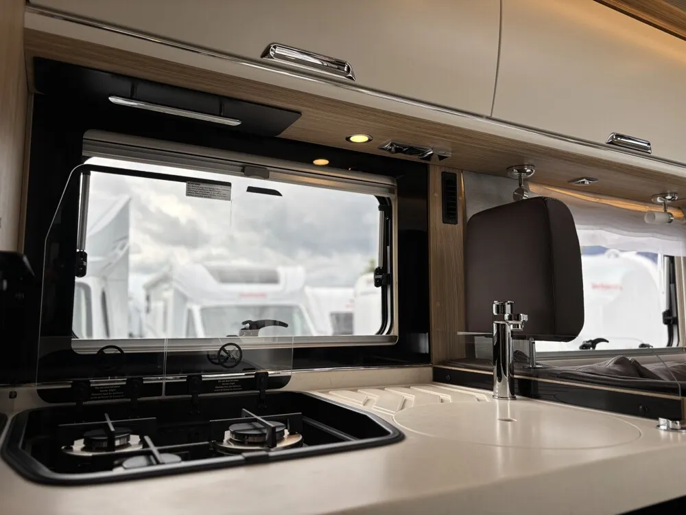 - CP - Comfort Paket (Panoramadachluke (Kippdach) über Wohnraum anstelle Dachluke über Wohnraum, Froli Schlafsystem inkl. Kaltschaummatratze, TecTower mit 142 l + 35 l Gefrierfach (Türöffnung nach links und rechts), inkl. 25 l Gasbackofen, Verdunklungsplissee für Fahrer-/Beifahrerfenster)