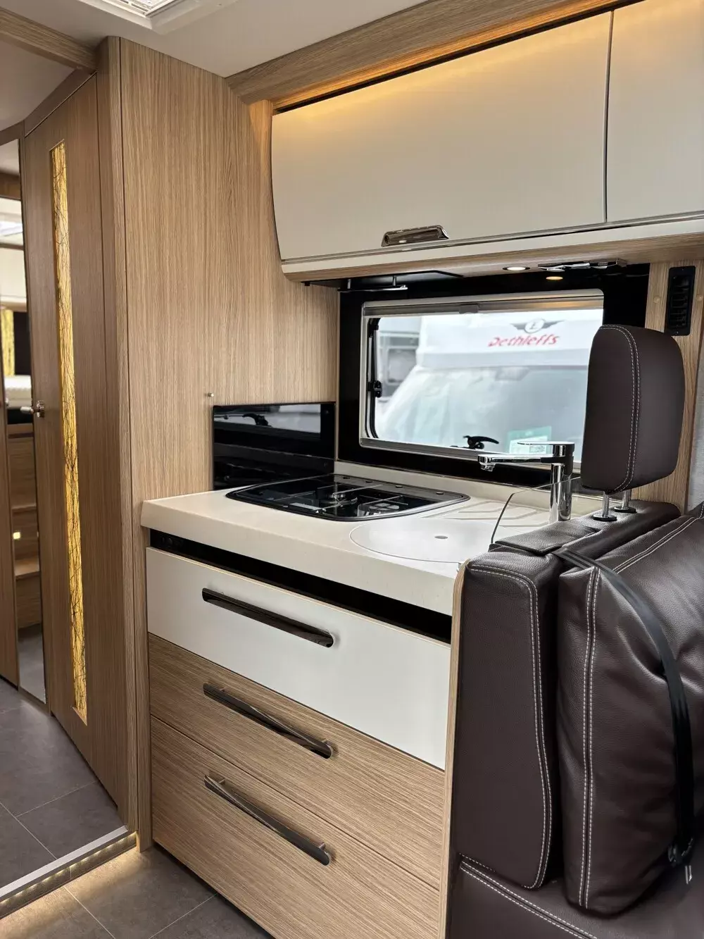 - Grundrissvariante "Face-to-Face" (gerade Küche und Sofa anstelle Serie) (Anzahl der serienmäßigen Sitzplätze reduziert sich auf 3)