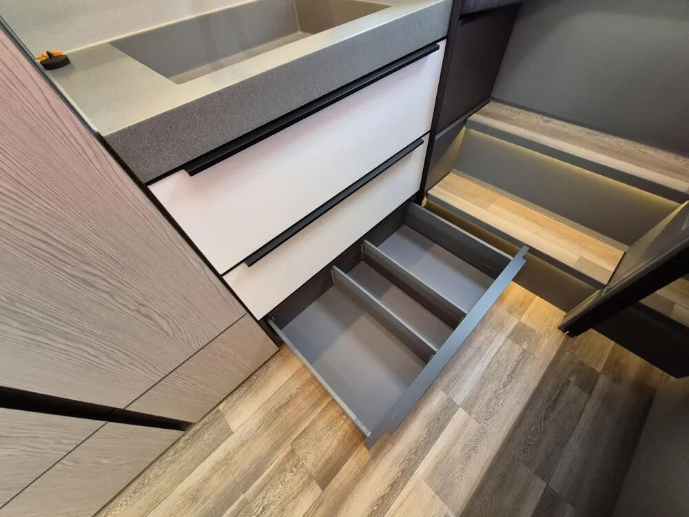 - Stauraumsystem im Doppelboden (95 x 85 cm, 6 Behälter, 40 X 30 cm) (nur möglich bei Modell 88)
