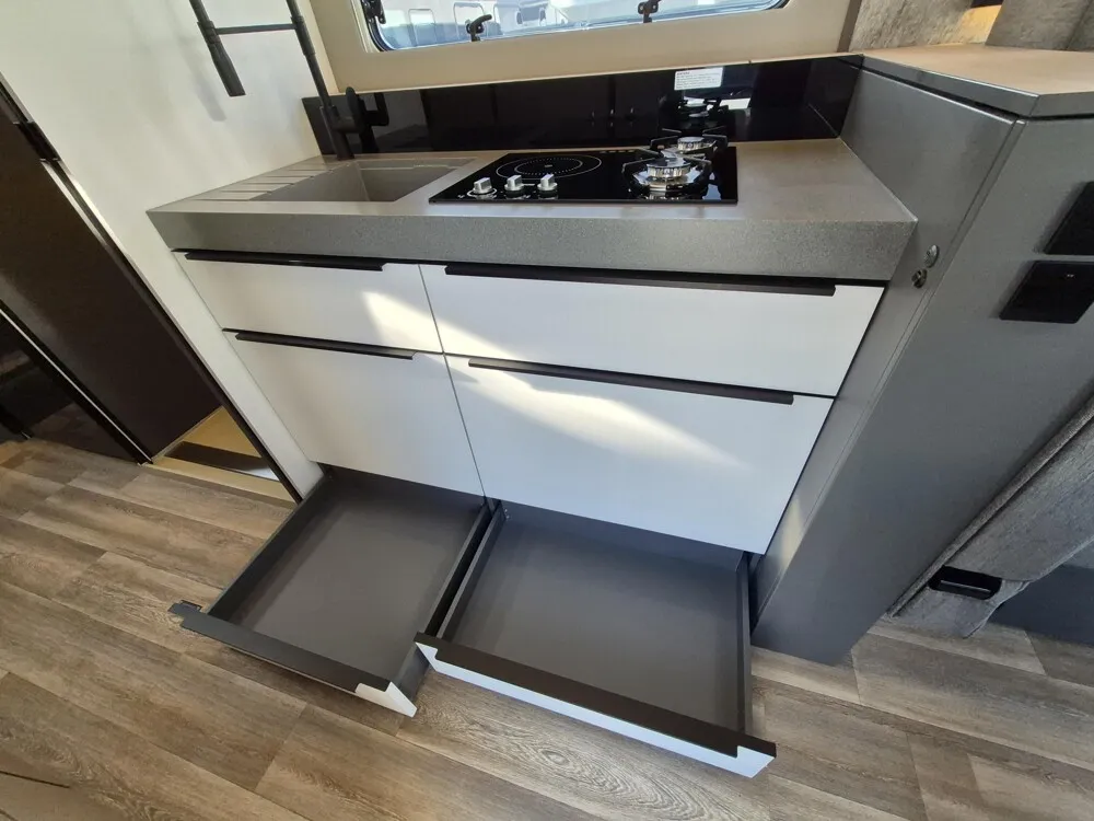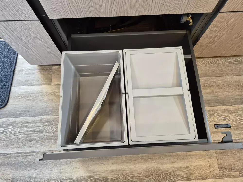 - Behälterauszug 155 x 65 cm (3 Behälter 60x40 cm und 1 festes Fach 30x58 cm) auf Beifahrerseite, vorne (nur möglich für Modell 88)