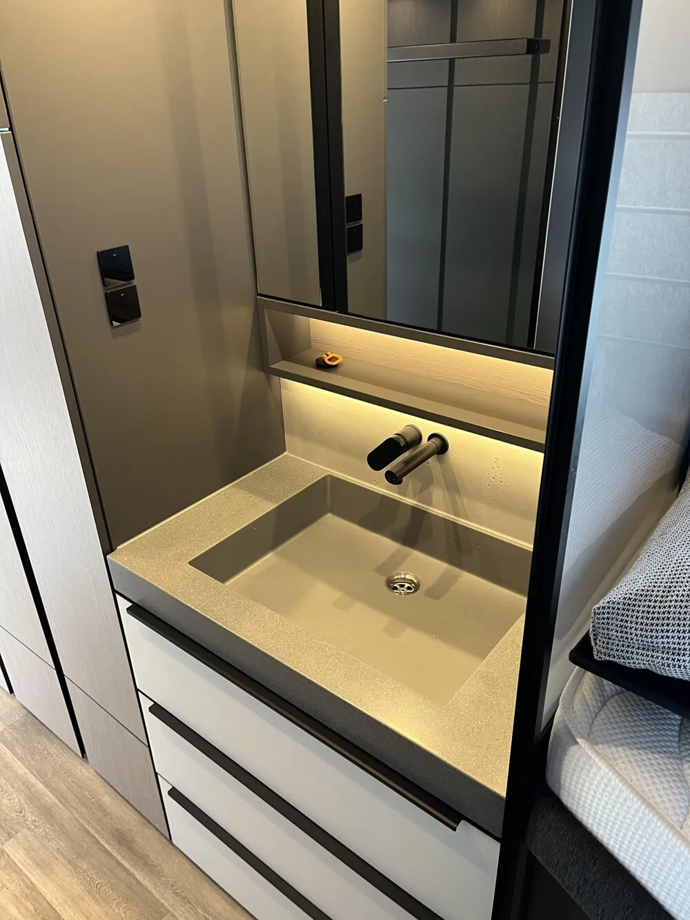 - Glaselement (elektrisch verdunkelbar) zwischen Waschbecken und Schlafbereich (nur möglich bei Modell 88)