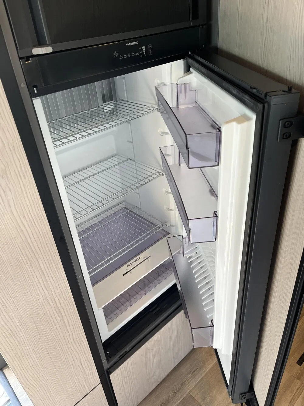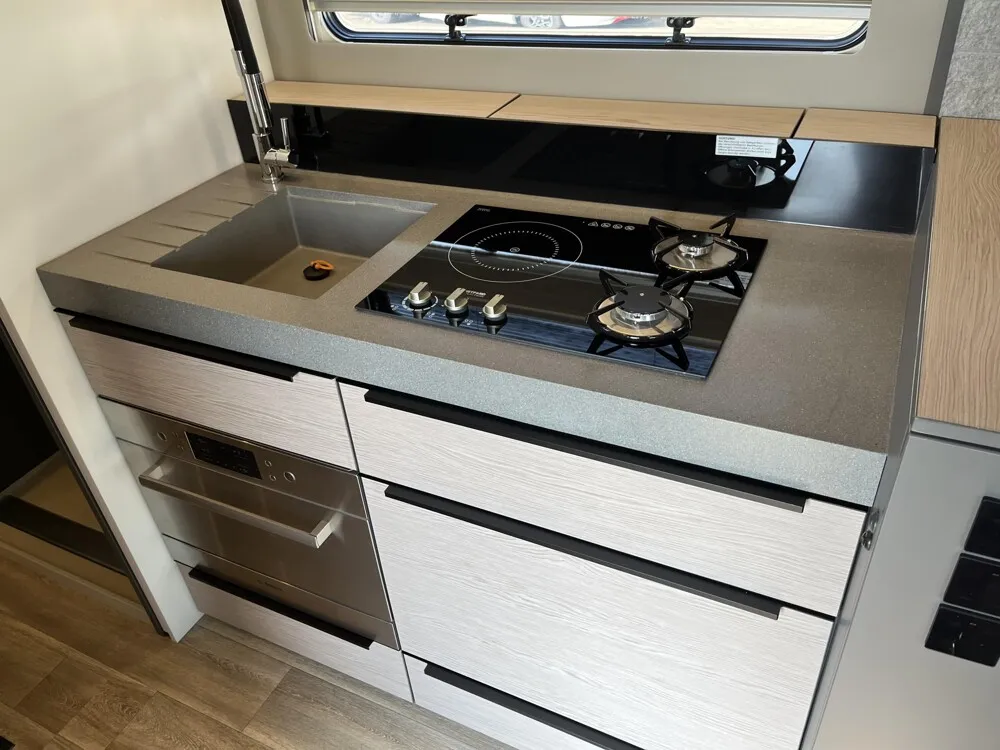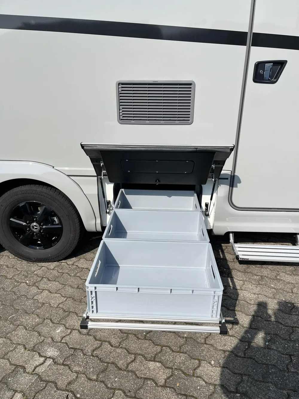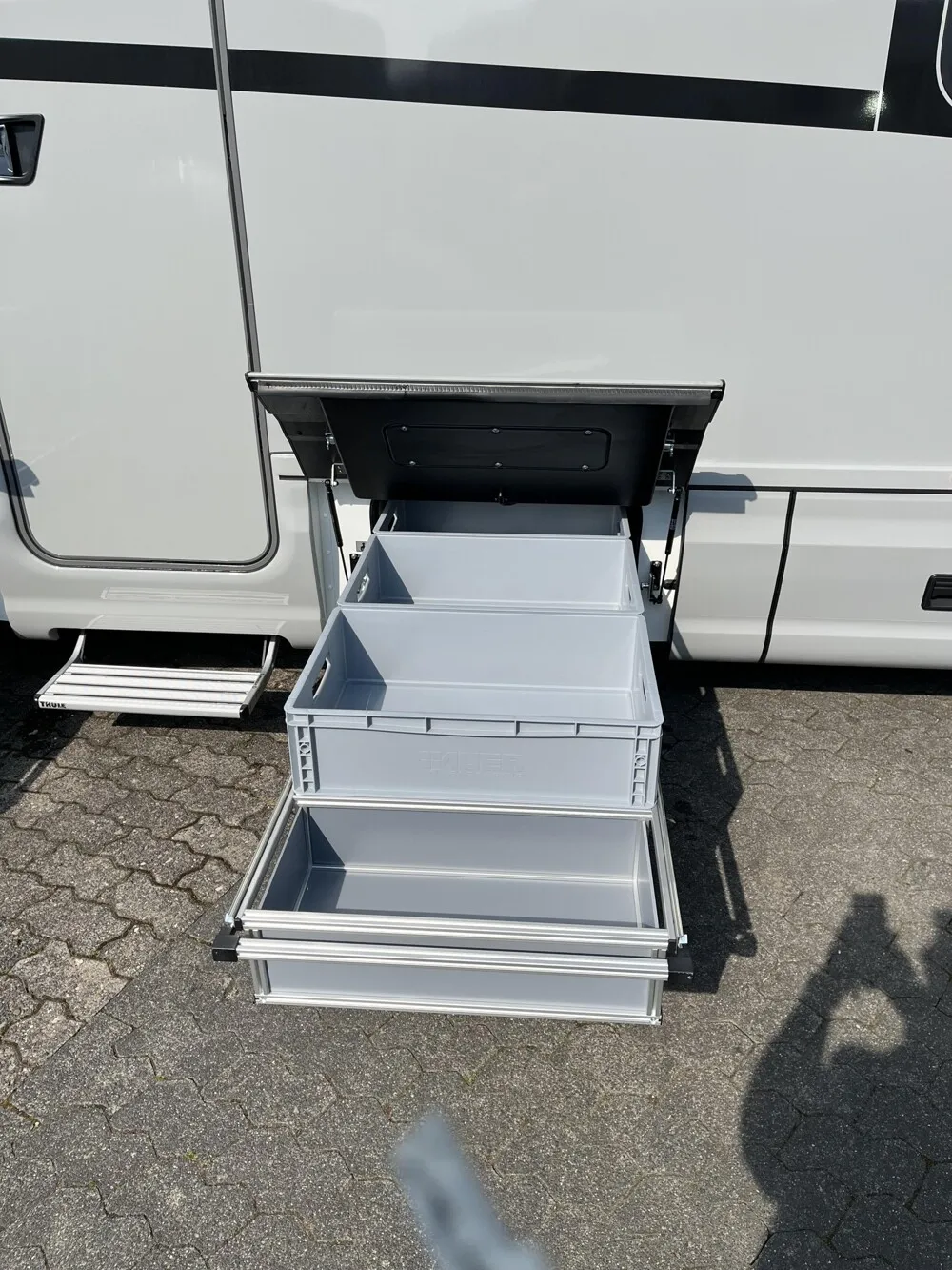 - Entfall Gasflaschenkasten, dafür Außenstaufach mit Zwischenboden (ca. 180 ltr., 2x 69 x 37,5 x 35 cm, nur in Verbindung mit Gastank, Code V5025511)