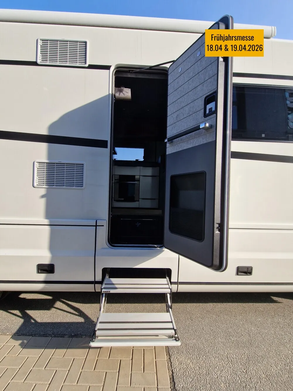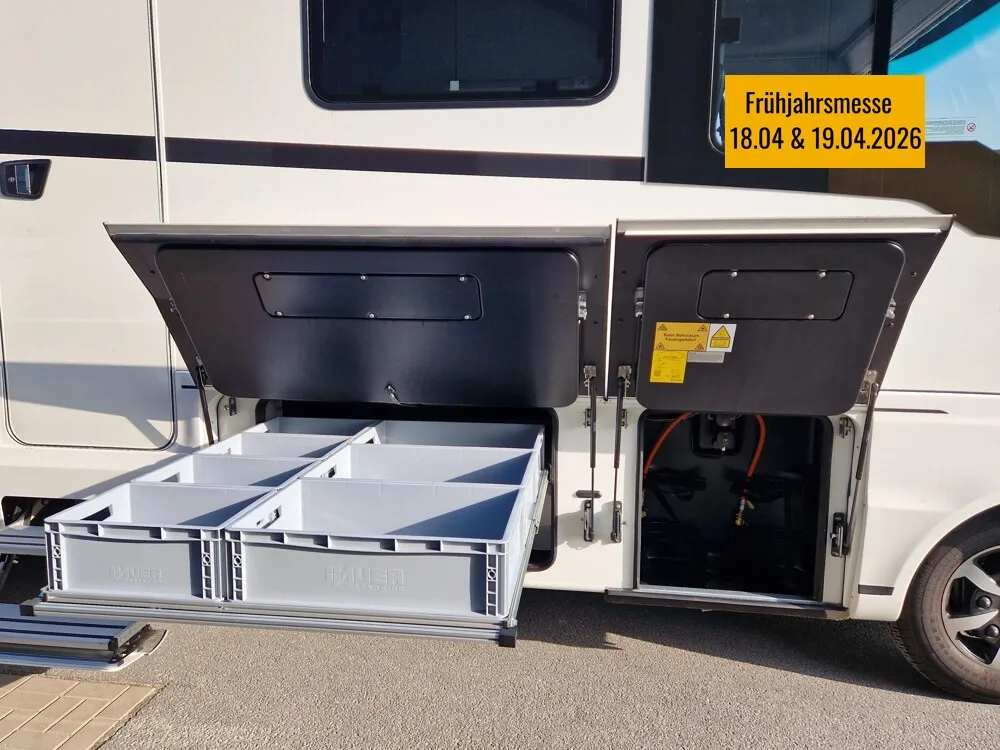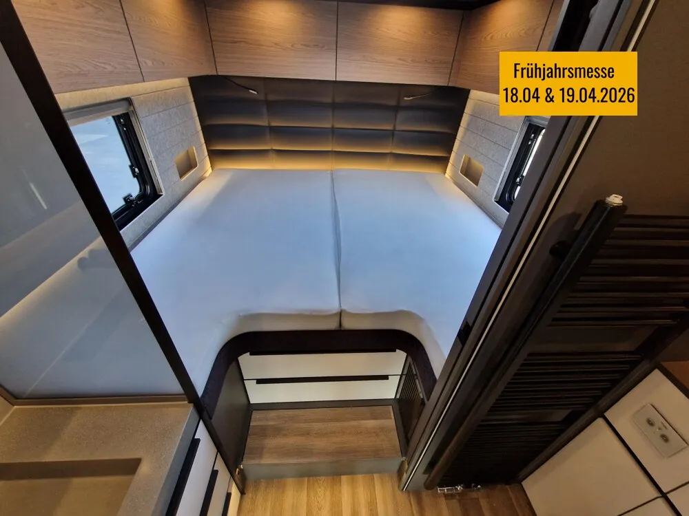 - MMP - Multimedia Paket (Navigationsgerät mit 9" Touchscreen, inkl. Radio mit DAB+, Bluetooth und Rückfahrkamera hinter Lilien-Emblem (nur in Verbindung mit Radiovorbereitung, Code V5073013 oder V5073014), Radiovorbereitung "Soundsystem", bestehend aus vier High-End-Zwei-Wege-Lautsprechern, Subwoofer, Dachantenne, Sat.-Anlage Oyster V Vision (ohne Receiver), Smart TV 32", inkl. Triple Tuner, Bluetooth 4.2, elektrisch ausfahrbar im Raumtrenner zwischen Küche und Sofa)