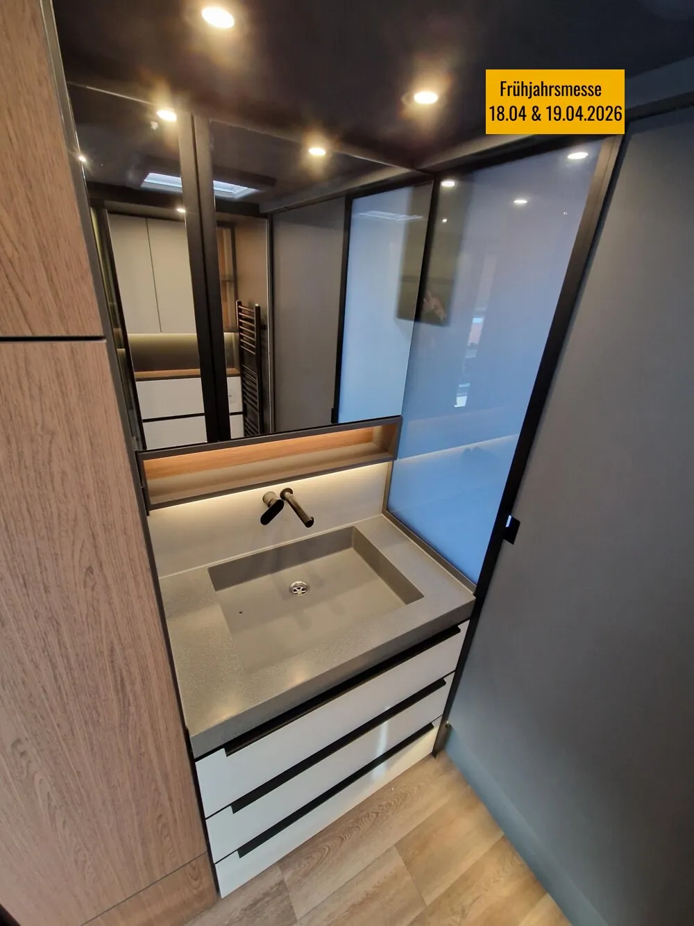 - Glaselement (elektrisch verdunkelbar) zwischen Waschbecken und Schlafbereich
