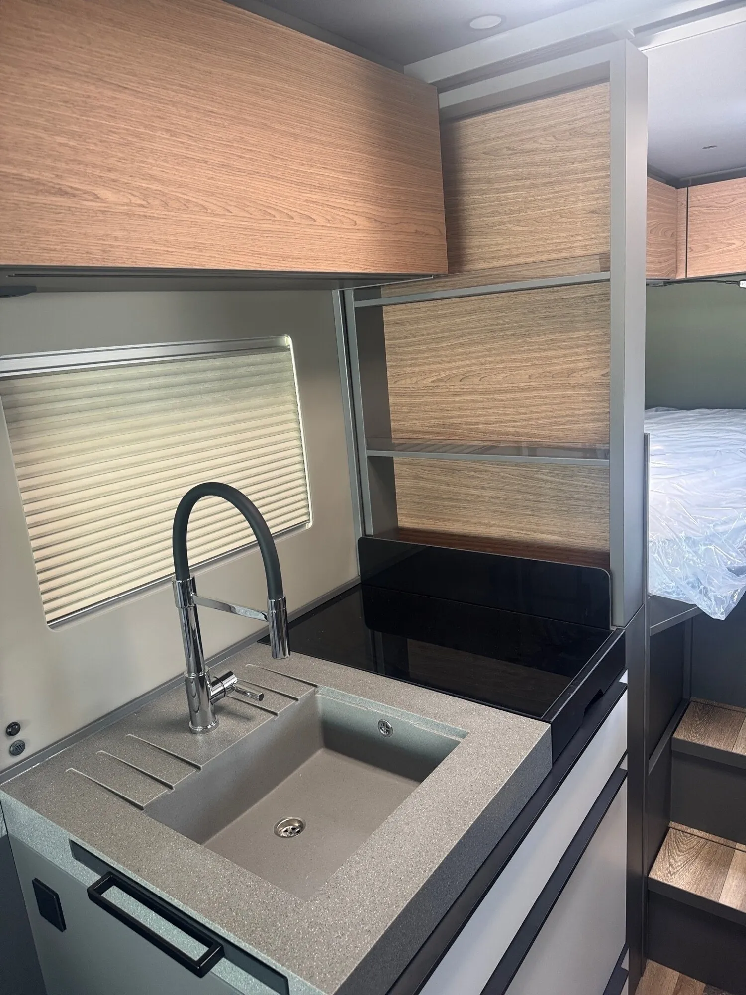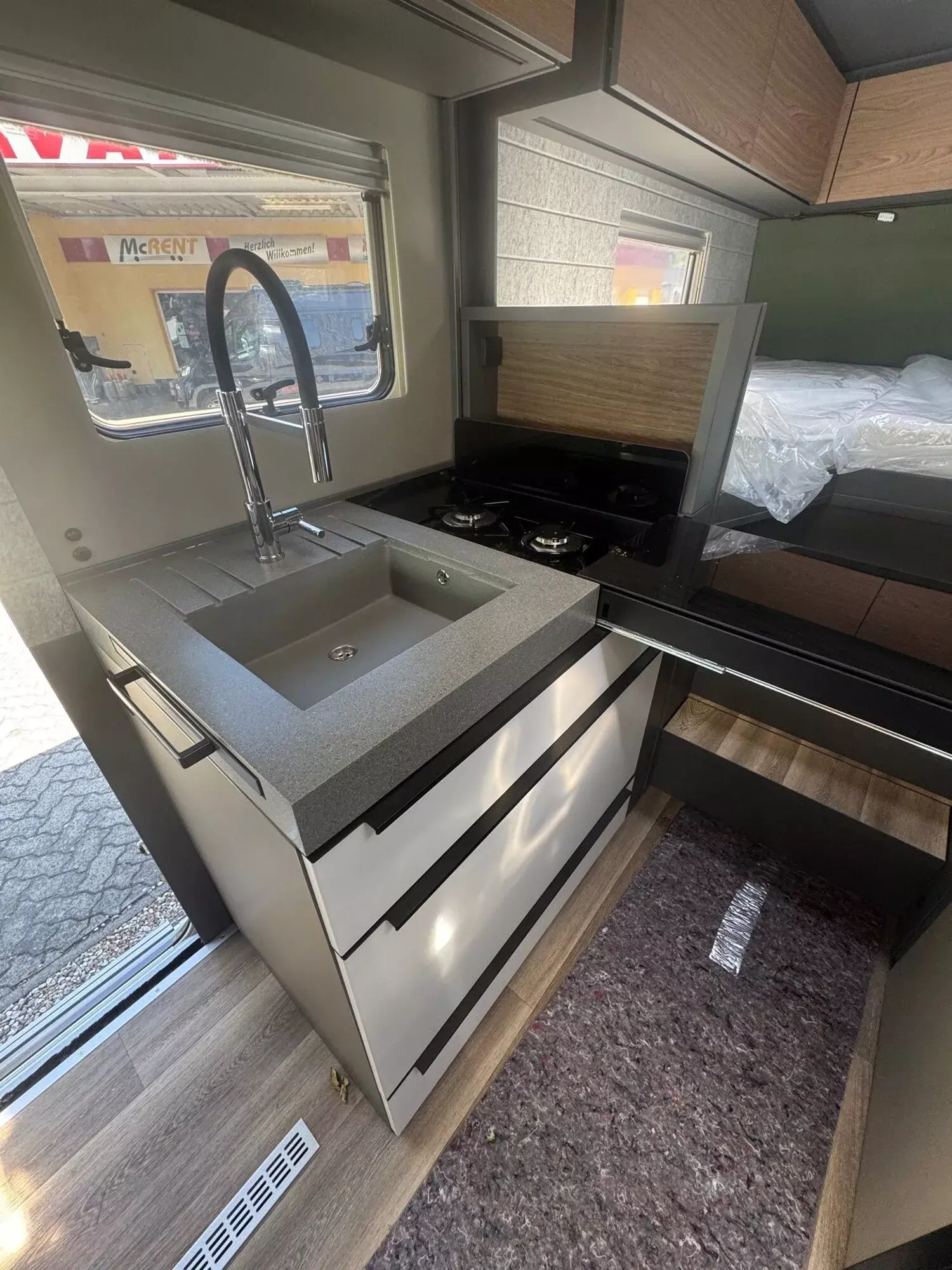 - Küchenfronten in White Planked (Matt weiß), beim 7.3 F inkl. Heckbettschubladen