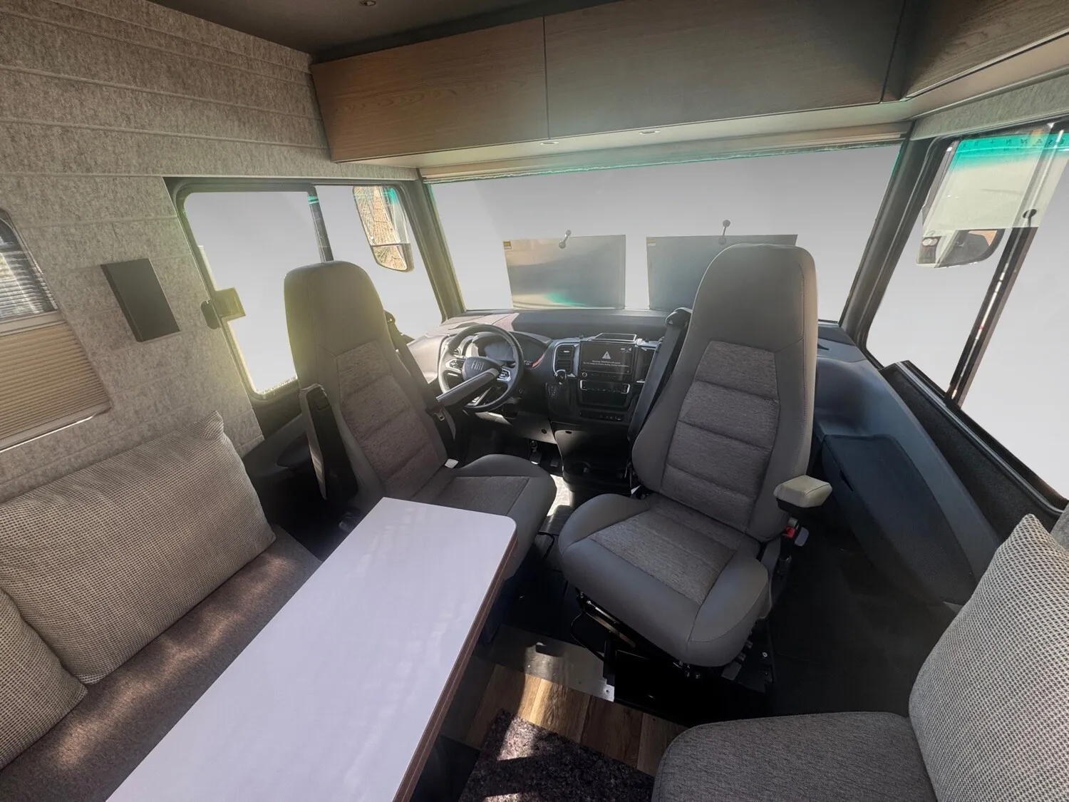 - Sofa Fahrerseite zur L-Sitzbank umbaubar (4 Gurtsitze gesamt), inkl. klappbarer Tischplatte und schiebbarem Tisch dank Bodenschienensystem