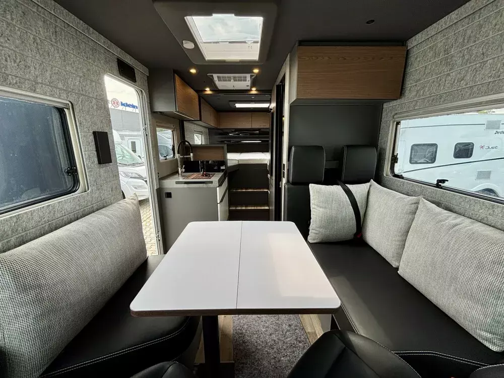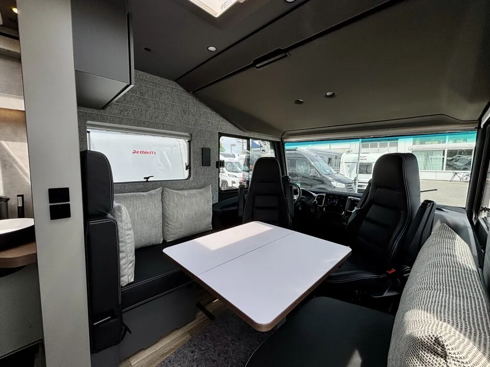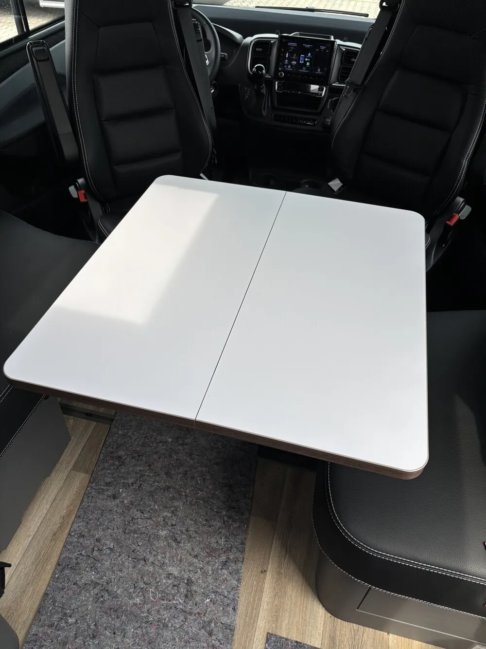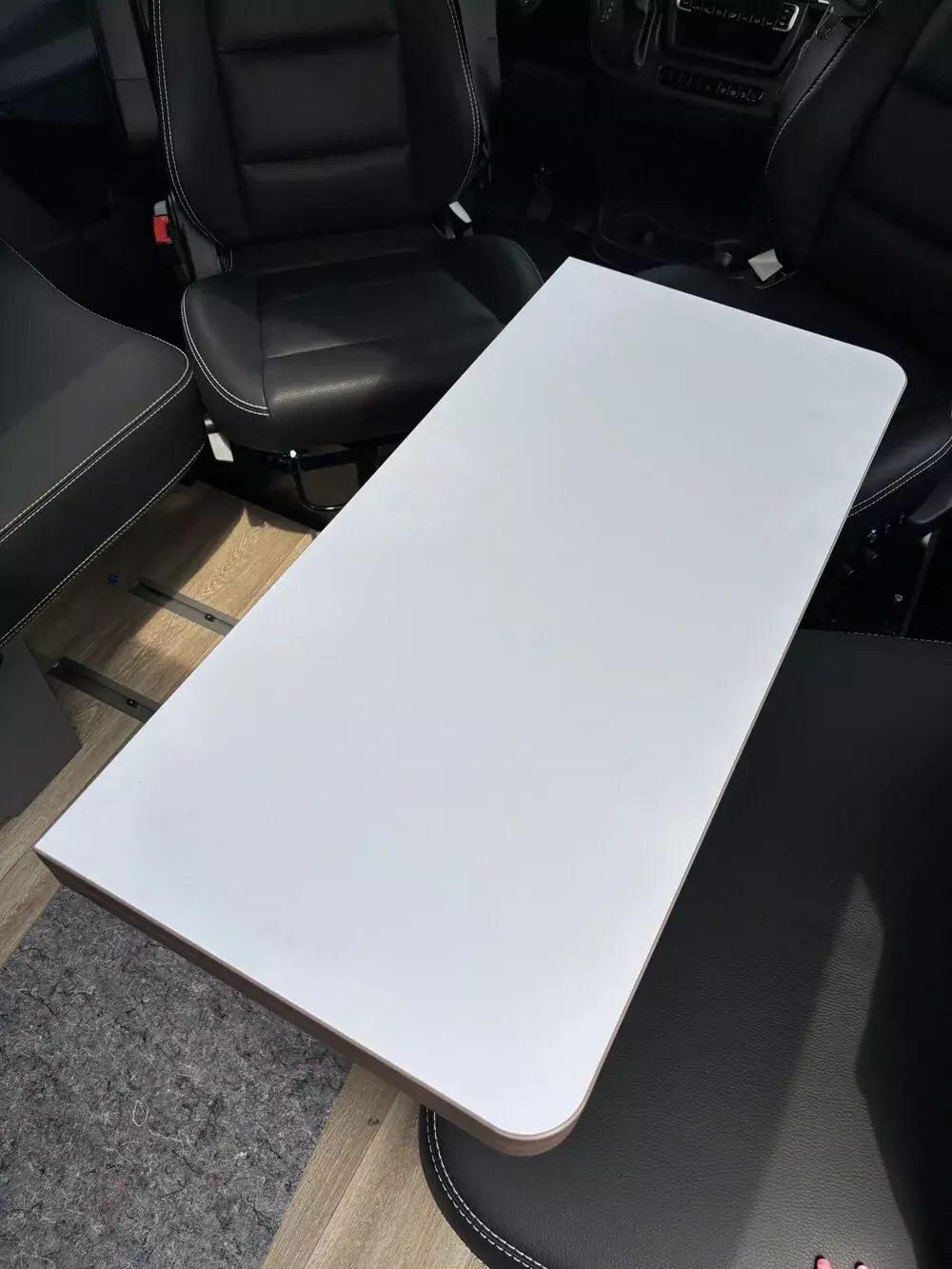 - Sofa Fahrerseite zur L-Sitzbank umbaubar (4 Gurtsitze gesamt), inkl. klappbarer Tischplatte und schiebbarem Tisch dank Bodenschienensystem