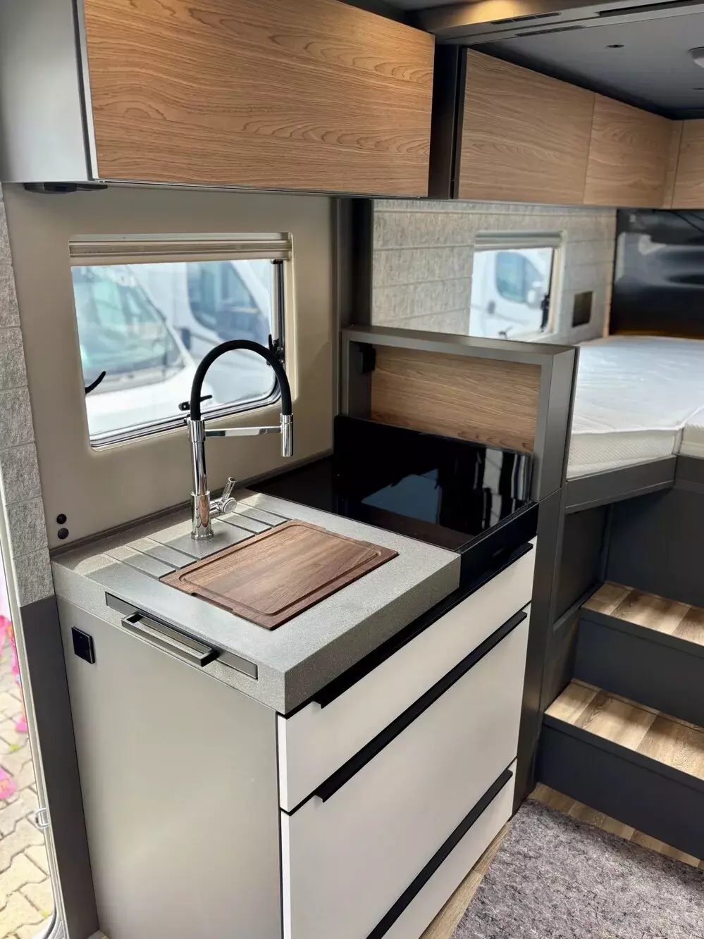 - Küchenfronten in White Planked (Matt weiß), beim 7.3 F inkl. Heckbettschubladen