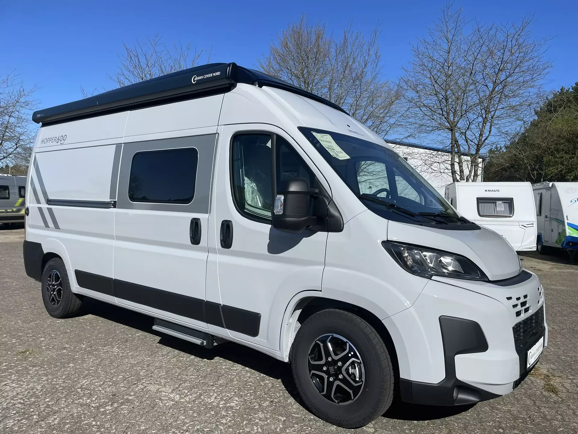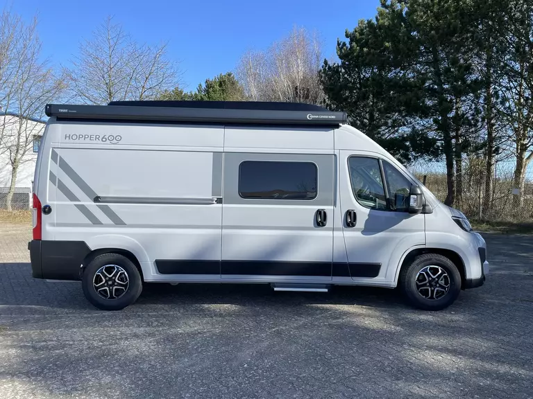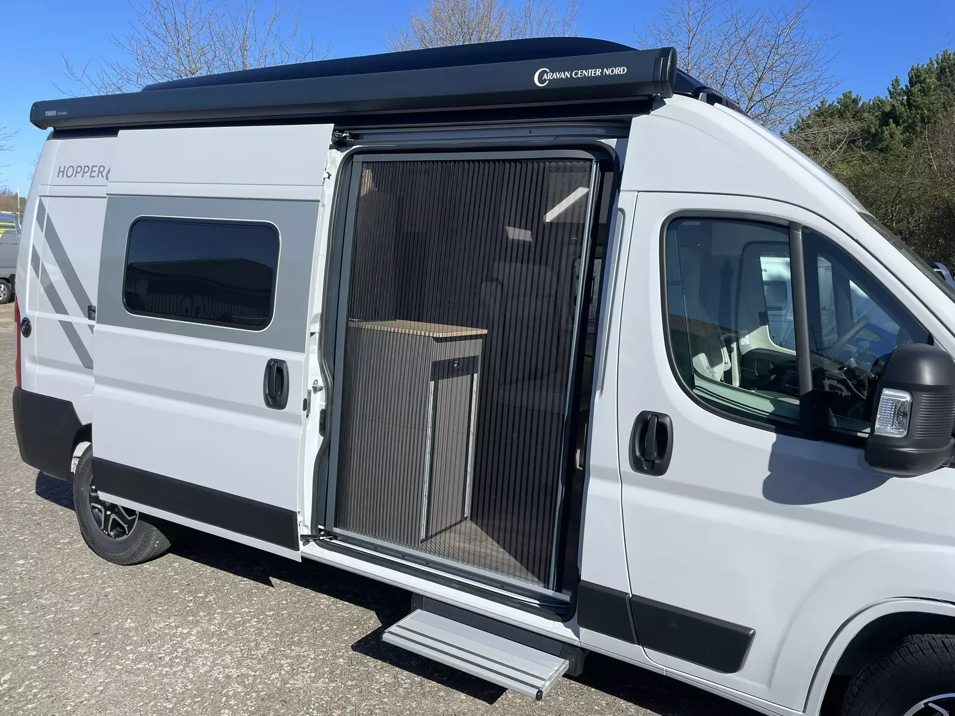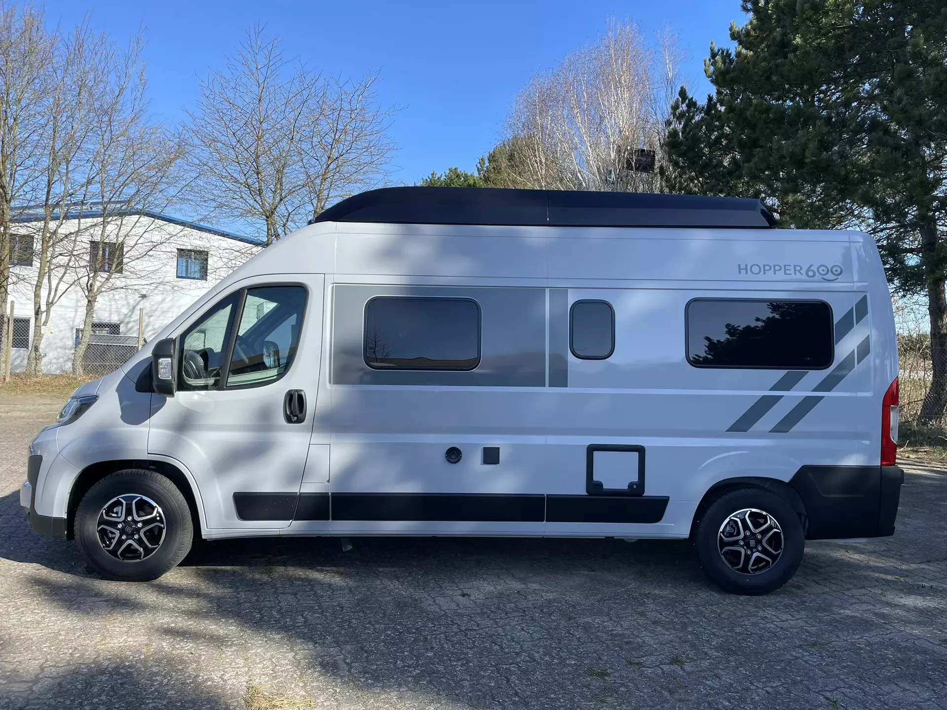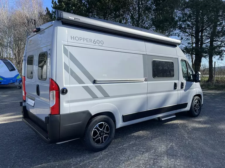 - Ausstattung Hopper 600+: 90 l Dieseltank, Isofix, Markise Thule Omnistor anthrazit, Tempomat, DAB Radio/Apple CarPlay, Klimaanlage Fahrerhaus manuell, Kompressor Kühlschrank, 95 Ah Aufbaubatterie, Rahmenfenster, Lederlenkrad, 16" Alufelgen, Abwassertank 90 l isoliert und beheizt, Allwetterreifen, Wassertank 100 l mit Einfüllstutzen, Nebelscheinwerfer, Duschausstattung mit Rolzrost Dusche, Elektrische Einstiegstufe Omnistep, Fenster im Bad, Fahrerhaus Verdunkelung Plissees, Kleiderstange in der Nasszelle, Fliegengittertür, 70 x 50 cm Midi-Heki, Tischplattenerweiterung, 12 Jahre Dichtigkeitsgara