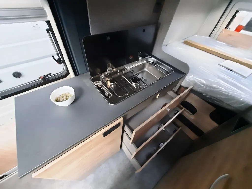 Fiat Ducato 140 PS, Allwetterreifen M+S* Camping Snowflake, Fahrerhausklimaanalag, Dieseltank 90 l, Scheinwerferrahmen schwarz, Captain Chair und Traction+, Rahmenfenster, Fahrer- & Beifahrer, Podest der Sitzgruppe mit integriertem Staufach, Kleiderschrank im Bettkasten links, 2-Flamm-Kocher- und Spülen-Kombination mit Elektrozündung, Geräumige Schubkasten mit Softclose und Pushlocks im Küchenblock, Kompressorkühlschrank 84 l inkl. Frosterfach 6,1 l, Combi 4 Warmluft-/Warmwasserheizung, Wassertank 100 l, Abwassertank 90 l, Stauraum für Gasflaschen mit je 11 kg Füllgewicht: 2 Stück, Isofix für einen Sitzplatz, 10 Jahre Dichtigkeitsgarantie u.v.m.*