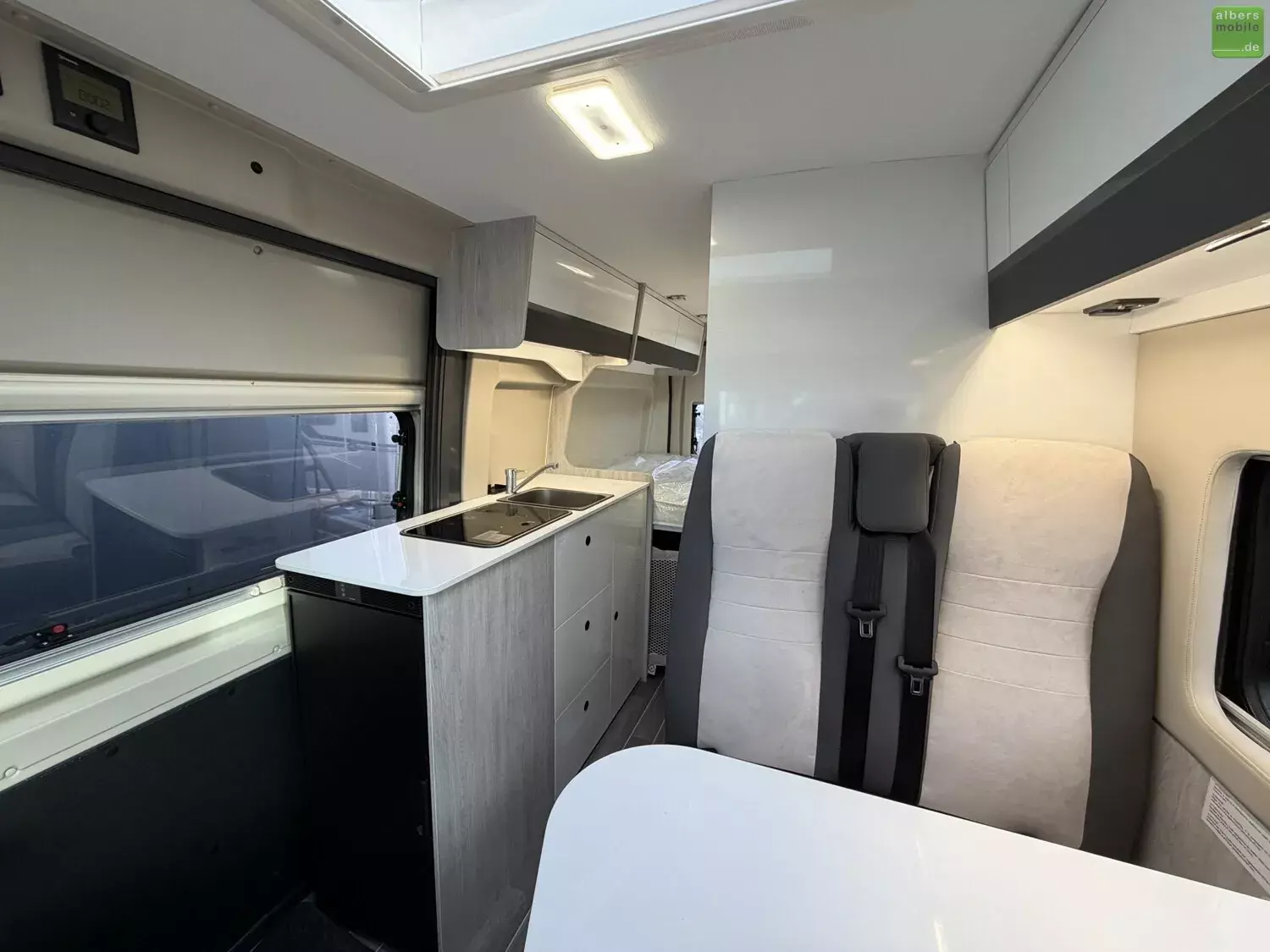 - Drehbarer Fahrer- und Beifahrersitz mit Lordosenstütze und Armlehne (Captain chairs)