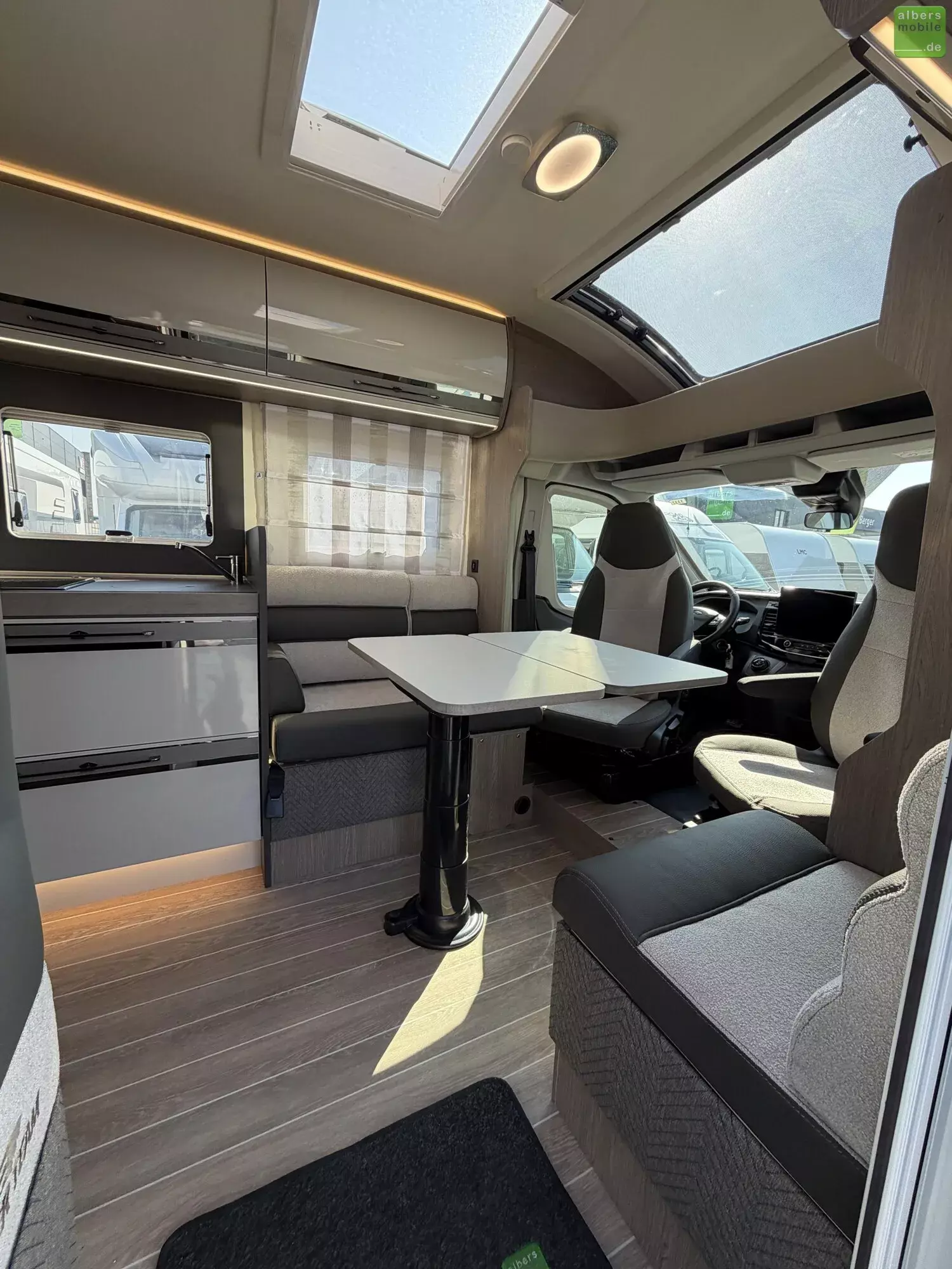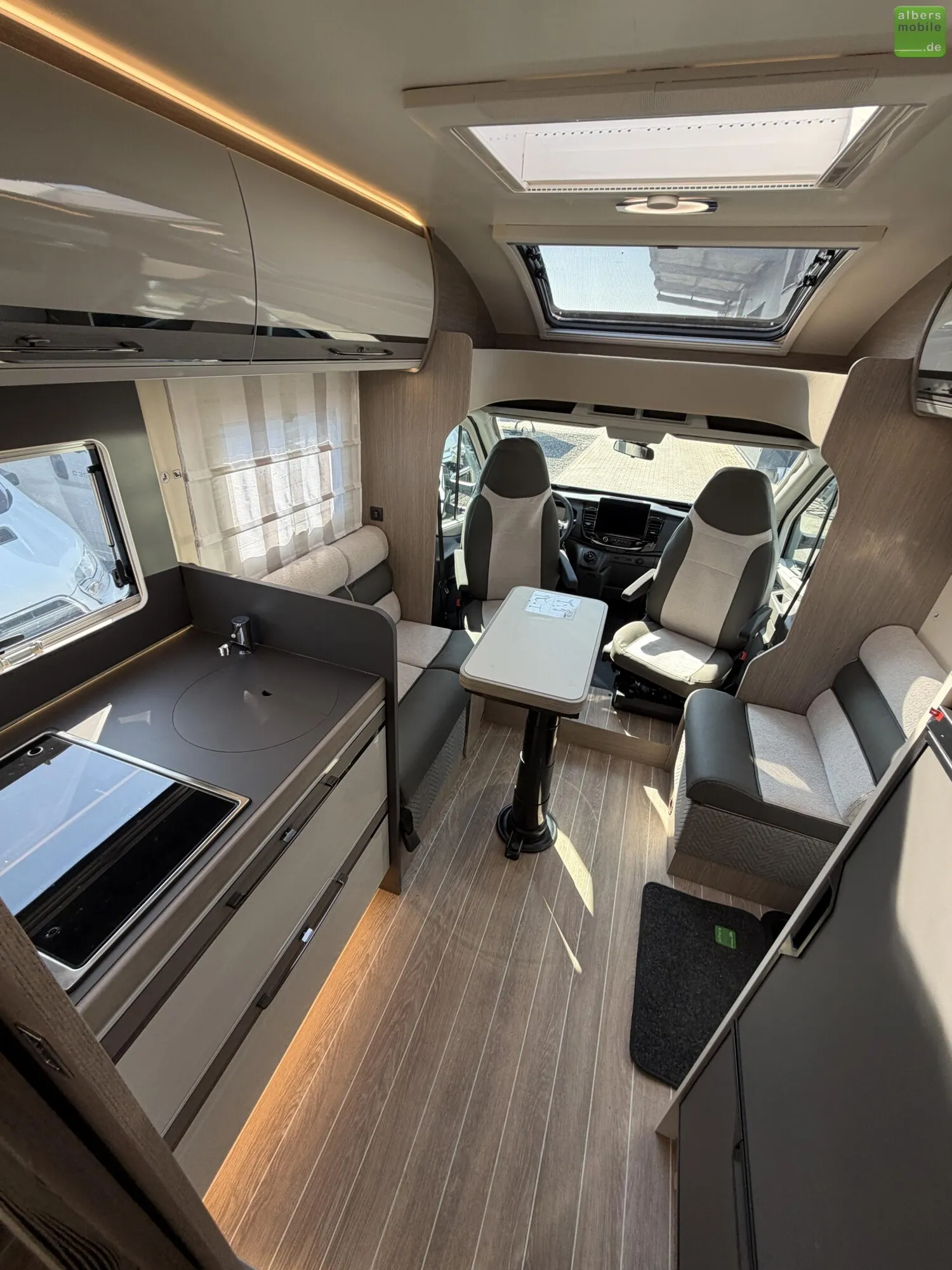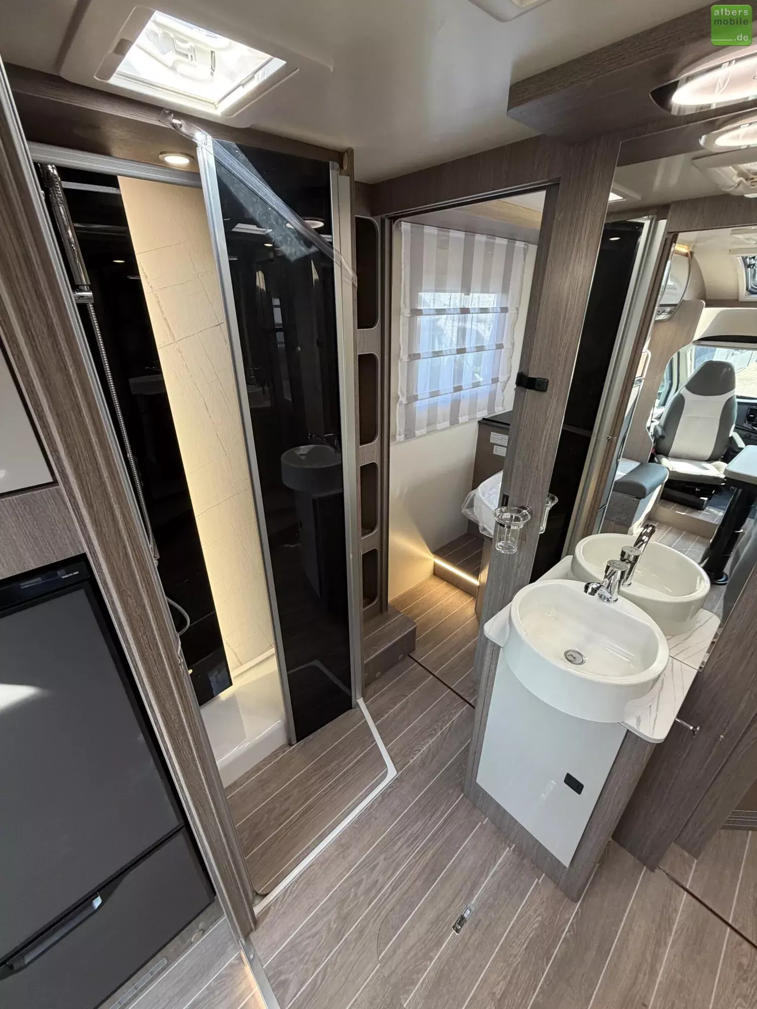 Darüber hinaus umfasst das Reisemobi lneben dem außergewöhnlichen Badezimmerkonzept und Face-to-Face-Sitzgruppe folgende Ausstattung: