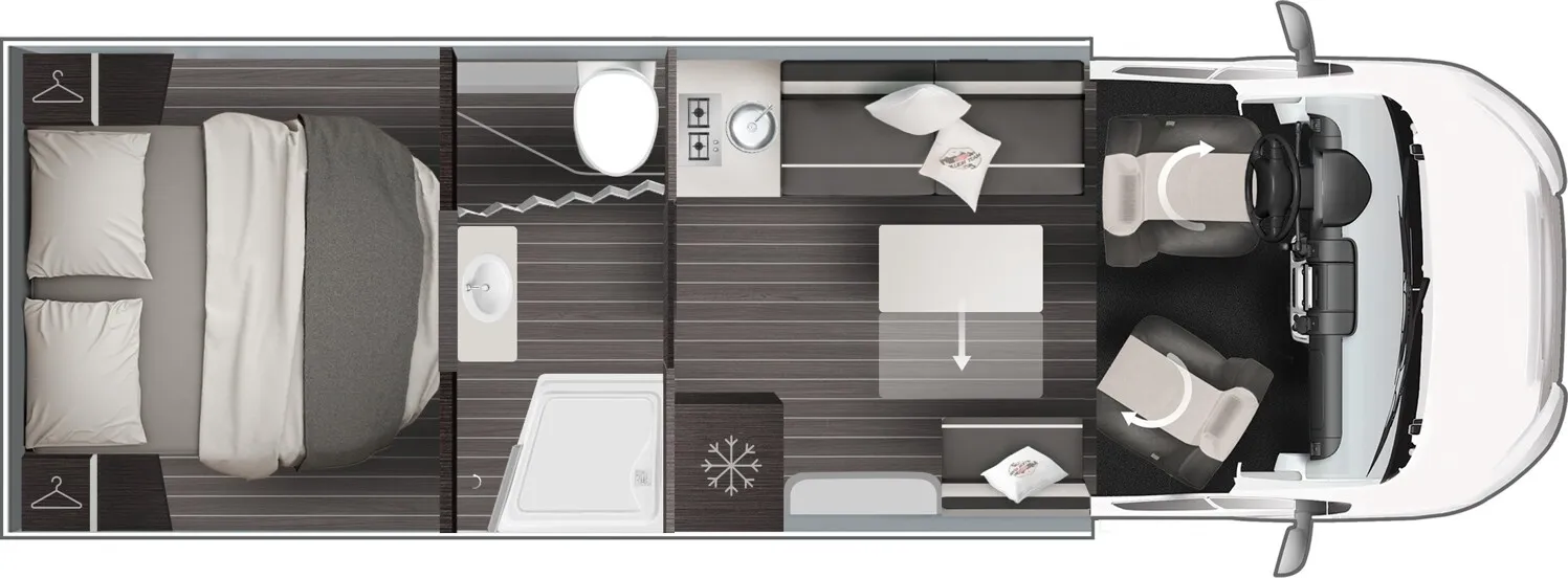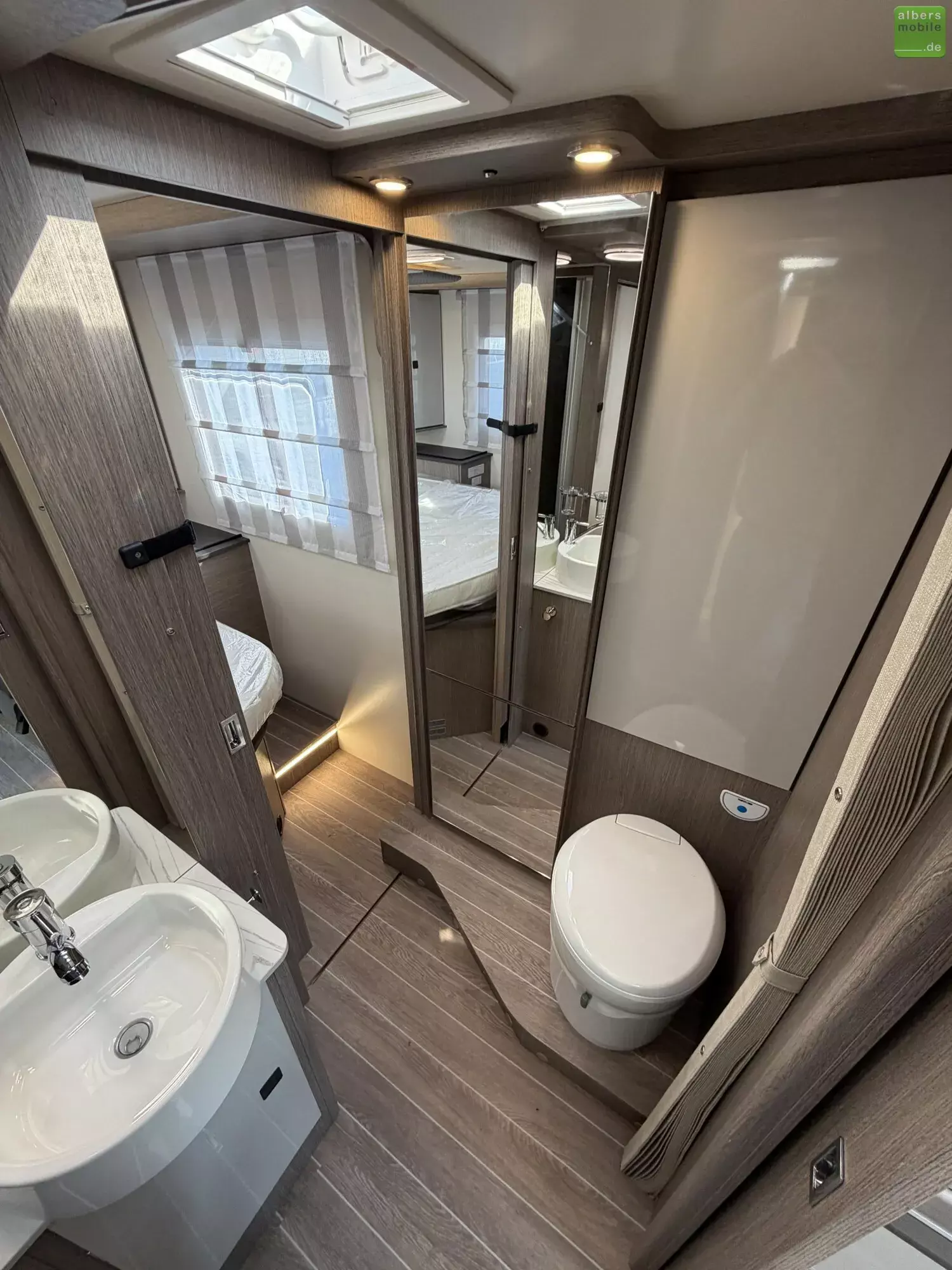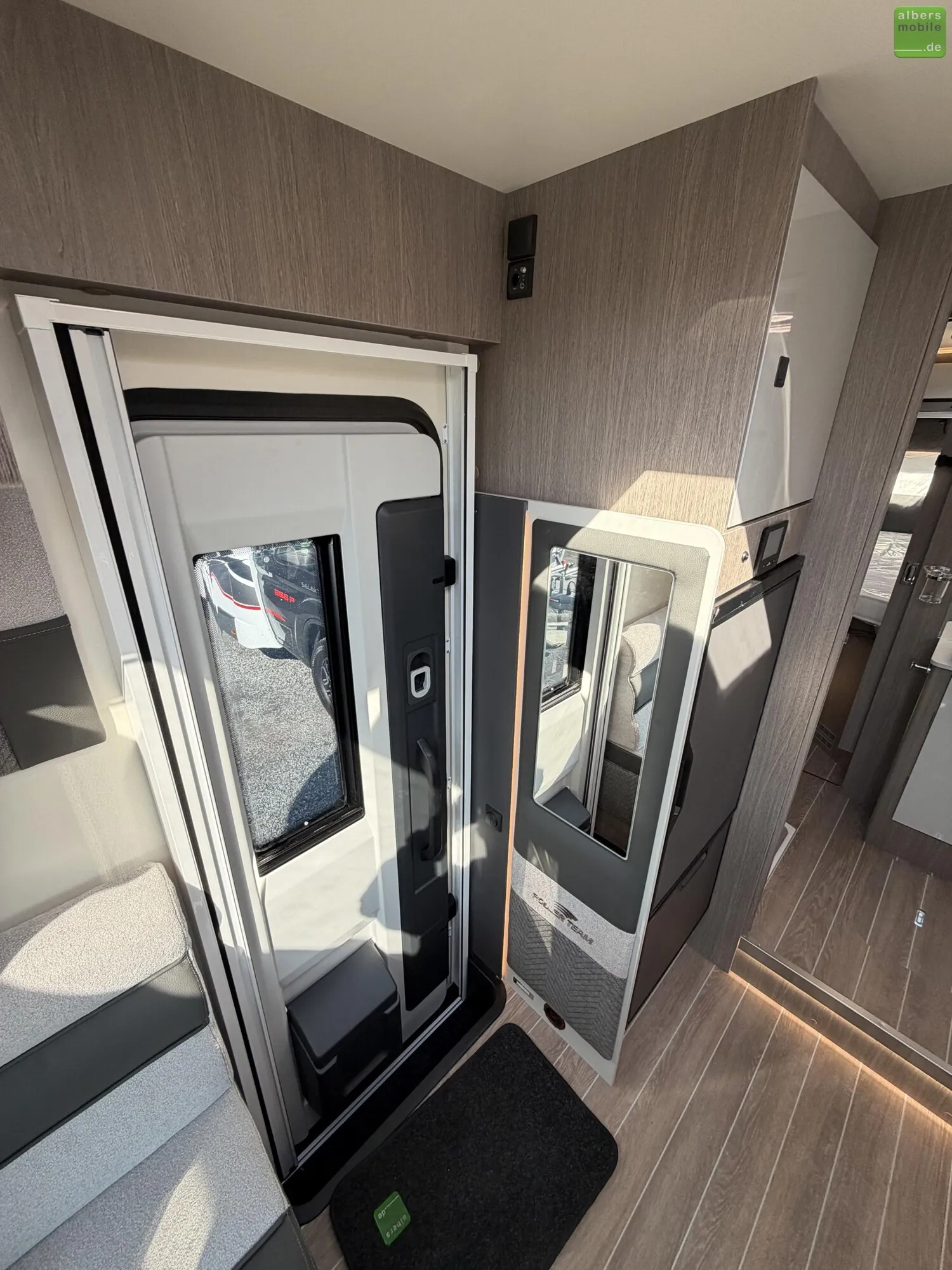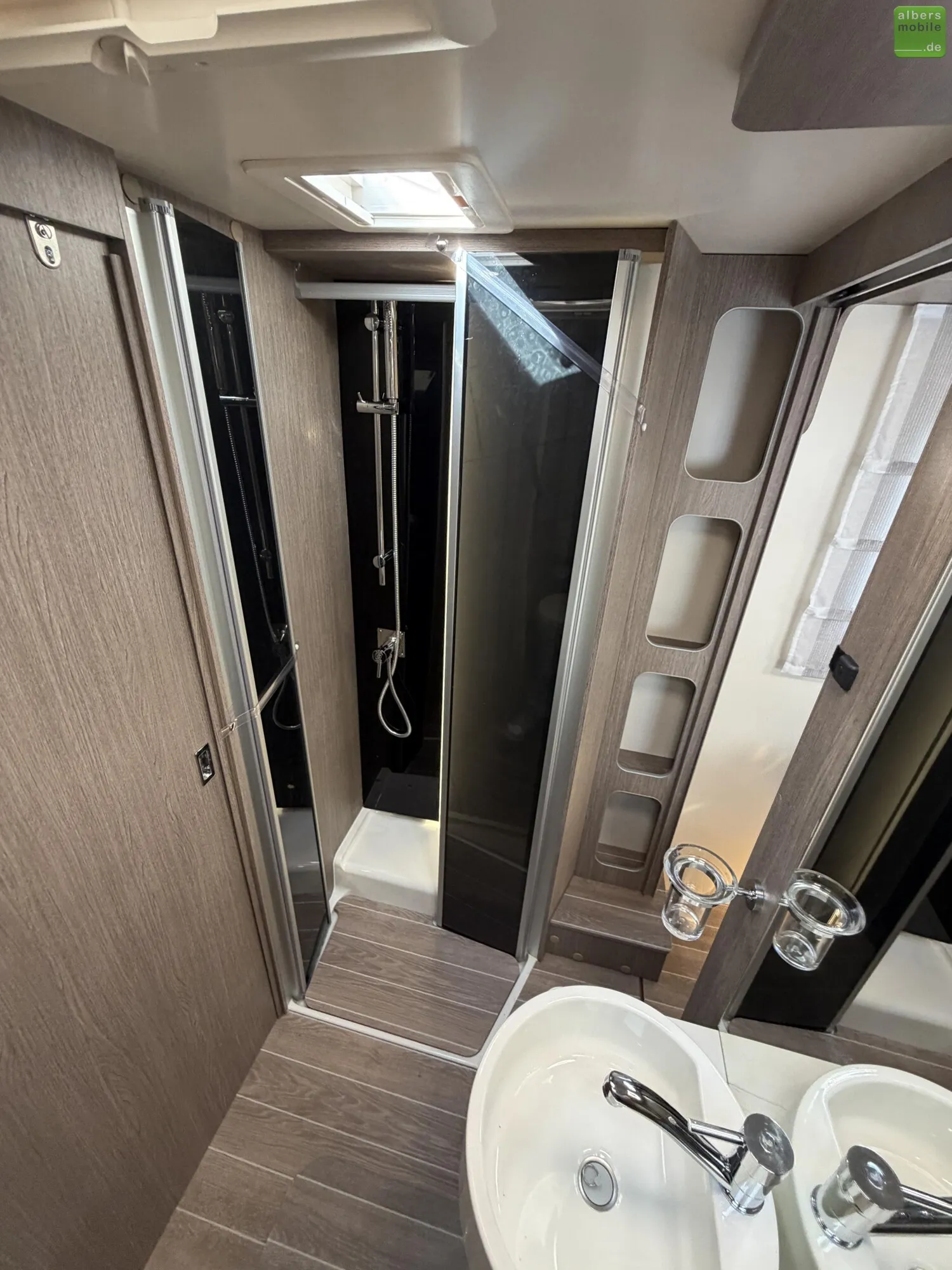 Darüber hinaus umfasst das Reisemobi lneben dem außergewöhnlichen Badezimmerkonzept und Face-to-Face-Sitzgruppe folgende Ausstattung: