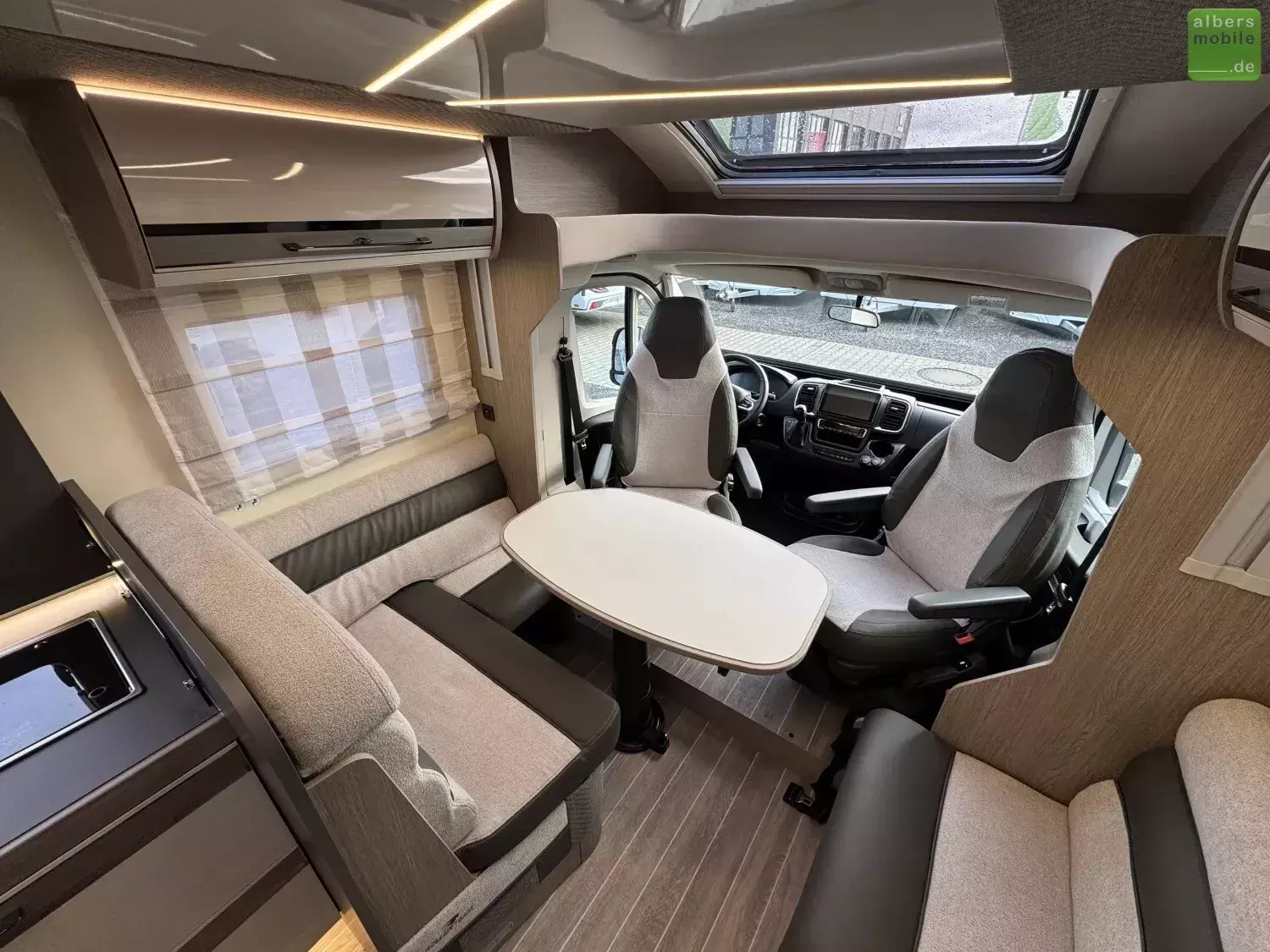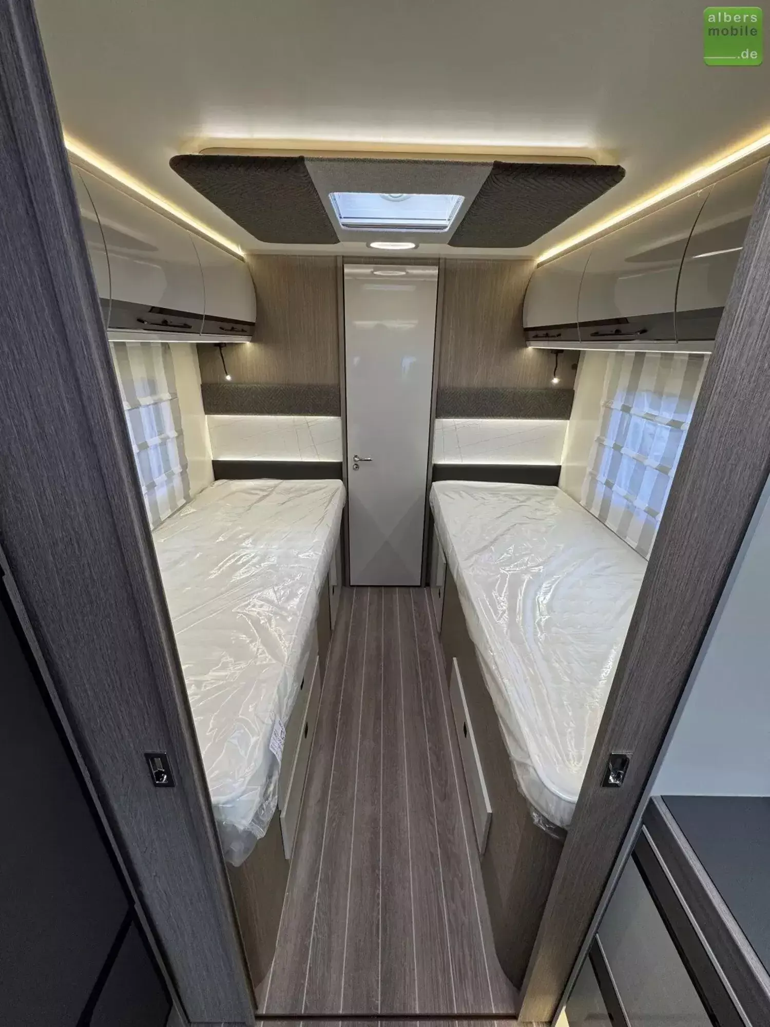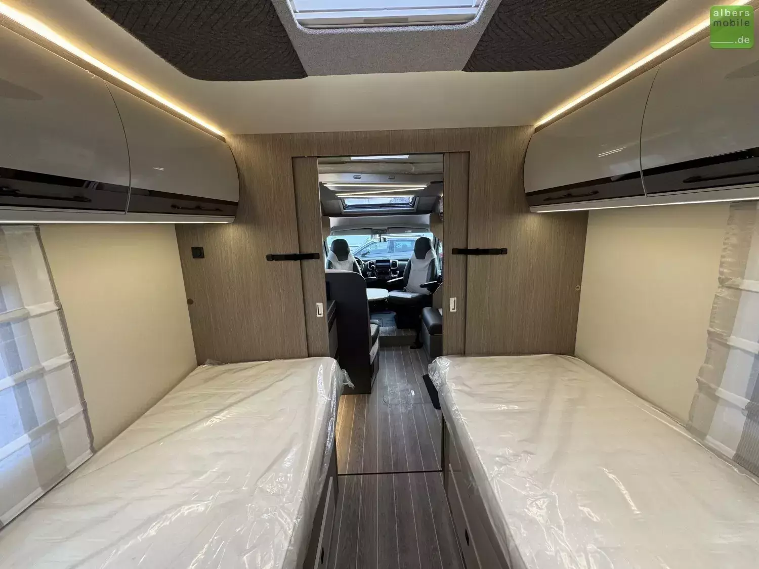 Der ideale Teilintegrierte für Familien mit viel Platz und Stauraum. Mit Einzelbetten im Heck und separatem Toiletten-/Duschbereich.