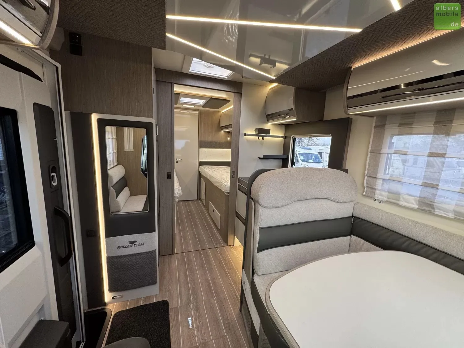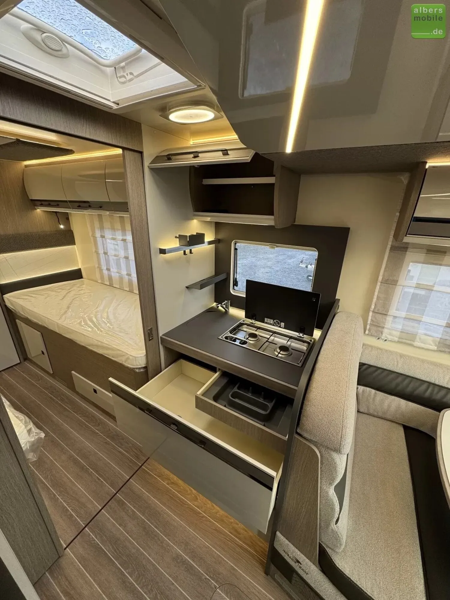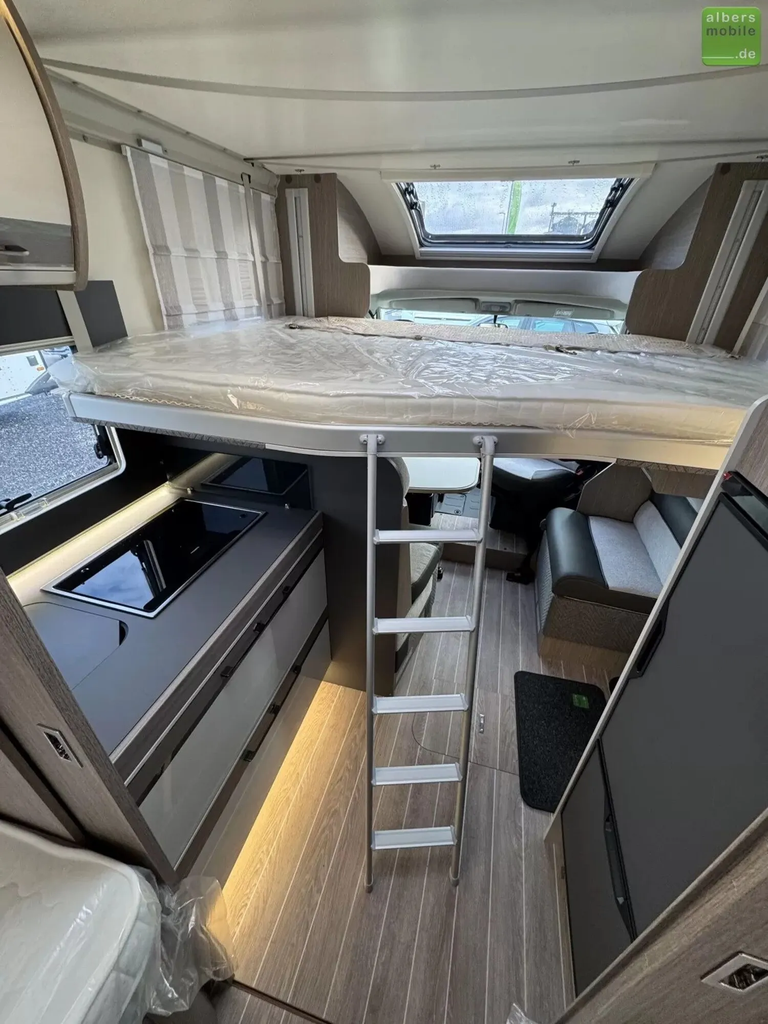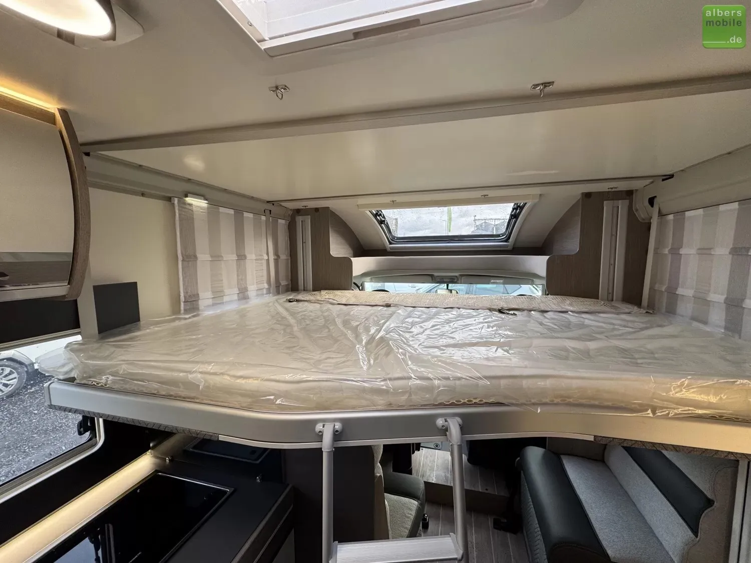 Der ideale Teilintegrierte für Familien mit viel Platz und Stauraum. Mit Einzelbetten im Heck und separatem Toiletten-/Duschbereich.