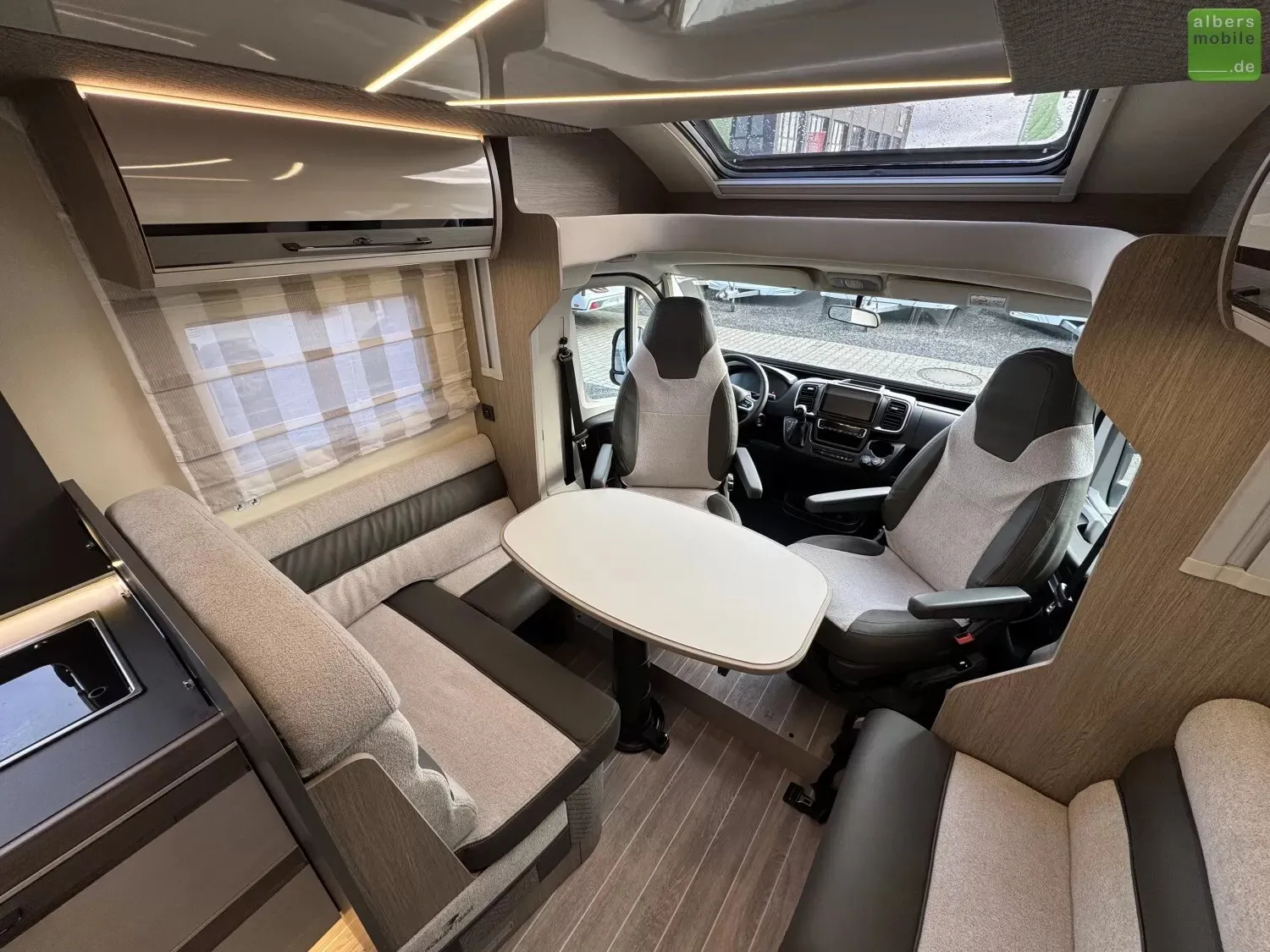 - Drehbarer Fahrer- und Beifahrersitz mit Lordosenstütze und Armlehne (Captain chairs)