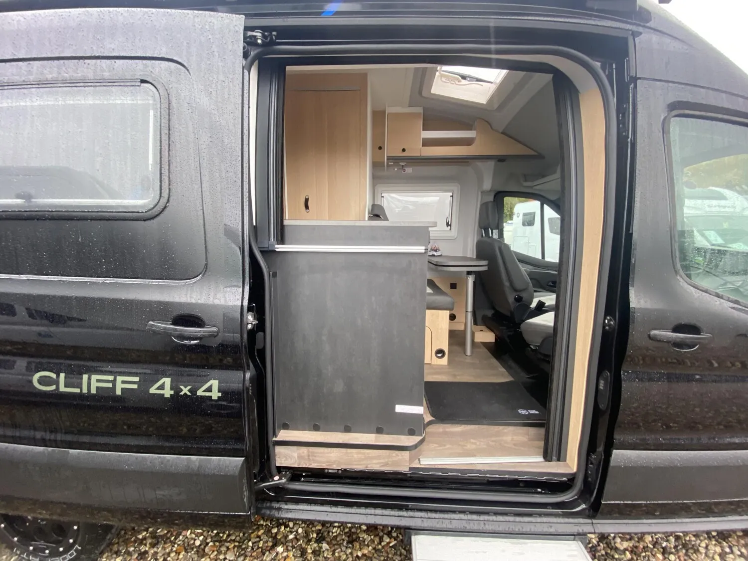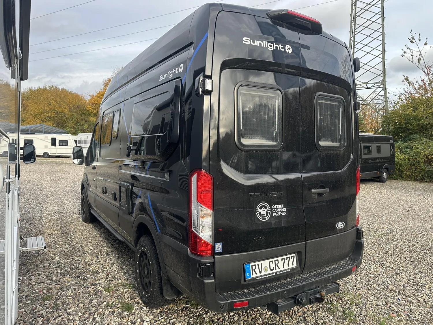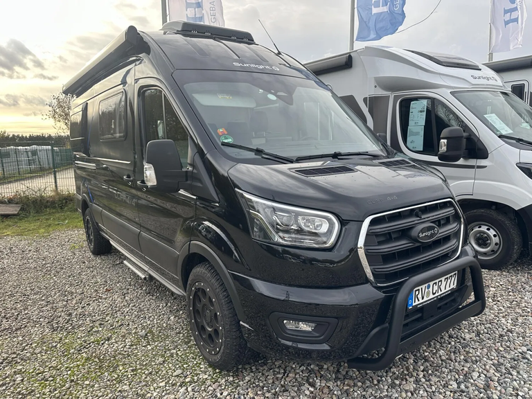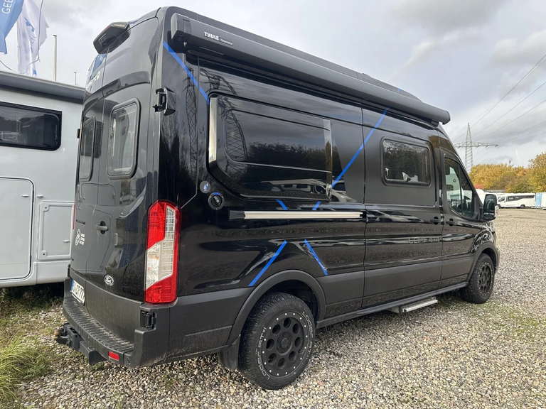 - 4x4 Edition Camper Van 2025 (Ford Transit 3.500 kg - 2,0l TDCi - 122 kW (165 PS) - EURO 6 - 6-Gang-Schaltgetriebe Allradantrieb, Obsidian Schwarz, 16 Zoll Alufelgen, Heckverbreiterung, Adventure Beklebung, Wohnwelt Adventure, Dachstauschrank Heck umlaufend, Rahmenfenster, Markise 3,5 m (schwarz), Basic Paket (Panoramadachhaube 70 x 50 cm, Duschausstattung (Brausekopf ausziehbar, Duschvorhang, Führungsschiene, Brausehalter), Fenster im Bad, Kleiderstange in der Nasszelle, breite Einstiegsstufe, Drehplatte für Tischerweiterung an der Sitzgruppe, Chassis Paket (Klimaanlage inkl. Staub- und Pollenfilter Stoßfänger lackiert, Nebelscheinwerfer, Scheinwerfer mit statischem Abbiegelicht), Hecktüren mit Ausstellfenster (inkl. Rollo))