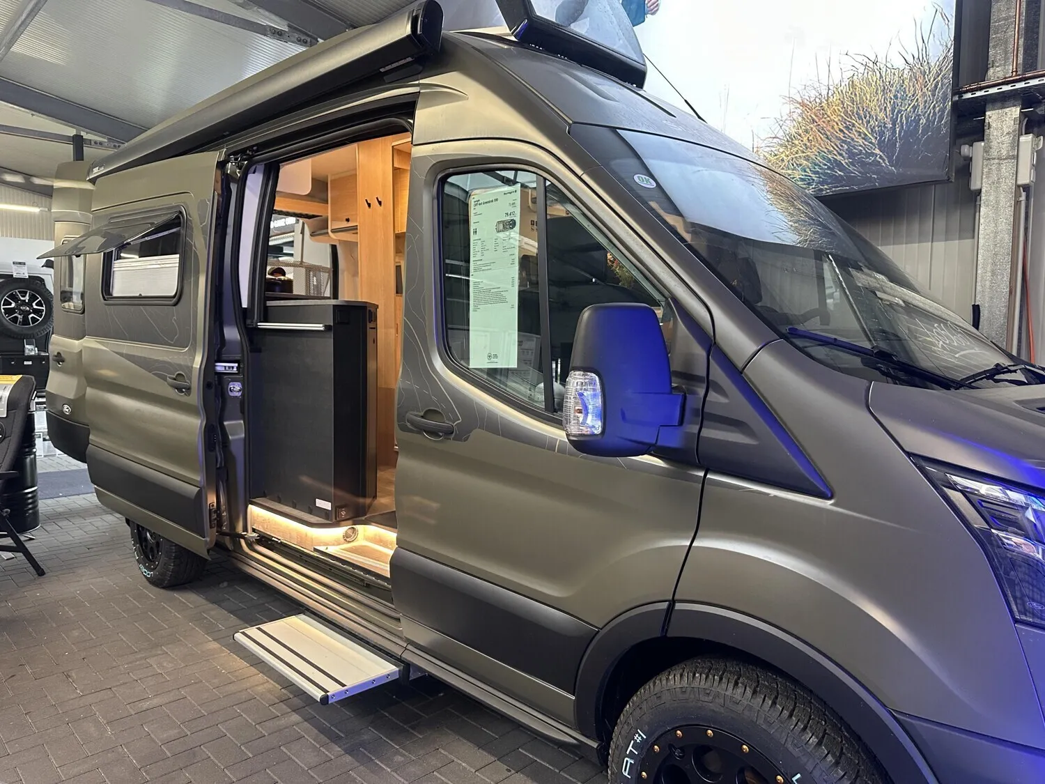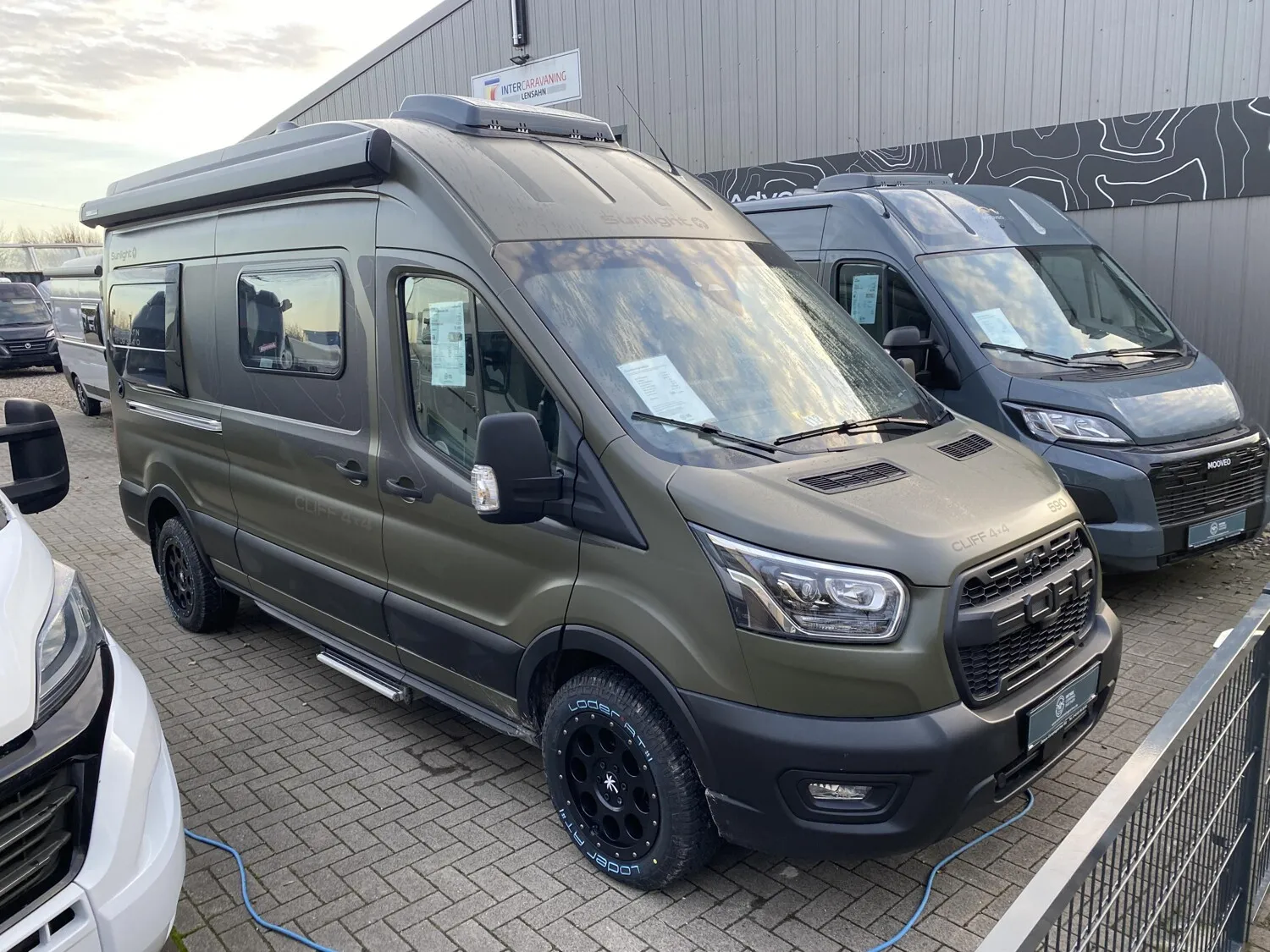 - 4x4 Green Trek Edition Camper Van Ford 2026 (Ford Transit 3.500 kg | 2,0l TDCi | 122 kW | 165 PS | EURO 6 | 6-Gang-Schaltgetriebe | Allradantrieb, Yellow Olive, Beklebung CLIFF 4x4 Green Trek, Wohnwelt Adventure, Seitliche Schlaferweiterung mittels Verbreiterungsbacken im Heck, Rahmenfenster, Beide Hecktüren mit Ausstellfenster (inkl. Rollo), Dachstauschrank Heck umlaufend, Markise 3,5 m (schwarz), Chassis Paket (Klimaanlage inkl. Staub- und Pollenfilter, Stoßfänger lackiert, Nebelscheinwerfer, Scheinwerfer mit statischem Abbiegelicht), Basic Paket (Panoramadachhaube 70 x 50 cm, Duschausstattung, Fenster im Bad, Kleiderstange in der Nasszelle, Breite EinstiegsstufeDrehplatte für Tischerweiterung an der Sitzgruppe), Offroad Paket (17 Zoll Offroadbereifung Delta, Trail Kühlergrill))