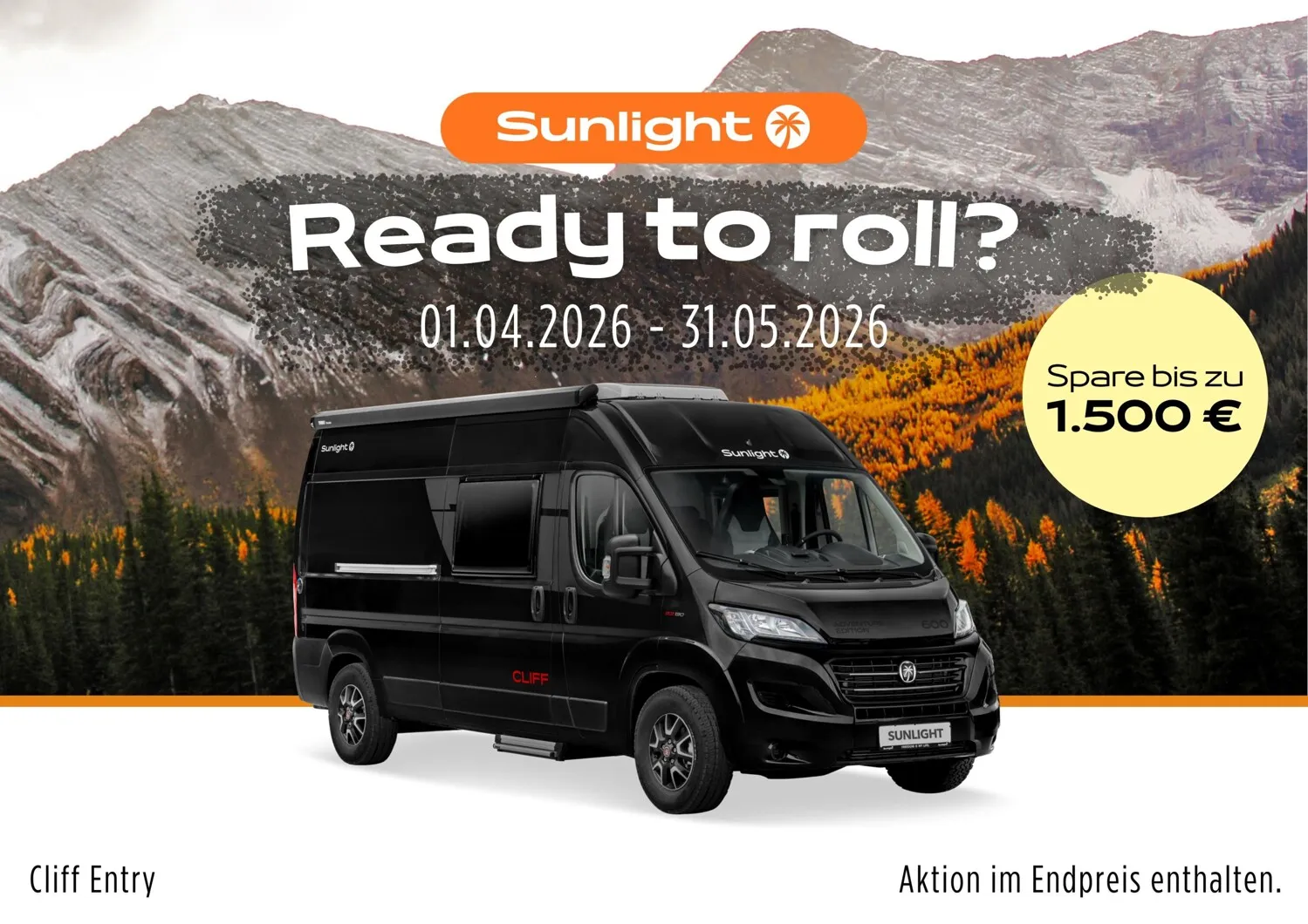 - Aktionsprämie "Ready to Roll" (Der Aktionszeitraum der Ready to Roll Aktion erstreckt sich auf abgeschlossene Kaufverträge vom 15.01.2026 ,bis einschließlich 31.03.2026. Die Aktion ist gültig bei allen teilnehmenden Handelspartnern von SUNLIGHT und gilt ausschließlich für den Kauf von Neufahrzeugen. Der Aktionswert variiert je nach Baureihe und beinhaltet die Mehrwertsteuer. Sunlight behält sich das Recht vor, Aktionsbedingungen jederzeit zu ändern sowie die Aktion vorzeitig zu beenden. Kaufverträge innerhalb der Aktion sind vom Widerruf ausgeschlossen. )