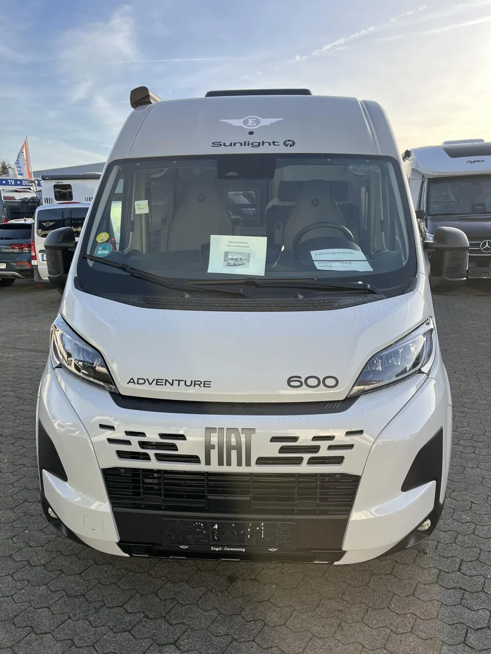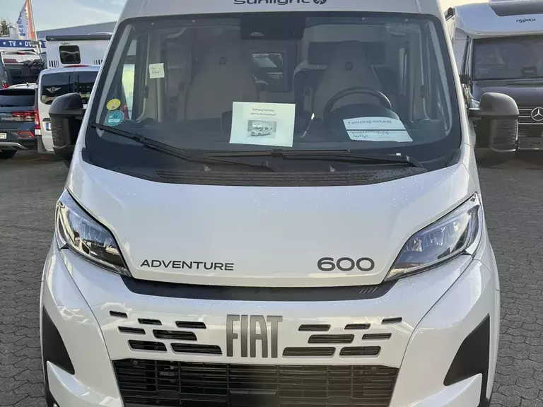 - Adventure Ausstattung 600 (Fiat Ducato 3.500 kg | 2.2 Multijet | 103 kW | 140 PS Euro 6 | 6-Gang-Schaltgetriebe, Fiat Weiß, Adventure Beklebung, Wohnwelt Adventure, Markise (schwarz), Panoramadachhaube 70 x 50 cm, Duschausstattung, Fenster im Bad, Kleiderstange in der Nasszelle, Breite Einstiegsstufe, Drehplatte für Tischerweiterung an der Sitzgruppe, Stoßfänger lackiert, Skid Plate Schwarz, Nebelscheinwerfer, Lenkrad & Schaltknauf in Lederausführung, Luftauslässe mit Applikationen Silber (Techno-Trim), 16" Alufelgen Bi-Color)