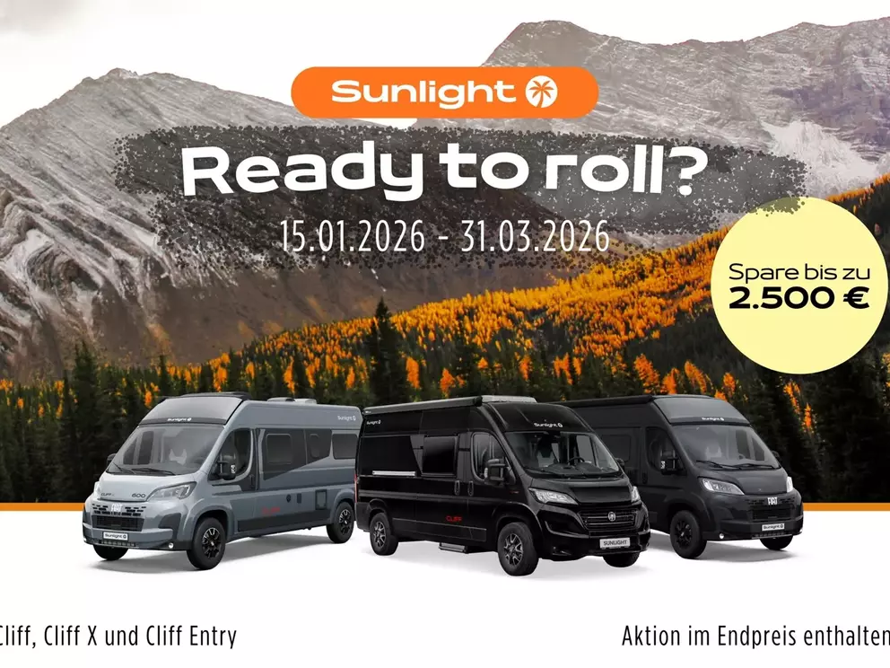 - Aktionsprämie "Ready to Roll" (Der Aktionszeitraum der Ready to Roll Aktion erstreckt sich auf abgeschlossene Kaufverträge vom 15.01.2026 ,bis einschließlich 31.03.2026. Die Aktion ist gültig bei allen teilnehmenden Handelspartnern von SUNLIGHT und gilt ausschließlich für den Kauf von Neufahrzeugen. Der Aktionswert variiert je nach Baureihe und beinhaltet die Mehrwertsteuer. Sunlight behält sich das Recht vor, Aktionsbedingungen jederzeit zu ändern sowie die Aktion vorzeitig zu beenden. Kaufverträge innerhalb der Aktion sind vom Widerruf ausgeschlossen. )