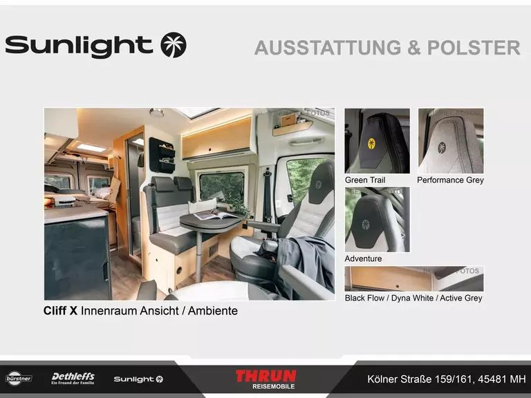 - Cliff X Ausstattung 600 (Fiat Ducato 3.500 kg | 2.2 Multijet | 103 kW | 140 PS Euro 6 | 6-Gang-Schaltgetriebe, Fiat Weiß, Adventure Beklebung, Wohnwelt Adventure, LED Beleuchtung Dachschrank, Dachstauschrank Heck umlaufend, Skyview, Rahmenfenster, Variobad, Markise (schwarz), Panoramadachhaube 70 x 50 cm, Duschausstattung, Fenster im Bad, Kleiderstange in der Nasszelle, Breite Einstiegsstufe, Drehplatte für Tischerweiterung an der Sitzgruppe, Stoßfänger lackiert, Skid Plate Schwarz, Nebelscheinwerfer, Lenkrad & Schaltknauf in Lederausführung, Luftauslässe mit Applikationen Silber (Techno-Trim), 16" Alufelgen Bi-Color)