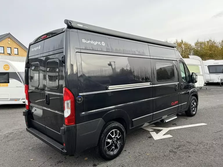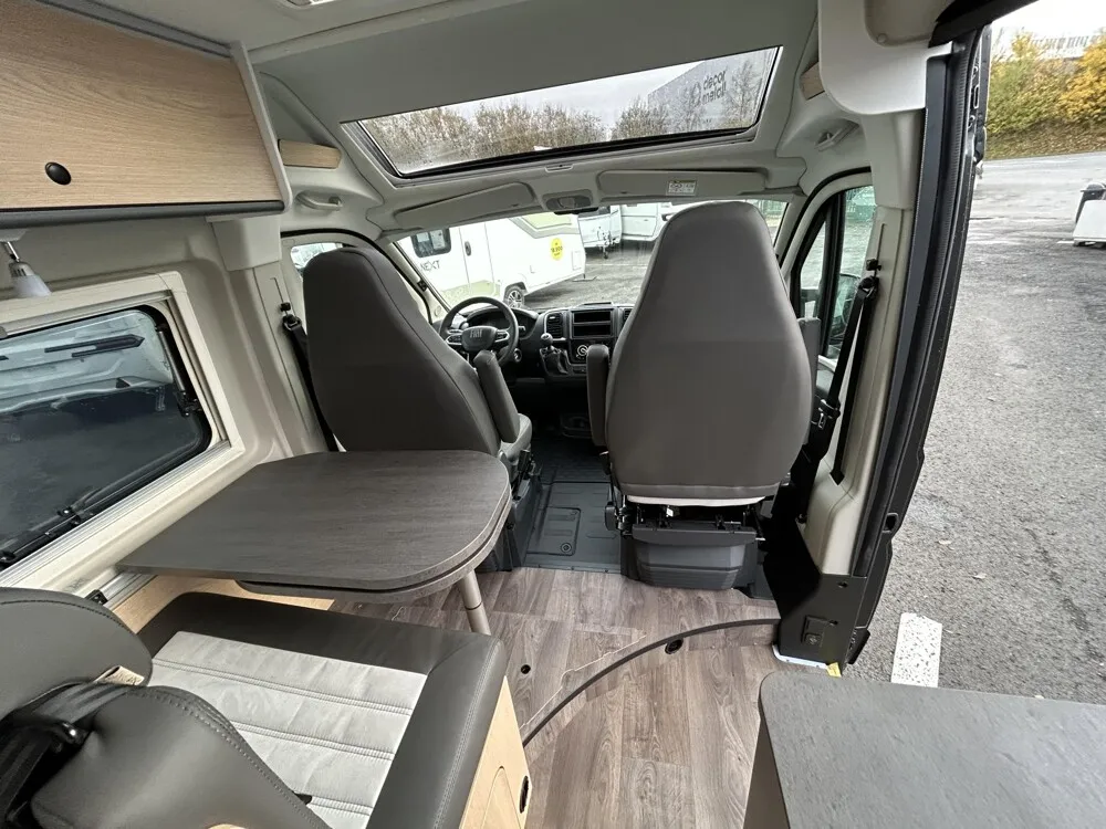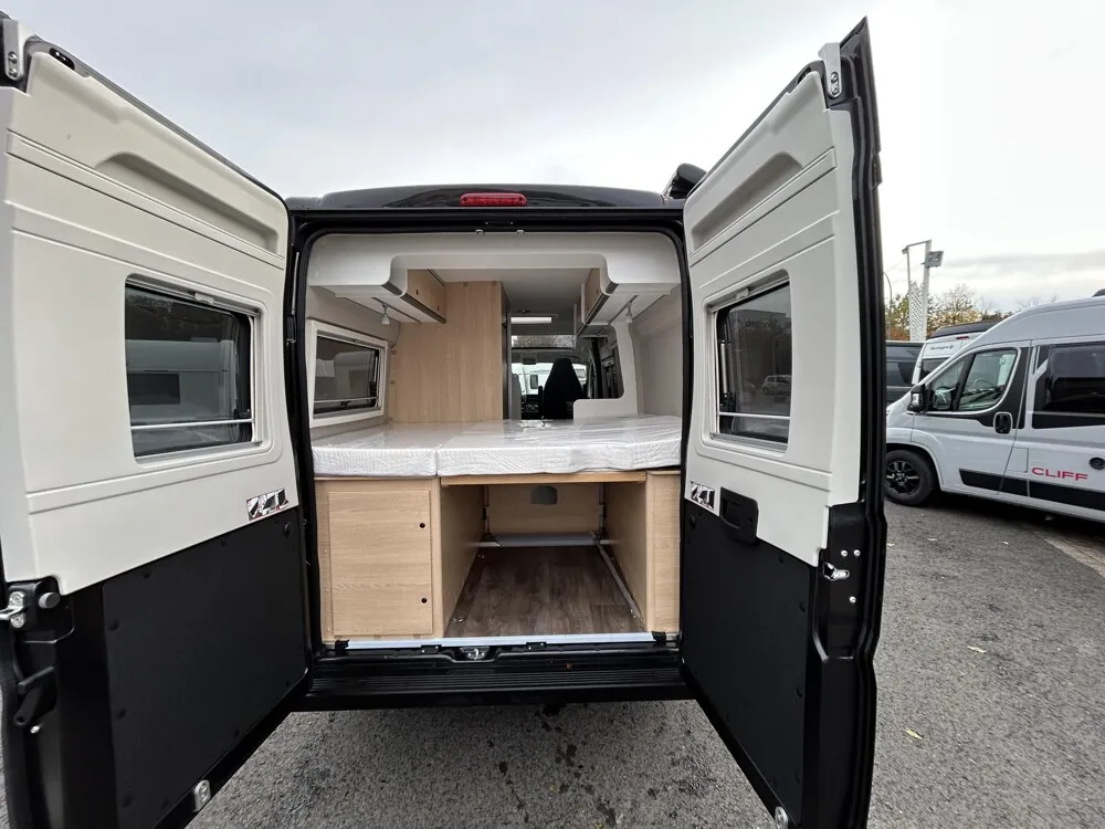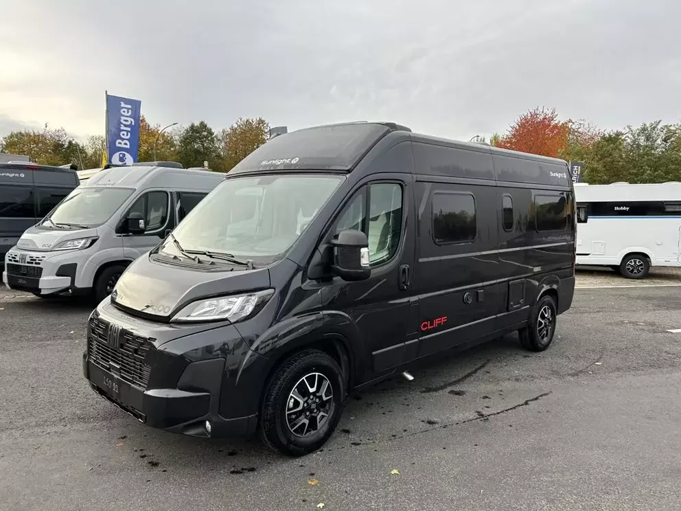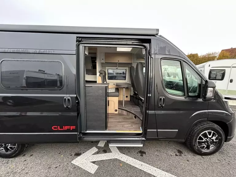 - Cliff X Ausstattung 600 (Fiat Ducato 3.500 kg | 2.2 Multijet | 103 kW | 140 PS Euro 6 | 6-Gang-Schaltgetriebe, Fiat, Adventure Beklebung, Wohnwelt Adventure, LED Beleuchtung Dachschrank, Dachstauschrank Heck umlaufend, Skyview, Rahmenfenster, Variobad, Markise (schwarz), Panoramadachhaube 70 x 50 cm, Duschausstattung, Fenster im Bad, Kleiderstange in der Nasszelle, Breite Einstiegsstufe, Drehplatte für Tischerweiterung an der Sitzgruppe, Stoßfänger lackiert, Skid Plate Schwarz, Nebelscheinwerfer, Lenkrad & Schaltknauf in Lederausführung, Luftauslässe mit Applikationen Silber (Techno-Trim), 16" Alufelgen Bi-Color)