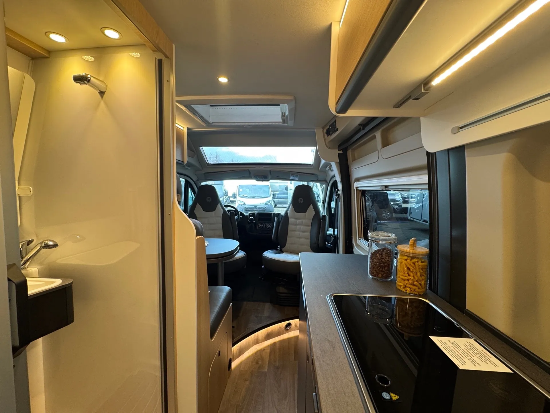 - Cliff X Ausstattung 600 (Adventure Beklebung, Wohnwelt Adventure, LED Beleuchtung Dachschrank, Dachstauschrank Heck umlaufend, Skyview, Rahmenfenster, Variobad, Markise (schwarz), Panoramadachhaube 70 x 50 cm, Duschausstattung, Fenster im Bad, Kleiderstange in der Nasszelle, Breite Einstiegsstufe, Drehplatte für Tischerweiterung an der Sitzgruppe, Stoßfänger lackiert, Skid Plate Schwarz, Nebelscheinwerfer, Lenkrad & Schaltknauf in Lederausführung, Luftauslässe mit Applikationen Silber (Techno-Trim), 16" Alufelgen Bi-Color)