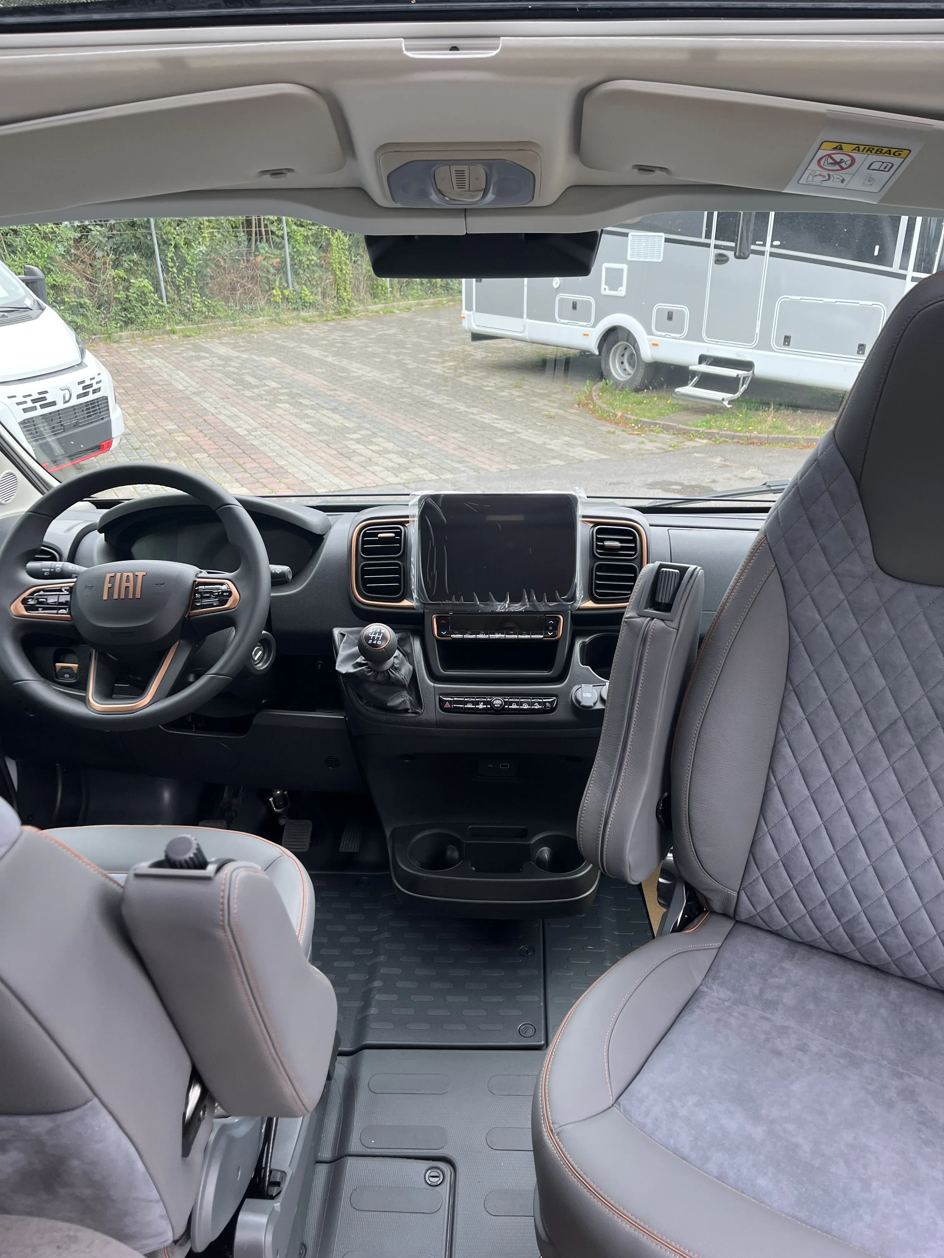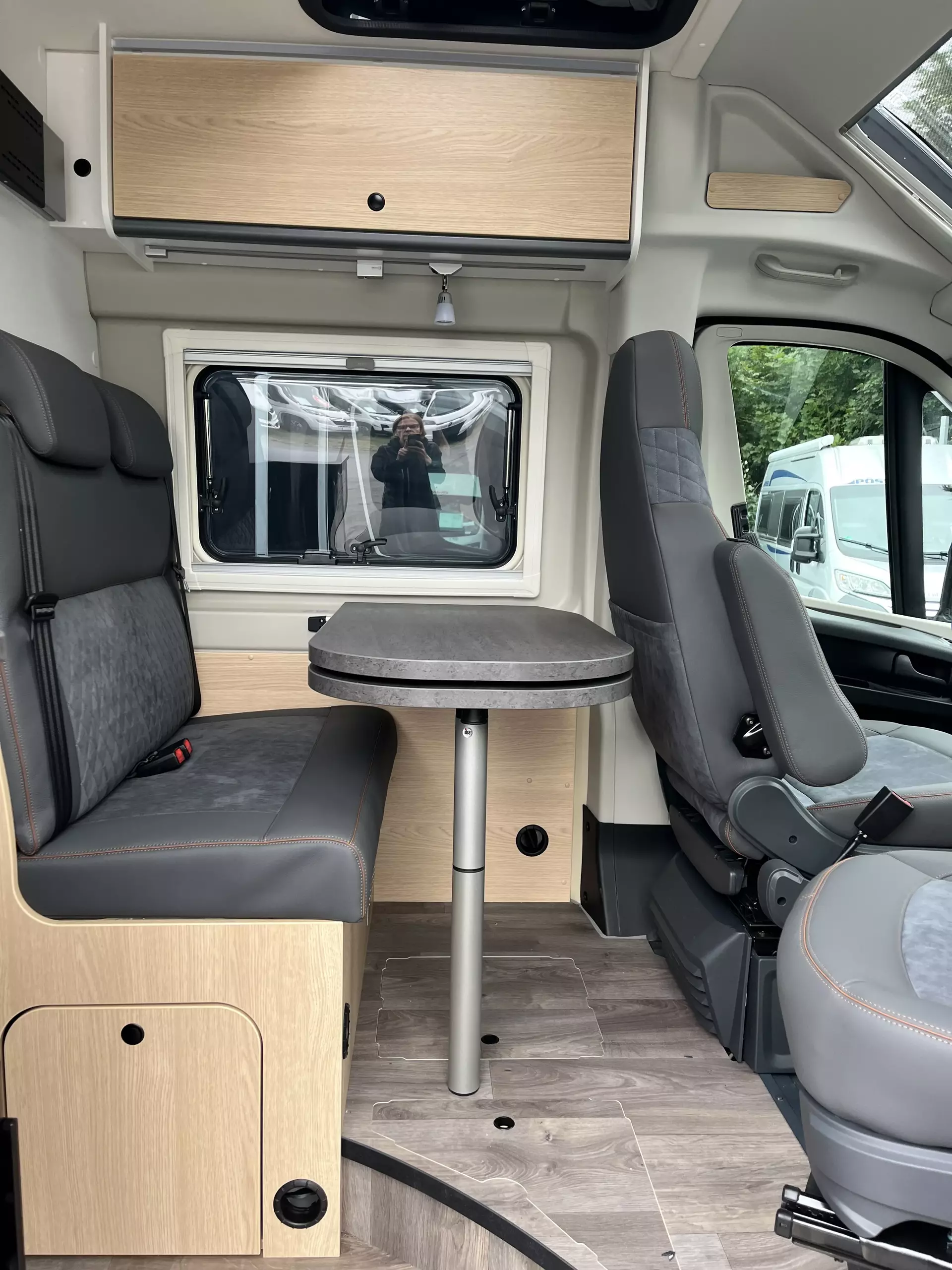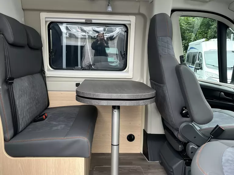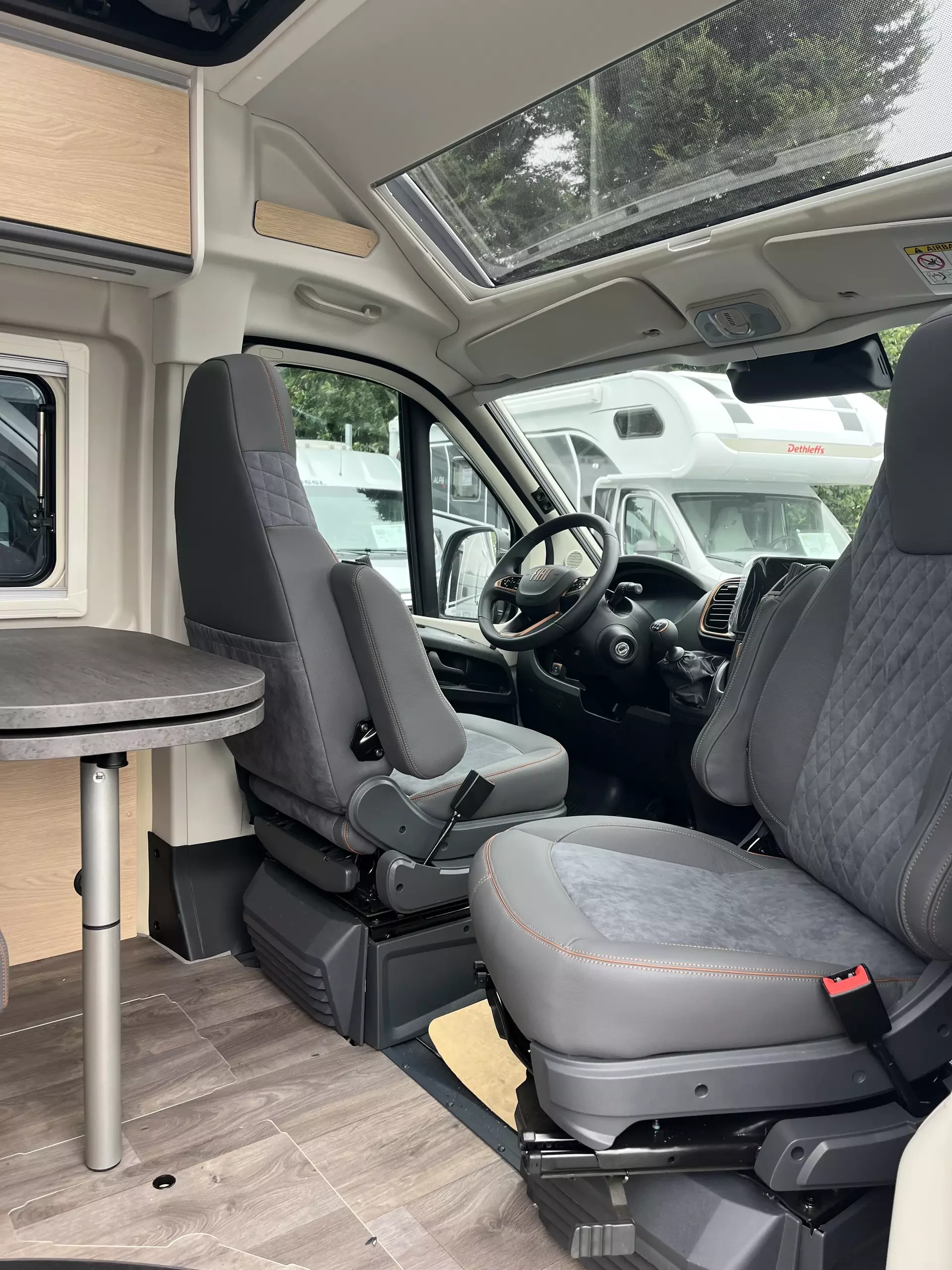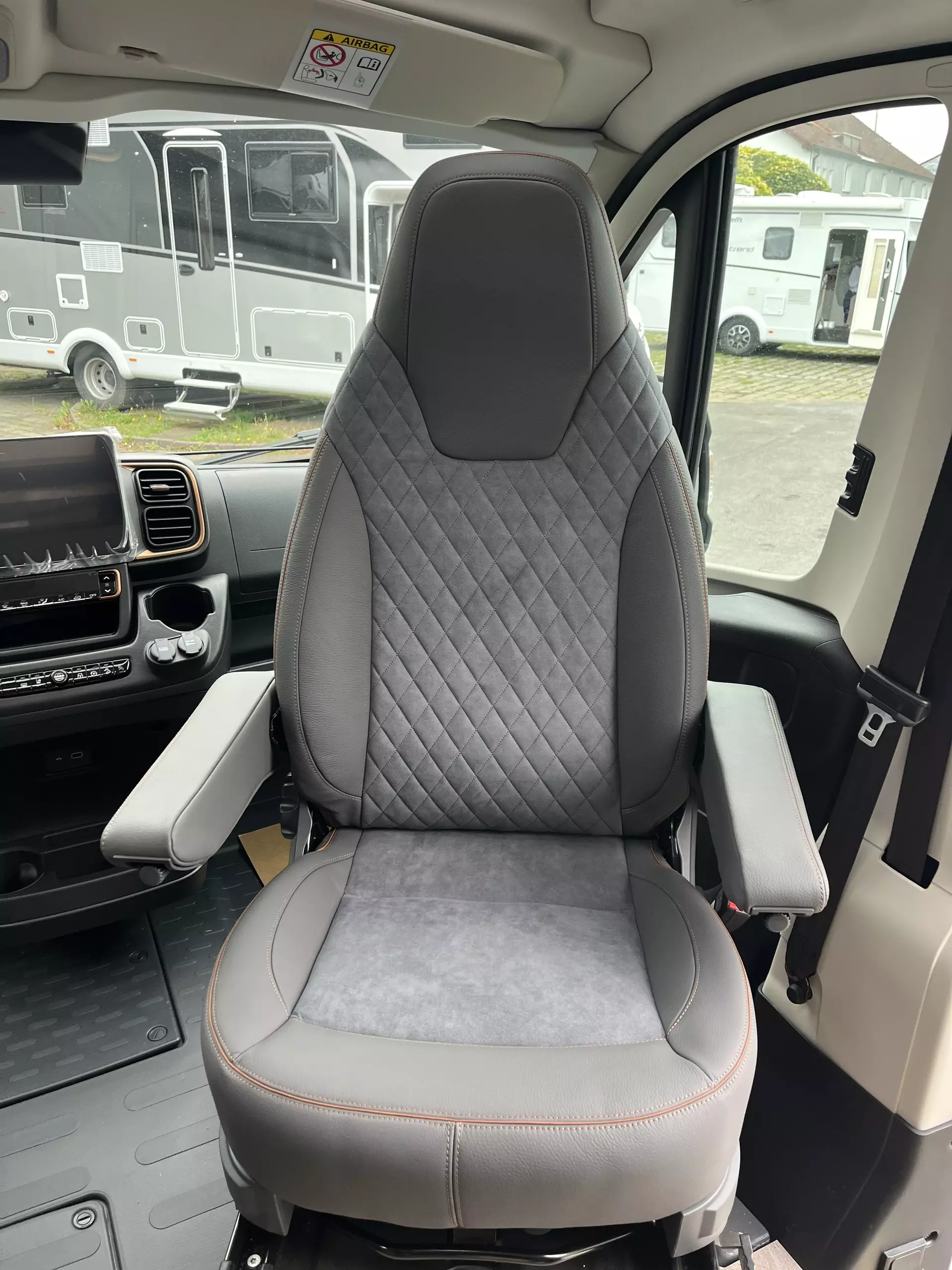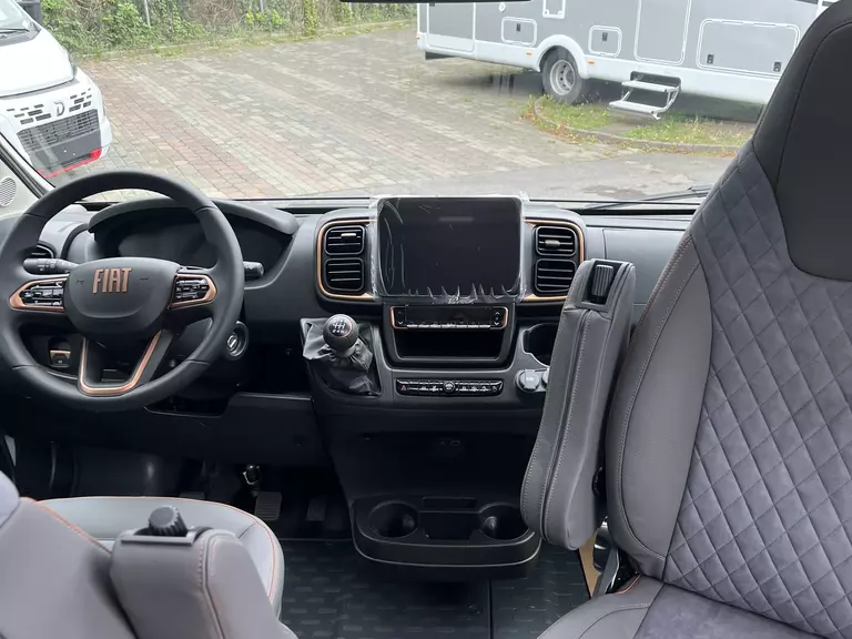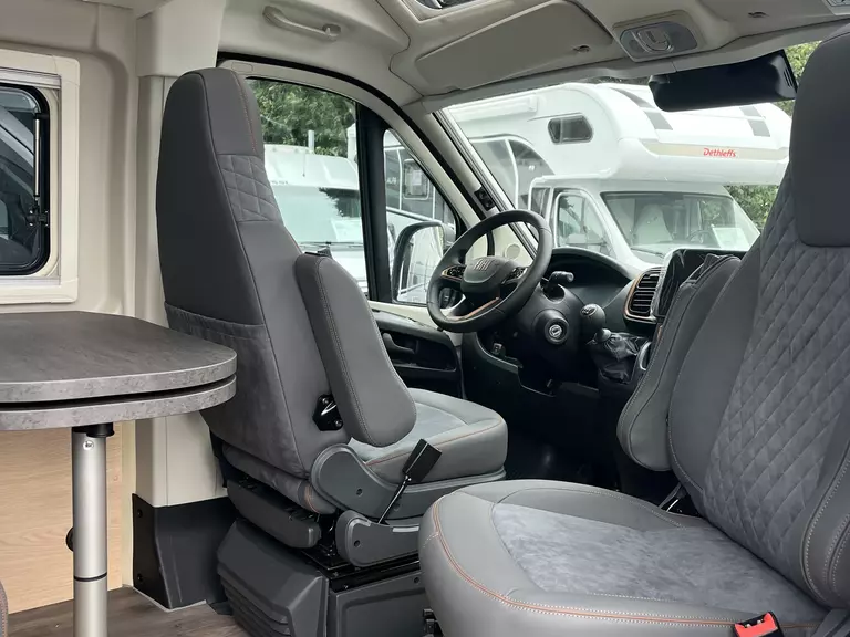 - Fahrer- und Beifahrersitz in Wohnraumstoff mit Doppelarmlehnen (Captain Chair)
