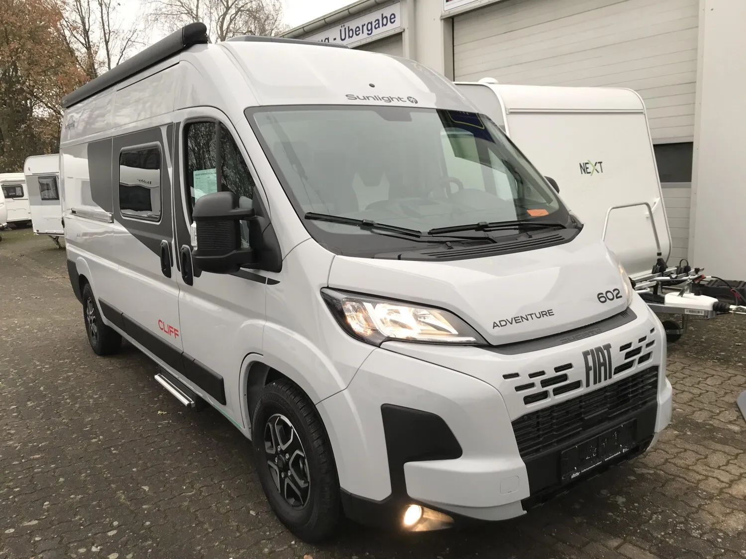 - Adventure Ausstattung 602 (Fiat Ducato 3.500 kg | 2.2 | 103 kW | 140 PS Euro 6 | 6-Gang-Schaltgetriebe, Fiat Weiß, Adventure Beklebung, Wohnwelt Adventure, Markise (schwarz), Panoramadachhaube 70 x 50 cm, Duschausstattung, Fenster im Bad, Kleiderstange in der Nasszelle, Breite Einstiegsstufe, Drehplatte für Tischerweiterung an der Sitzgruppe, Stoßfänger lackiert, Skid Plate Schwarz, Nebelscheinwerfer, Lenkrad & Schaltknauf in Lederausführung, Luftauslässe mit Applikationen Silber (Techno-Trim), 16" Alufelgen Bi-Color)