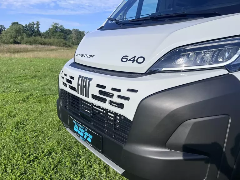 - Editionsausstattung Adventure 640 (Fiat Ducato 3.500 kg | 2.2 Multijet | 103 kW | 140 PS Euro 6 | 6-Gang-Schaltgetriebe, Fiat Weiß, Adventure Beklebung, Wohnwelt Adventure, Markise (schwarz), Panoramadachhaube 70 x 50 cm, Duschausstattung (Brausekopf ausziehbar, Duschvorhang, Führungsschiene, Brausehalter), Fenster im Bad, Kleiderstange in der Nasszelle, Breite Einstiegsstufe, Drehplatte für Tischerweiterung an der Sitzgruppe, Stoßfänger lackiert, Skid Plate Schwarz, Nebelscheinwerfer, Lenkrad & Schaltknauf in Lederausführung, Luftauslässe mit Applikationen Silber (Techno-Trim), 16" Alufelgen Bi-Color)