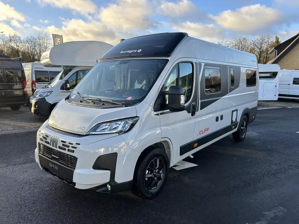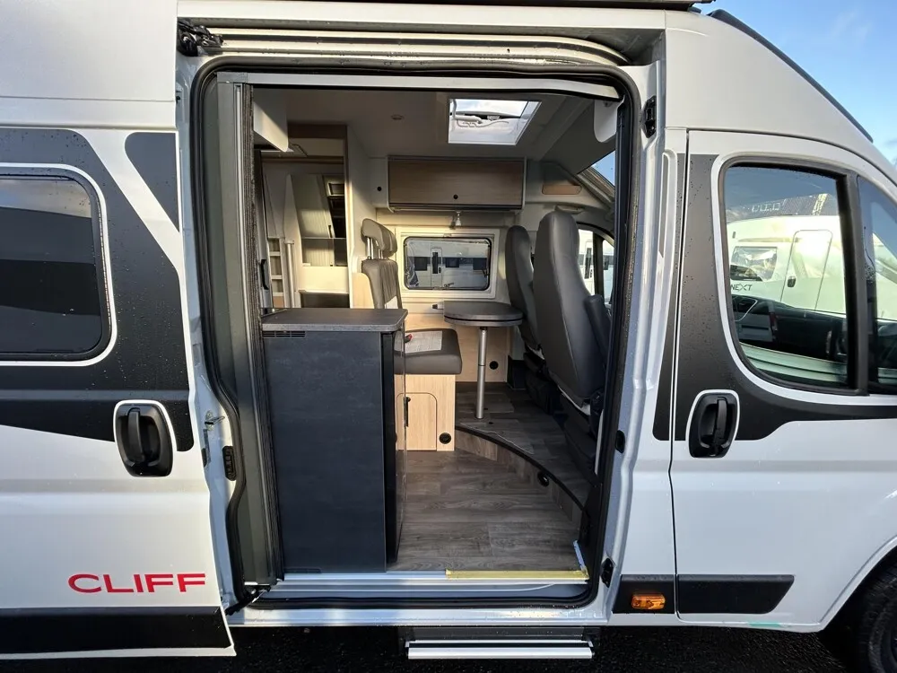 - Cliff X Ausstattung 640 (Fiat Ducato 3.500 kg | 2.2 | 103 kW | 140 PS Euro 6 | 6-Gang-Schaltgetriebe, Fiat Weiß, Adventure Beklebung, Wohnwelt Adventure, LED Beleuchtung Dachschrank, Dachstauschrank Heck umlaufend, Skyview, Rahmenfenster, Variobad, Markise (schwarz), Panoramadachhaube 70 x 50 cm, Duschausstattung, Fenster im Bad, Kleiderstange in der Nasszelle, Breite Einstiegsstufe, Drehplatte für Tischerweiterung an der Sitzgruppe, Stoßfänger lackiert, Skid Plate Schwarz, Nebelscheinwerfer, Lenkrad & Schaltknauf in Lederausführung, Luftauslässe mit Applikationen Silber (Techno-Trim), 16" Alufelgen Bi-Color)