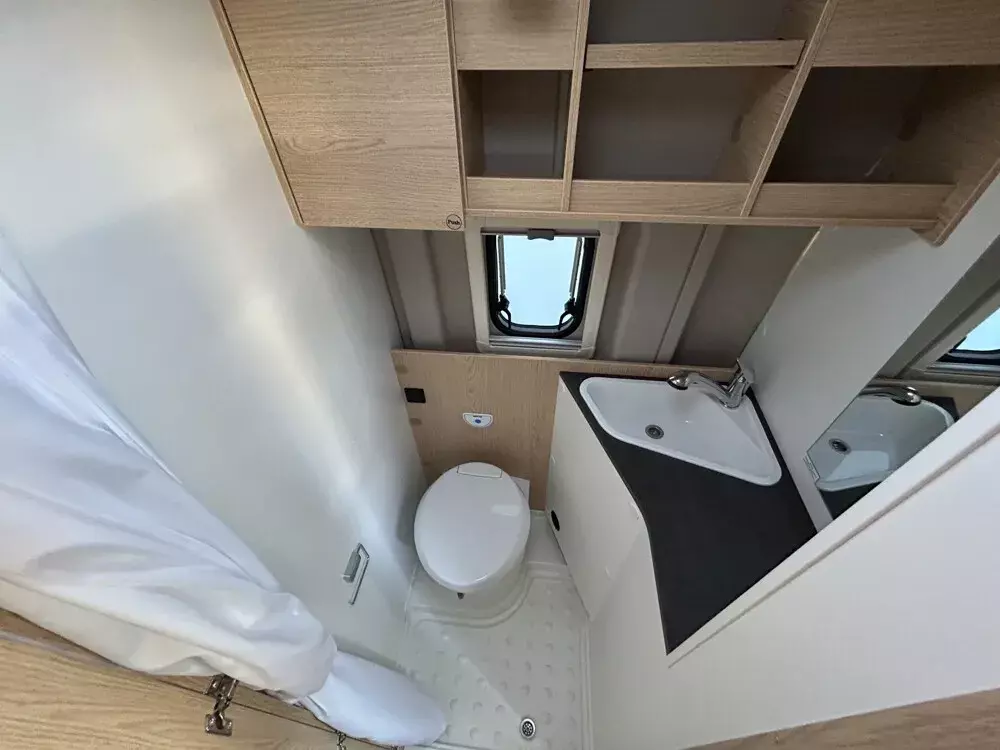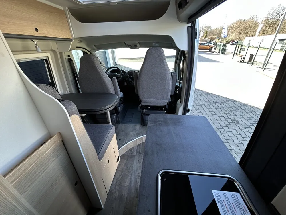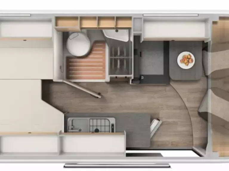 - Basic Paket (Panoramadachhaube 70 x 50 cm, Duschausstattung, Fenster im Bad, Kleiderstange in der Nasszelle, Breite Einstiegsstufe, Drehplatte für Tischerweiterung an der Sitzgruppe)