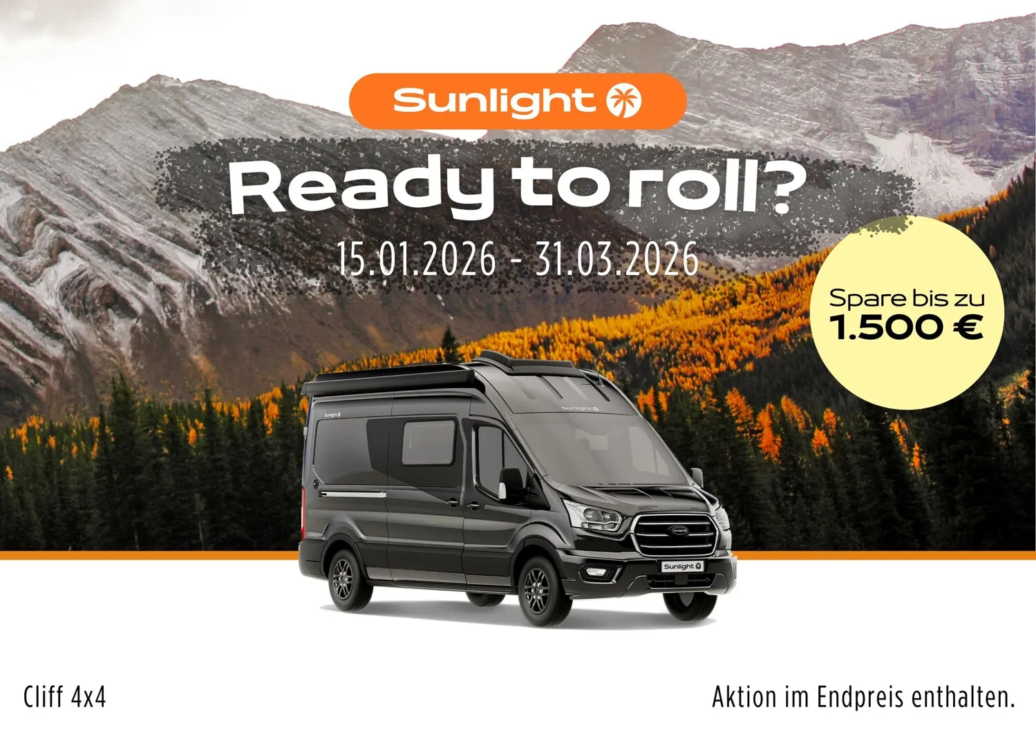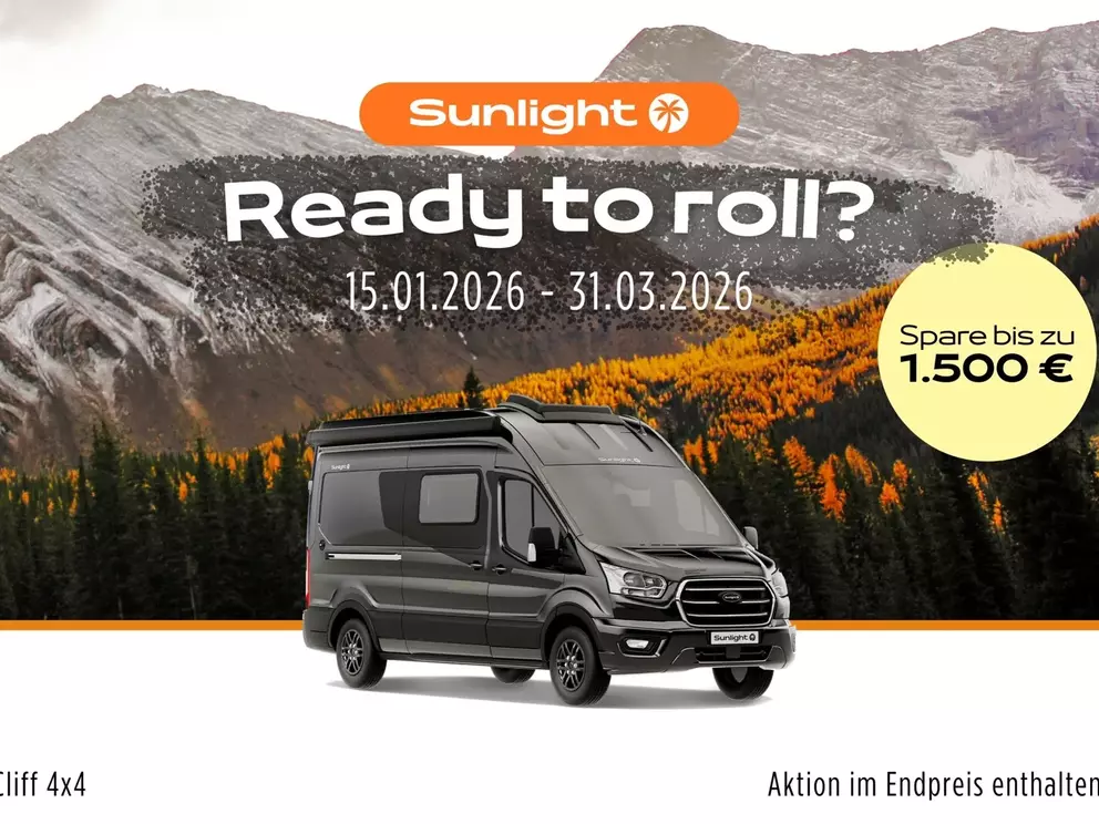 - Aktionsprämie "Ready to Roll" (Der Aktionszeitraum der Ready to Roll Aktion erstreckt sich auf abgeschlossene Kaufverträge vom 15.01.2026 ,bis einschließlich 31.03.2026. Die Aktion ist gültig bei allen teilnehmenden Handelspartnern von SUNLIGHT und gilt ausschließlich für den Kauf von Neufahrzeugen. Der Aktionswert variiert je nach Baureihe und beinhaltet die Mehrwertsteuer. Sunlight behält sich das Recht vor, Aktionsbedingungen jederzeit zu ändern sowie die Aktion vorzeitig zu beenden. Kaufverträge innerhalb der Aktion sind vom Widerruf ausgeschlossen. )