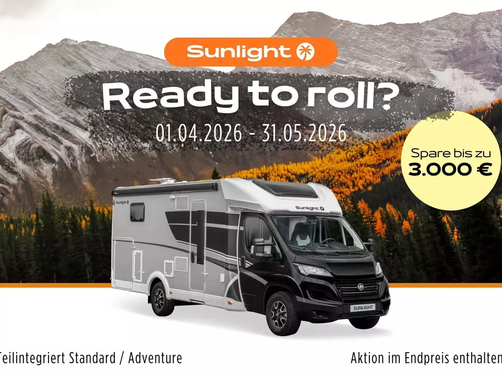 - Aktionsprämie "Ready to Roll" (Der Aktionszeitraum der Ready to Roll Aktion erstreckt sich auf abgeschlossene Kaufverträge vom 15.01.2026 ,bis einschließlich 31.03.2026. Die Aktion ist gültig bei allen teilnehmenden Handelspartnern von SUNLIGHT und gilt ausschließlich für den Kauf von Neufahrzeugen. Der Aktionswert variiert je nach Baureihe und beinhaltet die Mehrwertsteuer. Sunlight behält sich das Recht vor, Aktionsbedingungen jederzeit zu ändern sowie die Aktion vorzeitig zu beenden. Kaufverträge innerhalb der Aktion sind vom Widerruf ausgeschlossen. )