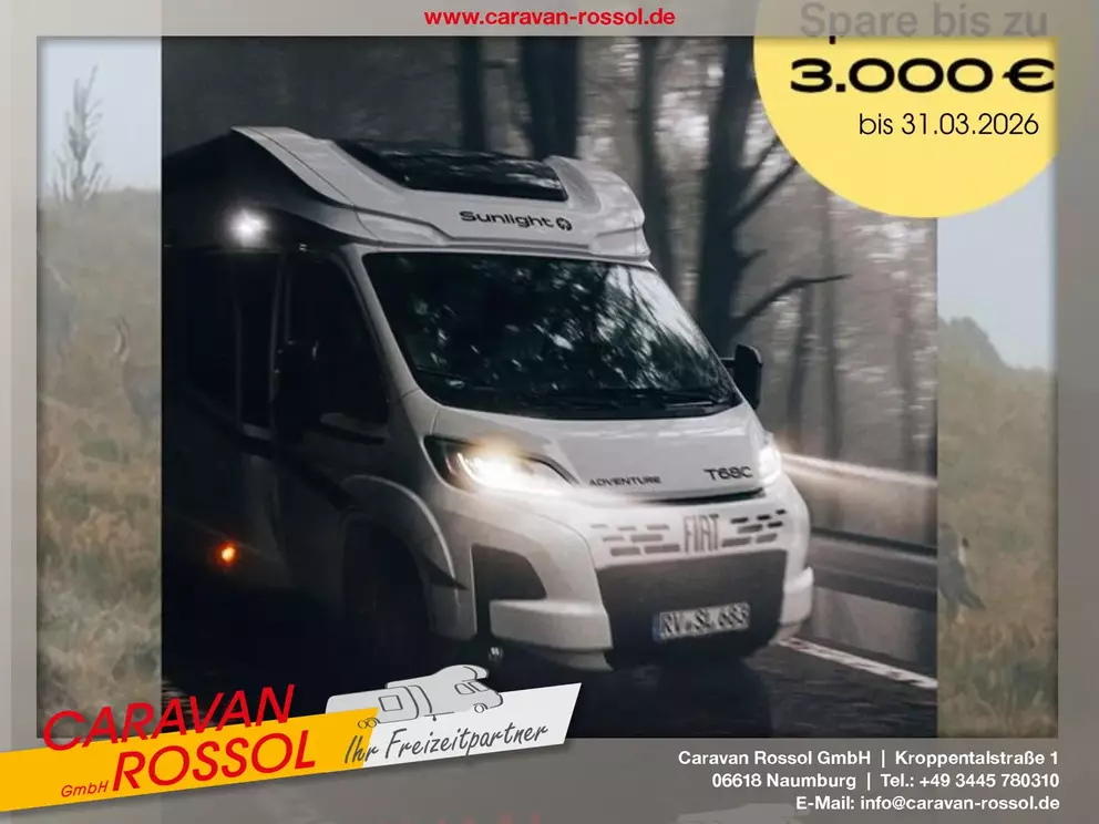 - Aktionsprämie "Keep on Rolling" (Der Aktionszeitraum der "Keep on Rolling" Aktion erstreckt sich auf abgeschlossene Kaufverträge vom 01.04.2026 ,bis einschließlich 31.05.2026. Die Aktion ist gültig bei allen teilnehmenden Handelspartnern von SUNLIGHT und gilt ausschließlich für den Kauf von Neufahrzeugen. Der Aktionswert variiert je nach Baureihe und beinhaltet die Mehrwertsteuer. Sunlight behält sich das Recht vor, Aktionsbedingungen jederzeit zu ändern sowie die Aktion vorzeitig zu beenden. Kaufverträge innerhalb der Aktion sind vom Widerruf ausgeschlossen.)